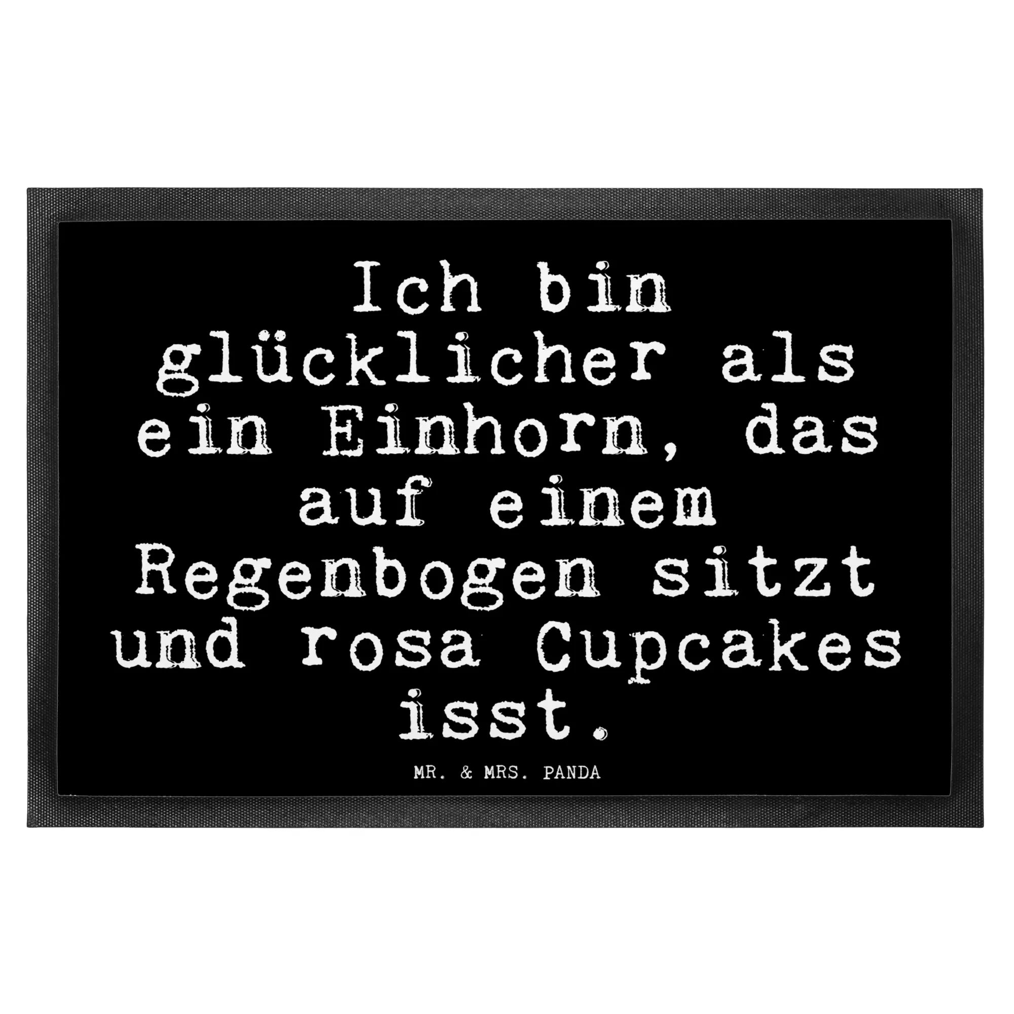 Die Fußmatte "Ich bin glücklicher als ein Einhorn, das auf einem Regenbogen sitzt und rosa Cupcakes isst." von Mr. & Mrs. Panda ist das perfekte Geschenk für all jene, die ein fröhliches und einladendes Zuhause schaffen möchten. Diese liebevoll gestaltete Fußmatte ist nicht nur ein echter Blickfang, sondern auch ein praktischer Schmutzfänger, der den Dreck von draußen fernhält.