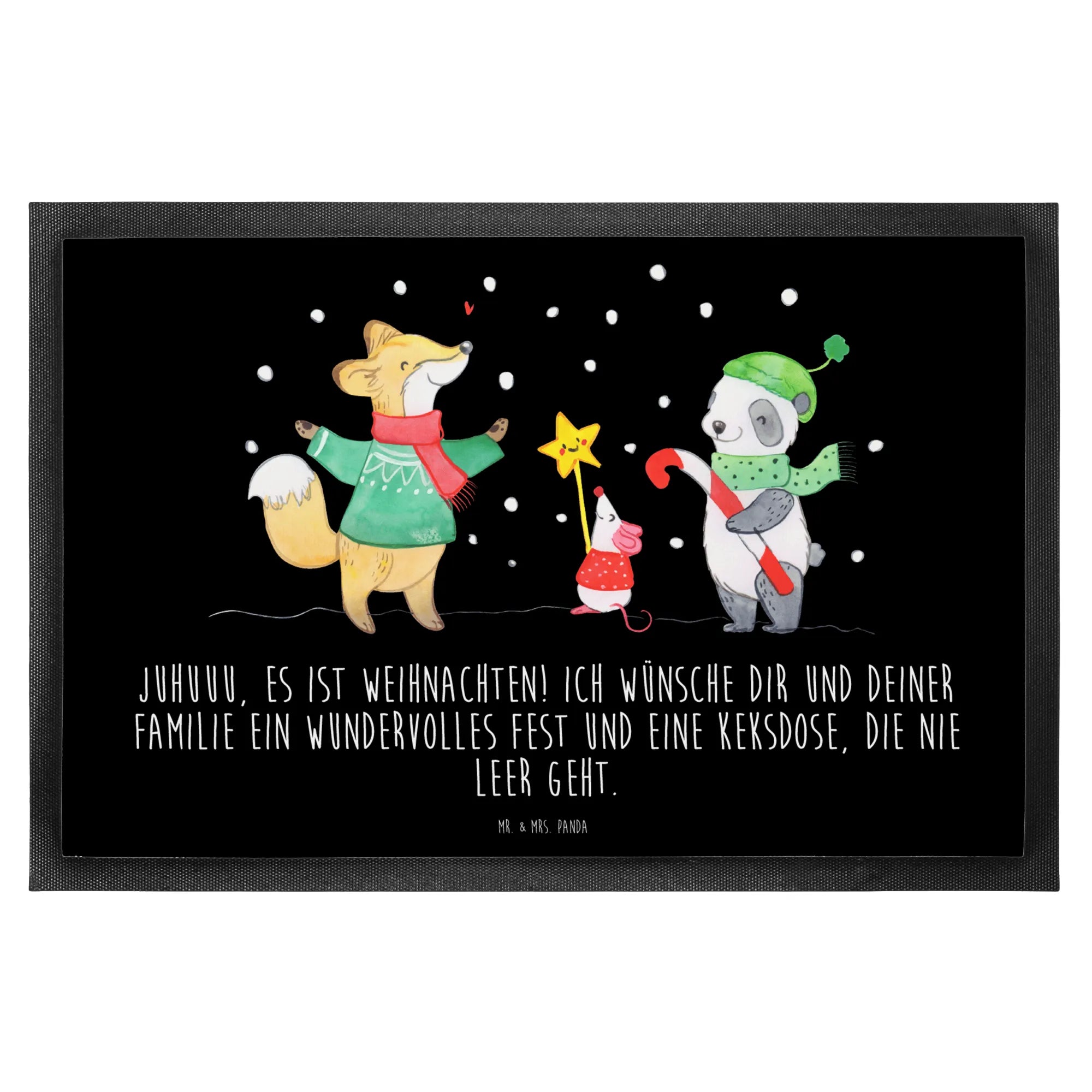 Die Mr. & Mrs. Panda Fußmatte 'Winter Weihnachtsfreude' ist der perfekte Begleiter für die festliche Jahreszeit! Mit ihrem fröhlichen Motiv, das einen Fuchs, eine Maus und einen Panda in Schals und Mützen zeigt, die im Schnee stehen, zaubert sie jedem ein Lächeln ins Gesicht. Der eingängige Slogan 'Juhuuu, es ist Weihnachten! Ich wünsche dir und deiner Familie ein wundervolles Fest und eine Keksdose, die nie leer geht.' macht diese Fußmatte zu einem besonderen Highlight an deiner Haustür.
