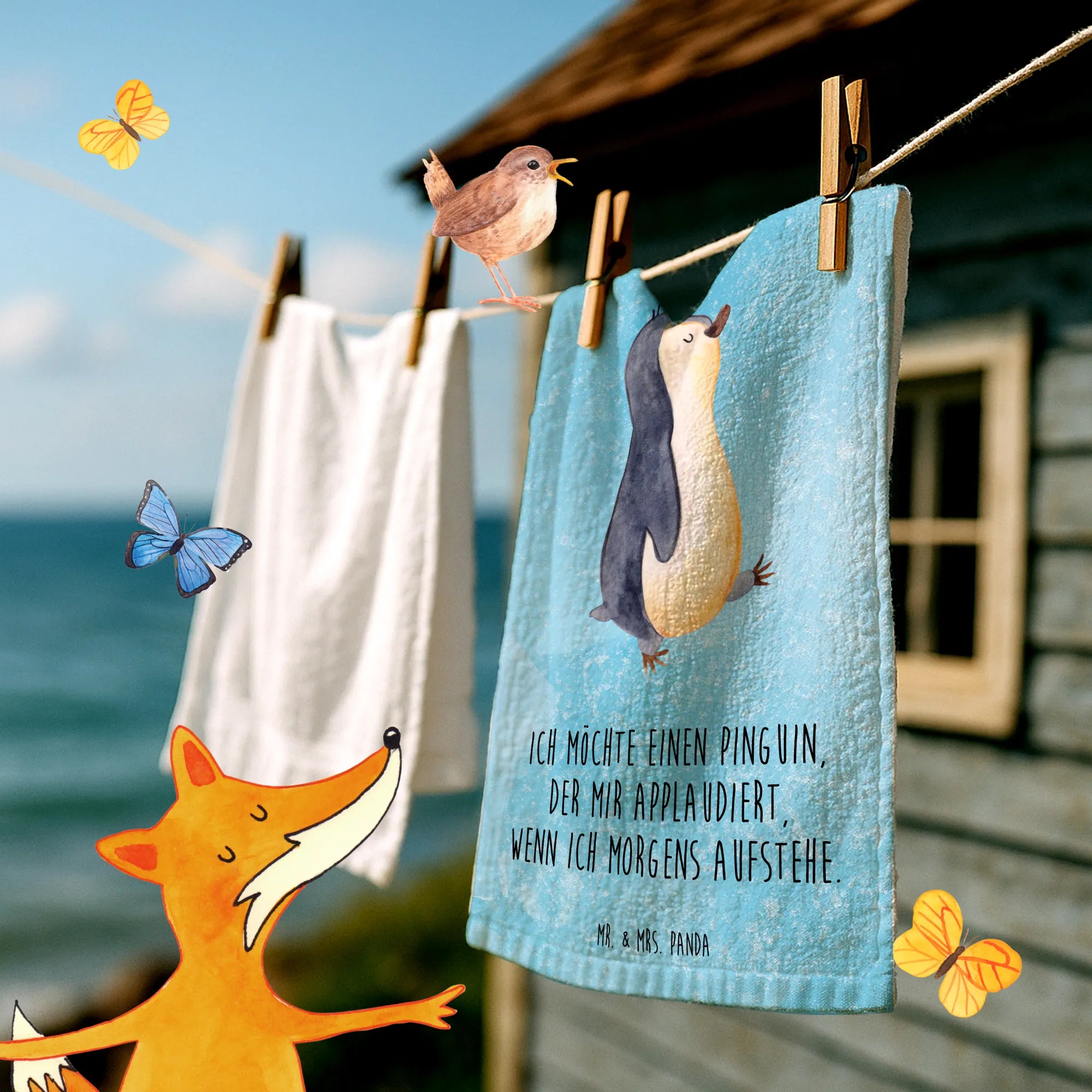 Dieses zauberhafte Gästehandtuch bringt Charme und gute Laune ins Gäste-WC, Badezimmer oder Gästezimmer. Der fröhliche Pinguin, versehen mit dem Spruch „Ich möchte einen Pinguin, der mir applaudiert, wenn ich morgens aufstehe.“, ist ein echter Stimmungsmacher und sorgt für Lächeln bei Groß und Klein.