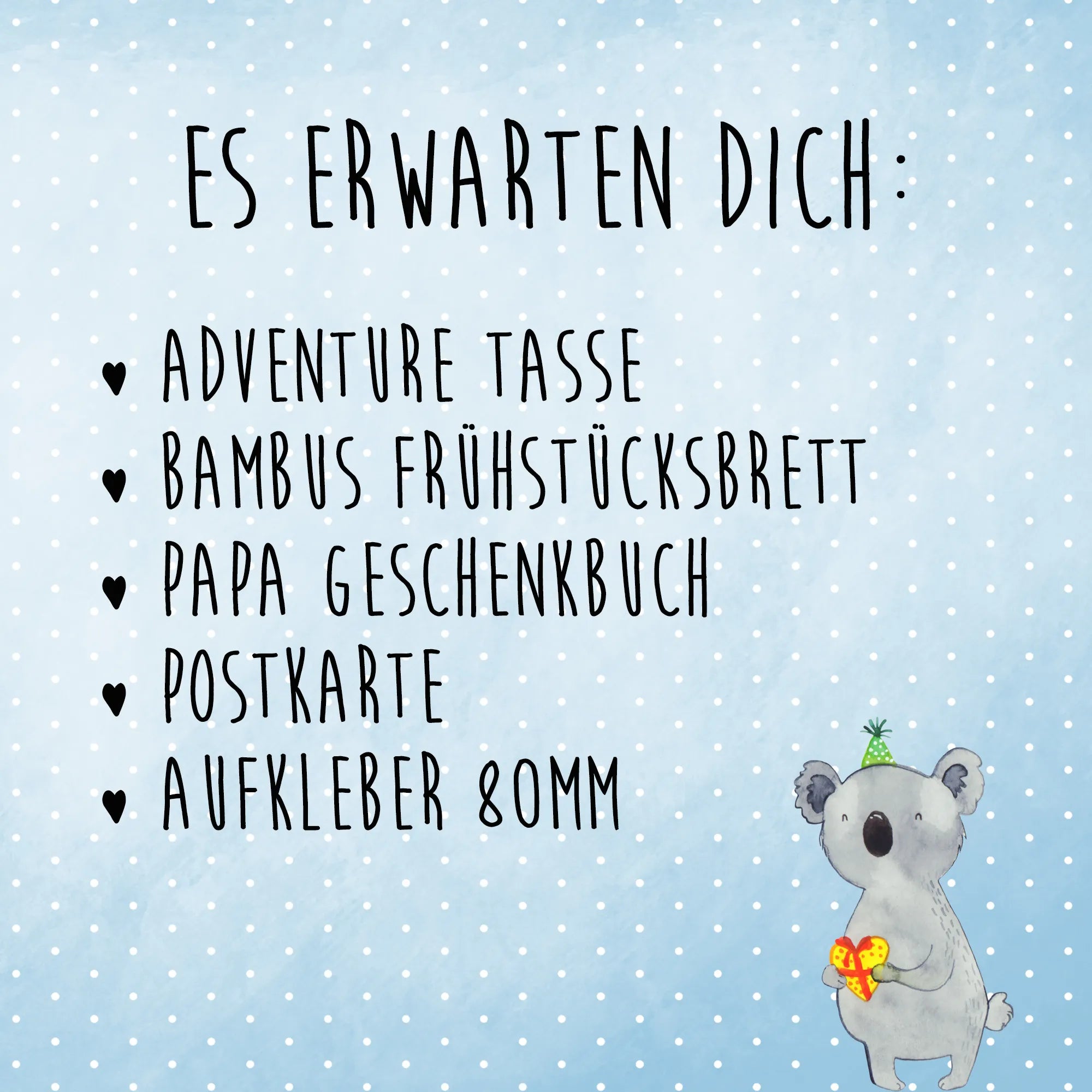 In der Geschenk Box findest du alles, was das Herz eines Papis begehrt. Mit viel Liebe und Kreativität zusammengestellt, enthält sie eine Auswahl an niedlichen und praktischen Geschenken, die Papa garantiert ein Lächeln ins Gesicht zaubern werden. Die Designs sind mit hübschen, handgezeichneten Motiven geschmückt, die von Mrs. Panda selbst entworfen wurden. Jedes Teil ist ein Ausdruck von Liebe und Zusammenhalt in der Familie - genau das, was man seinem Vater wünschen möchte!