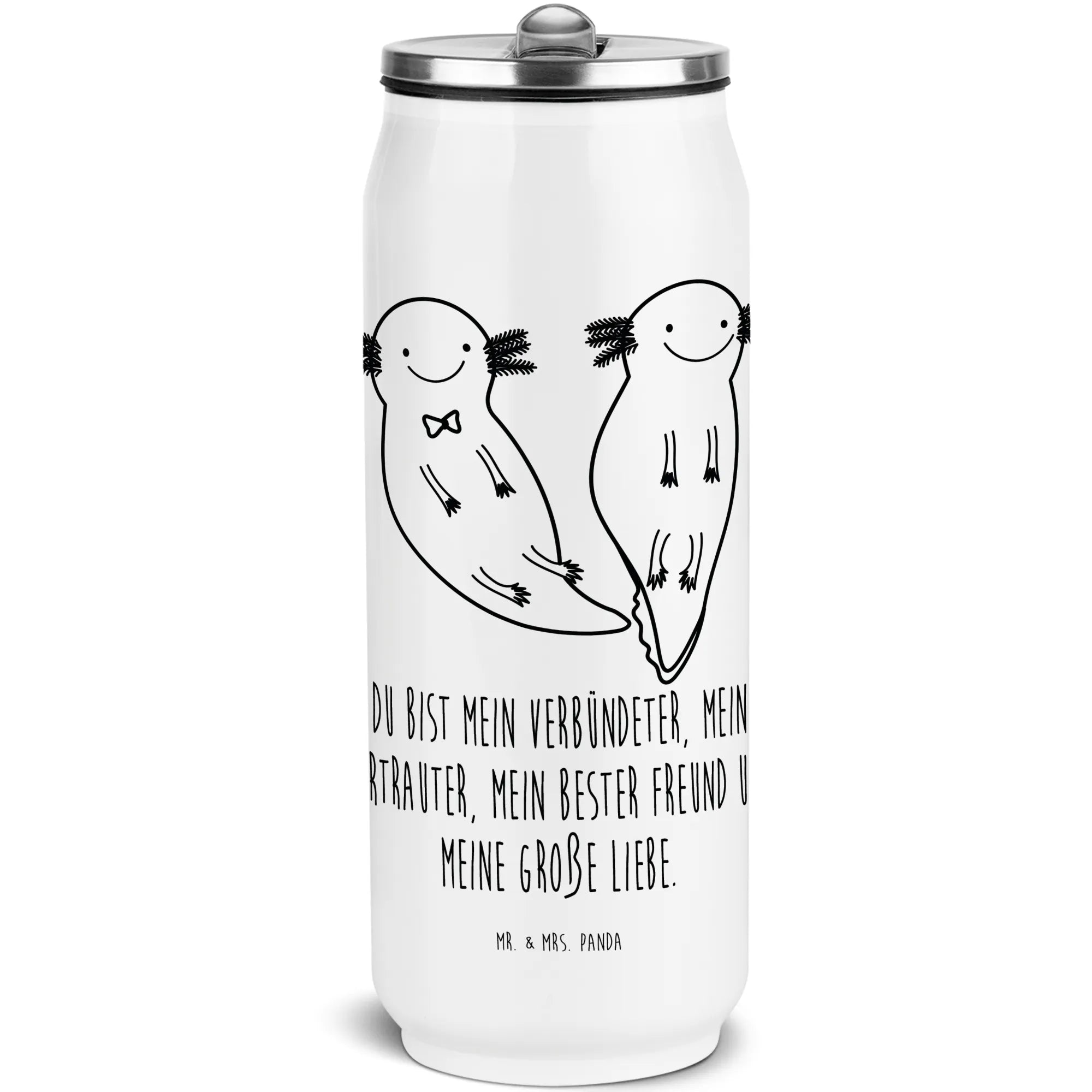 Entdecke die bezaubernde Getränkedosen Trinkflasche Axolotl Axel+Lotte von Mr. & Mrs. Panda! Diese einzigartige Edelstahlflasche hat nicht nur ein süßes Design, sondern ist auch extrem praktisch für deinen Alltag. Mit einer Füllmenge von 420 ml bietet sie genug Platz für dein Lieblingsgetränk, ob heiß oder kalt. Die doppelwandige Isolierung hält deine Getränke lange auf der gewünschten Temperatur und macht sie ideal für Campingausflüge, Wanderungen oder einfach für die Schule und das Büro.