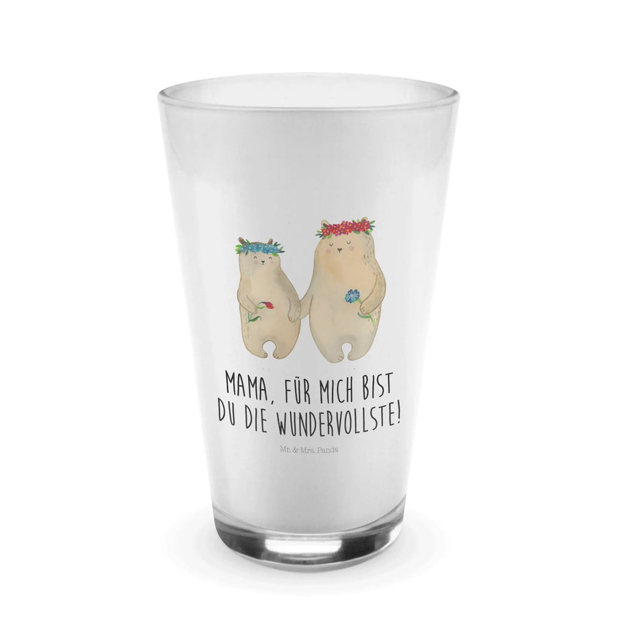 Transparent und elegant, passt es perfekt zu Latte Macchiato, Cappuccino oder auch als Longdrinkglas. Die edle, matte Oberfläche und das liebevolle Design bringen einen Hauch von Freude in jeden Schluck. Das Motiv zeigt zwei süße Bären, die im bunten Blumenkranz lächeln und die Botschaft „Mama, für mich bist du die Wundervollste!“ überbringen.