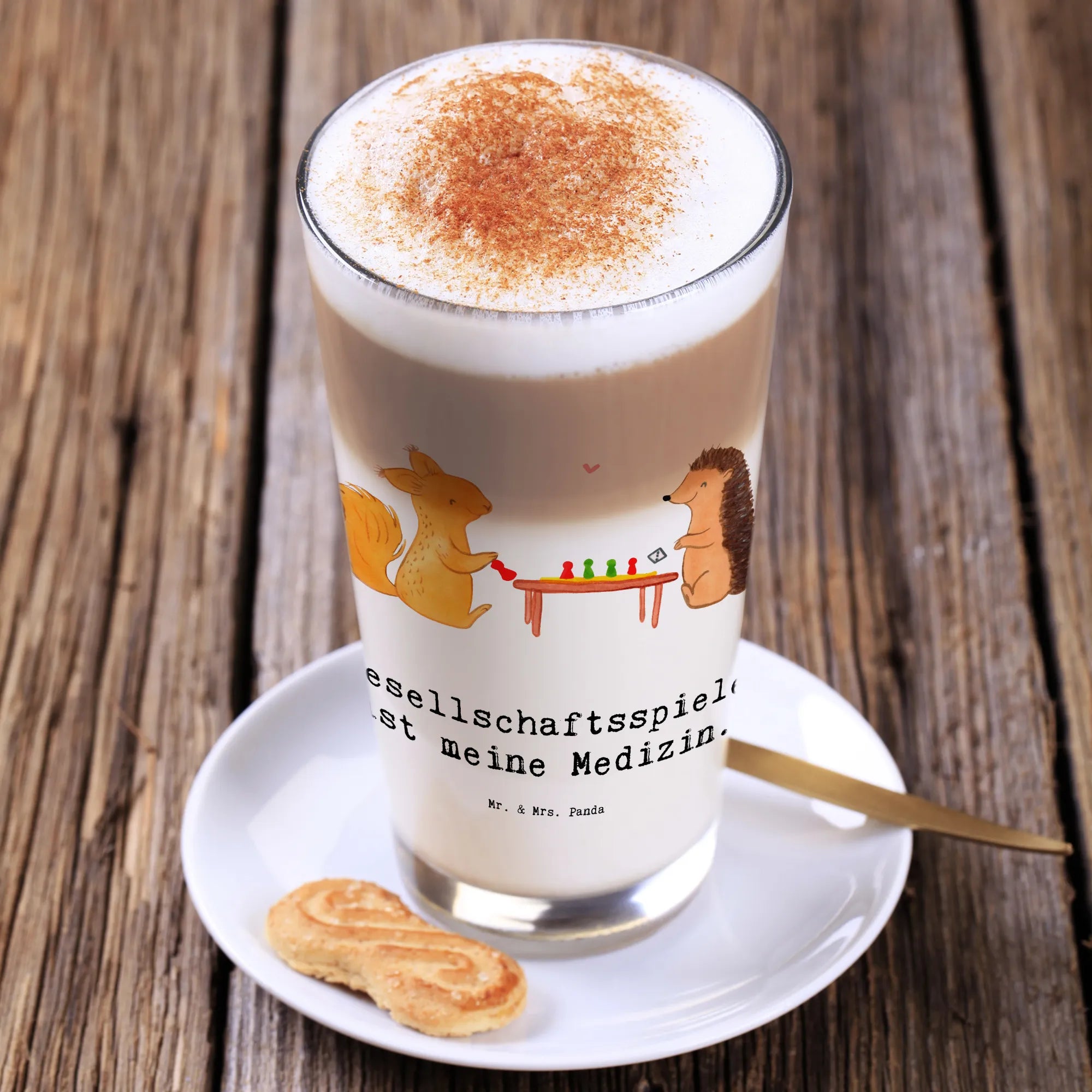 Das wunderschöne Cappuccino Glas von Mr. & Mrs. Panda mit dem niedlichen Eichhörnchen-Motiv ist das perfekte Geschenk für alle Gesellschaftsspiel-Liebhaber. Es verbindet verspielte Kunst mit einem praktischen Trinkgefäß, ideal für Deinen nächsten Spieleabend! Die Botschaft „Gesellschaftsspiele ist meine Medizin“ spricht insbesondere die Fans von Brett- und Kartenspielen an, die ihre Leidenschaft gerne mit anderen teilen.