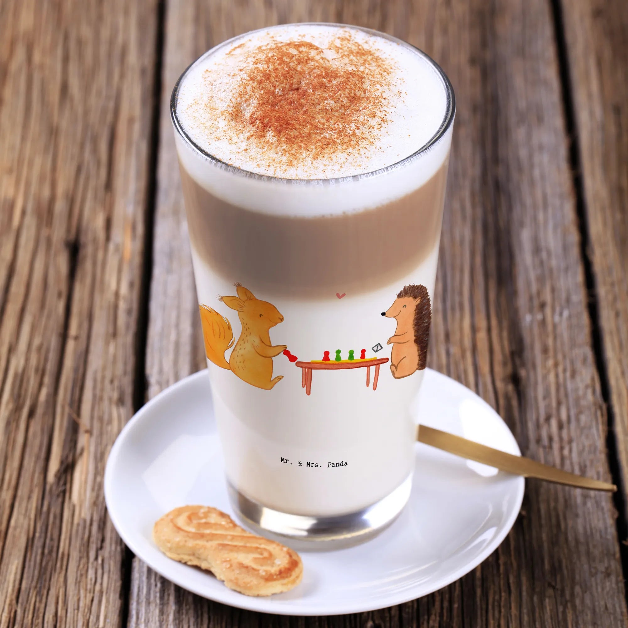 Das niedliche Cappuccino Glas mit dem Motiv "Eichhörnchen Gesellschaftsspiele Medizin" von Mr. & Mrs. Panda ist das perfekte Geschenk für alle, die das gesellige Beisammensein lieben.