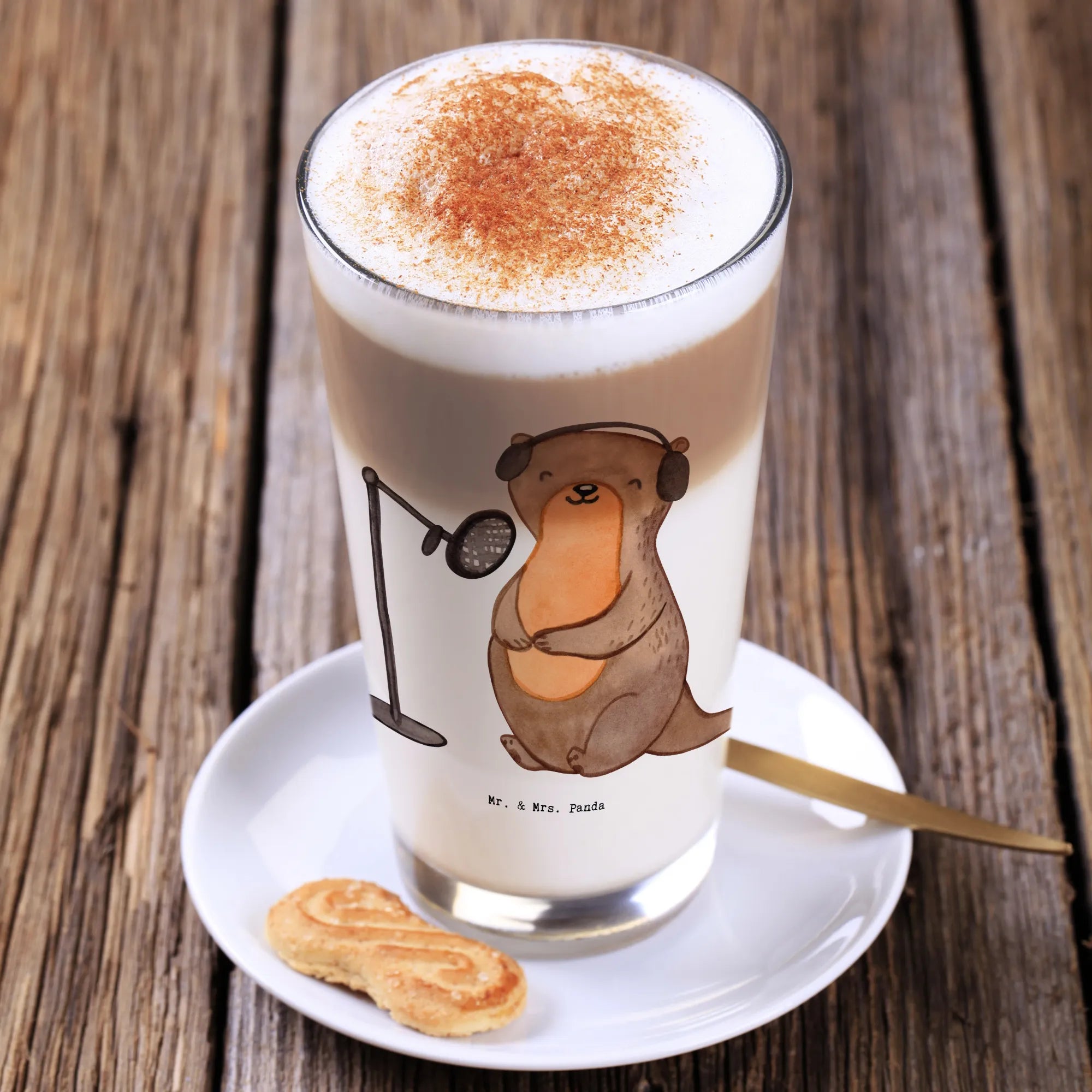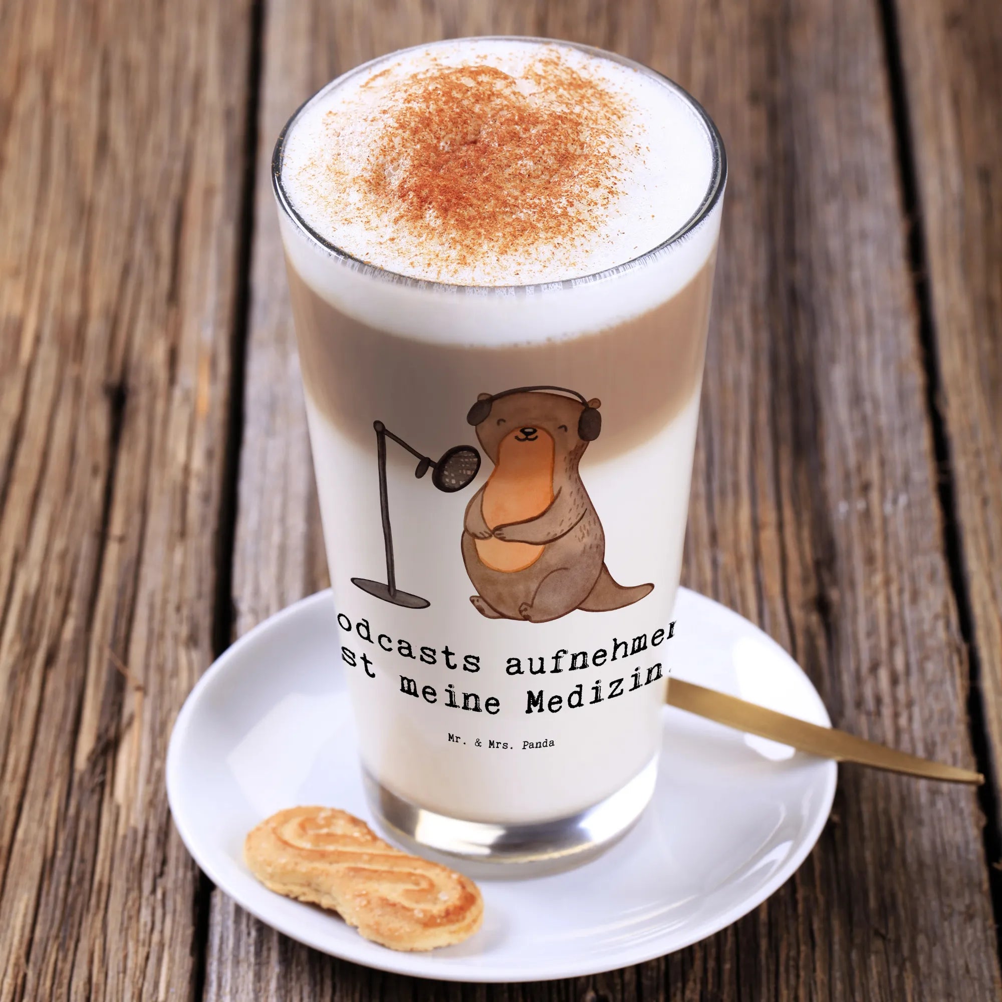 Das edle und wunderschöne Cappuccino Glas von Mr. & Mrs. Panda ist das perfekte Geschenk für alle Podcasterinnen und Podcaster! Mit dem niedlichen Motiv des Otters, der mit seinem Podcast Equipment am Mikrofon sitzt, bringt dieses Glas nicht nur Freude, sondern auch Funktionalität. 🍵