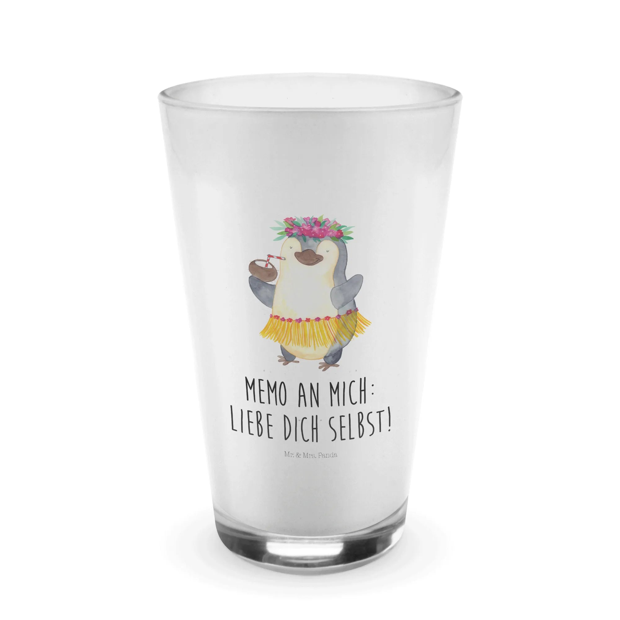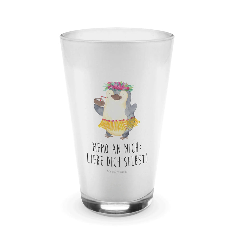 Das wundervolle Cappuccino Glas mit dem fröhlichen Pinguin Kokosnuss Motiv aus der Pinguin-Kollektion von Mr. & Mrs. Panda ist das perfekte Geschenk für jeden, der Urlaubsstimmung und gute Laune liebt.