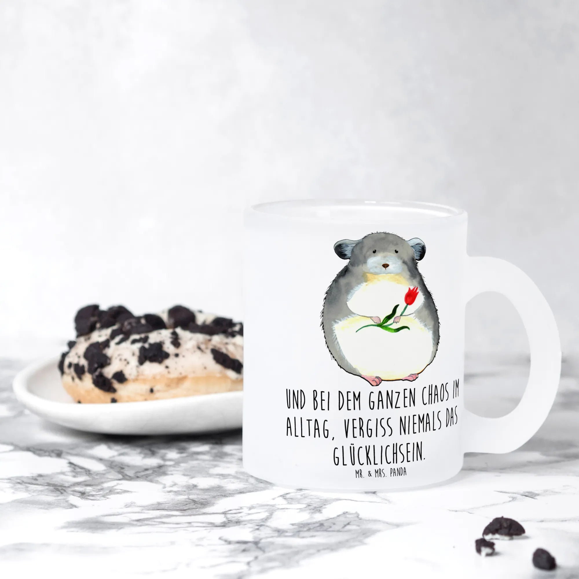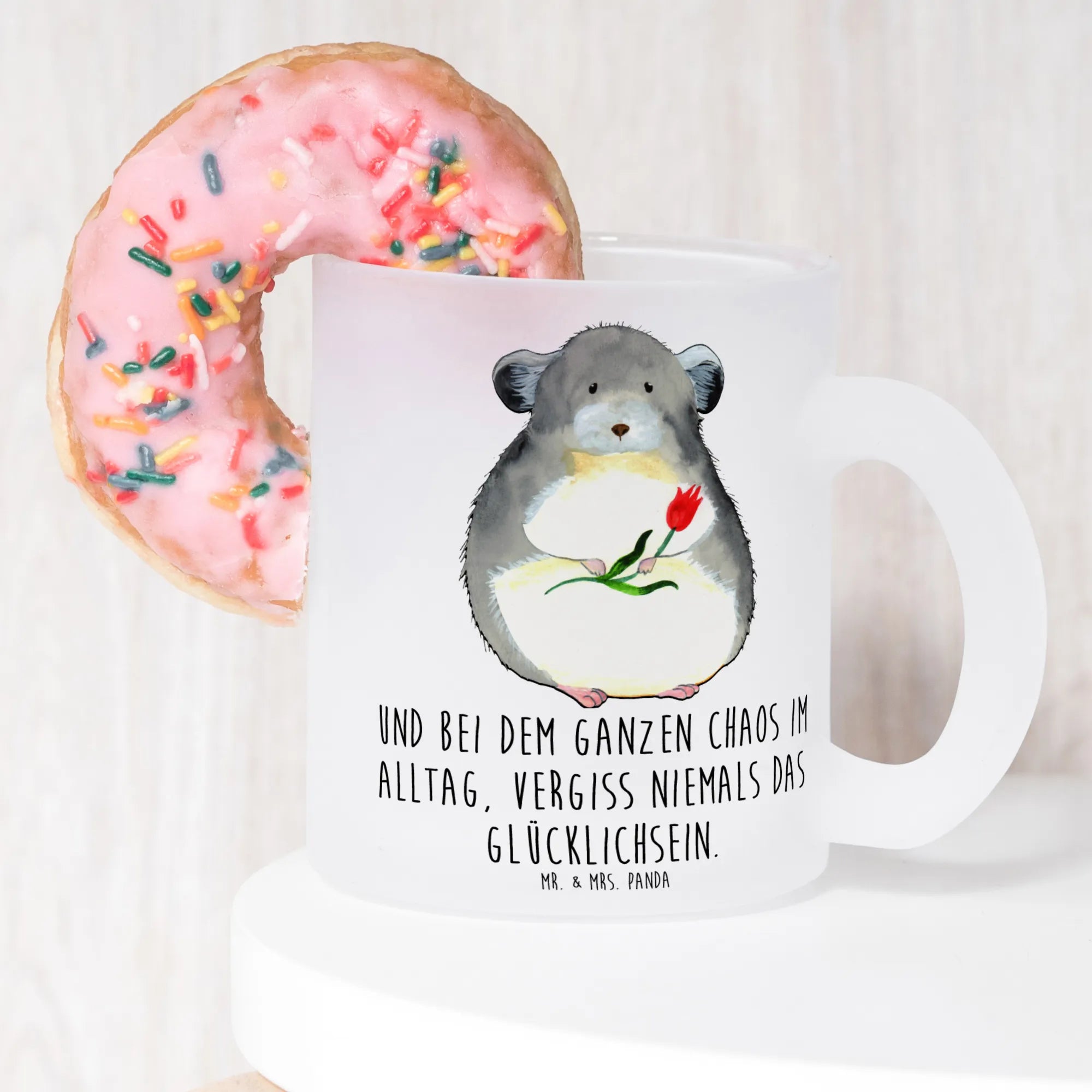 Liebst du Tee und süße Tiermotive? Dann wirst du unsere Teetasse „Chinchilla mit Blume“ aus der Small World Kollektion lieben. 🐭🌸 Mrs. Panda hat das niedliche Chinchilla im Aquarellstil gezeichnet – mit großen Augen, flauschigem Fell und einer Blume in der Pfote. Der eingebettete Spruch „Und bei dem ganzen Chaos im Alltag, vergiss niemals das Glücklichsein.“ macht die Tasse zur täglichen Erinnerung, kurz innezuhalten und glücklich zu sein.