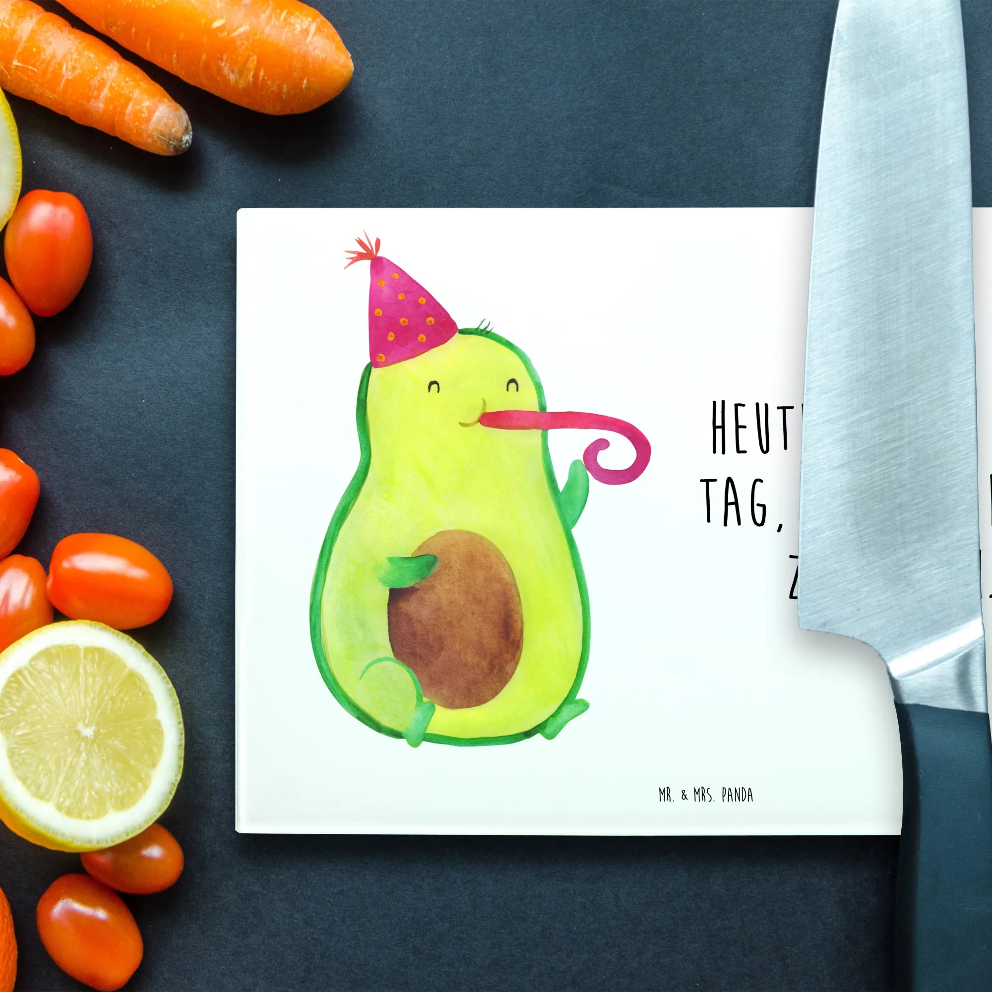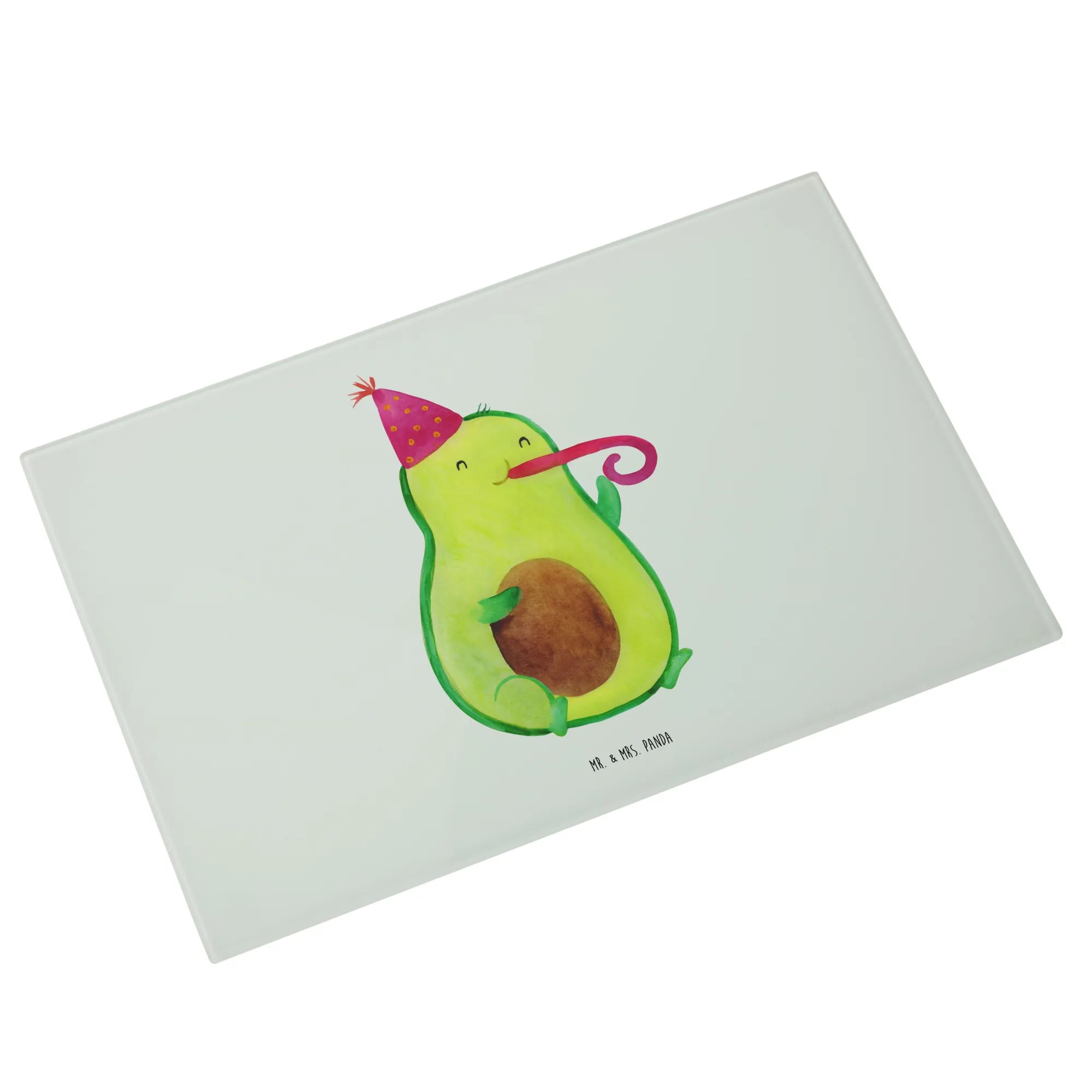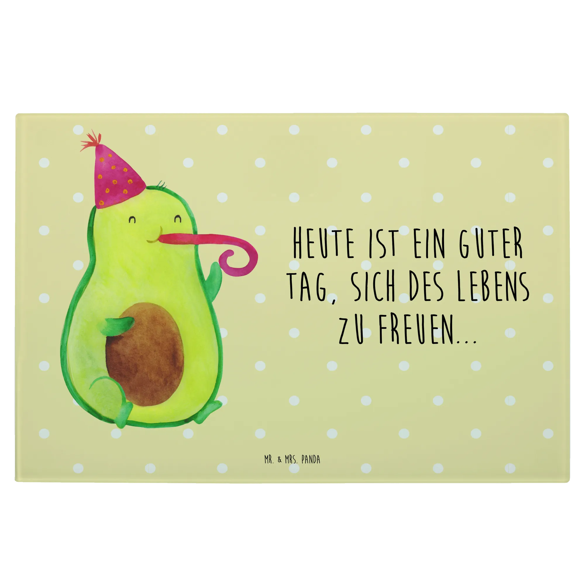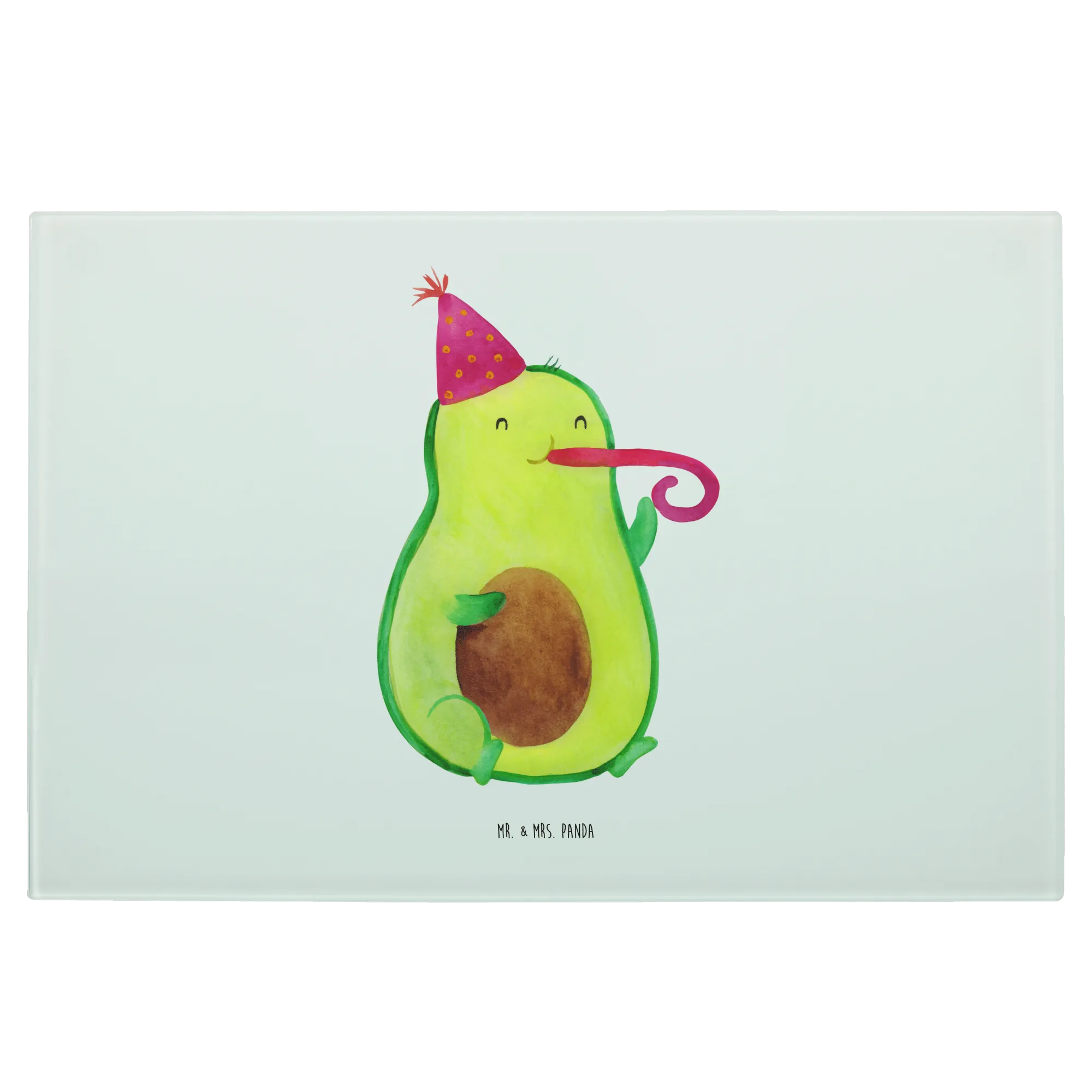 Das XL Glas Schneidbrett mit dem bezaubernden Motiv 'Avocado Partyhupe' von Mr. & Mrs. Panda ist nicht nur ein praktischer Küchenhelfer, sondern auch ein echter Hingucker!