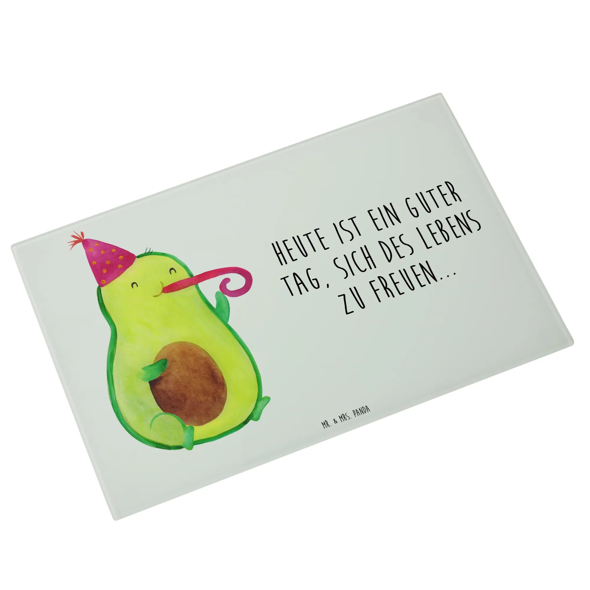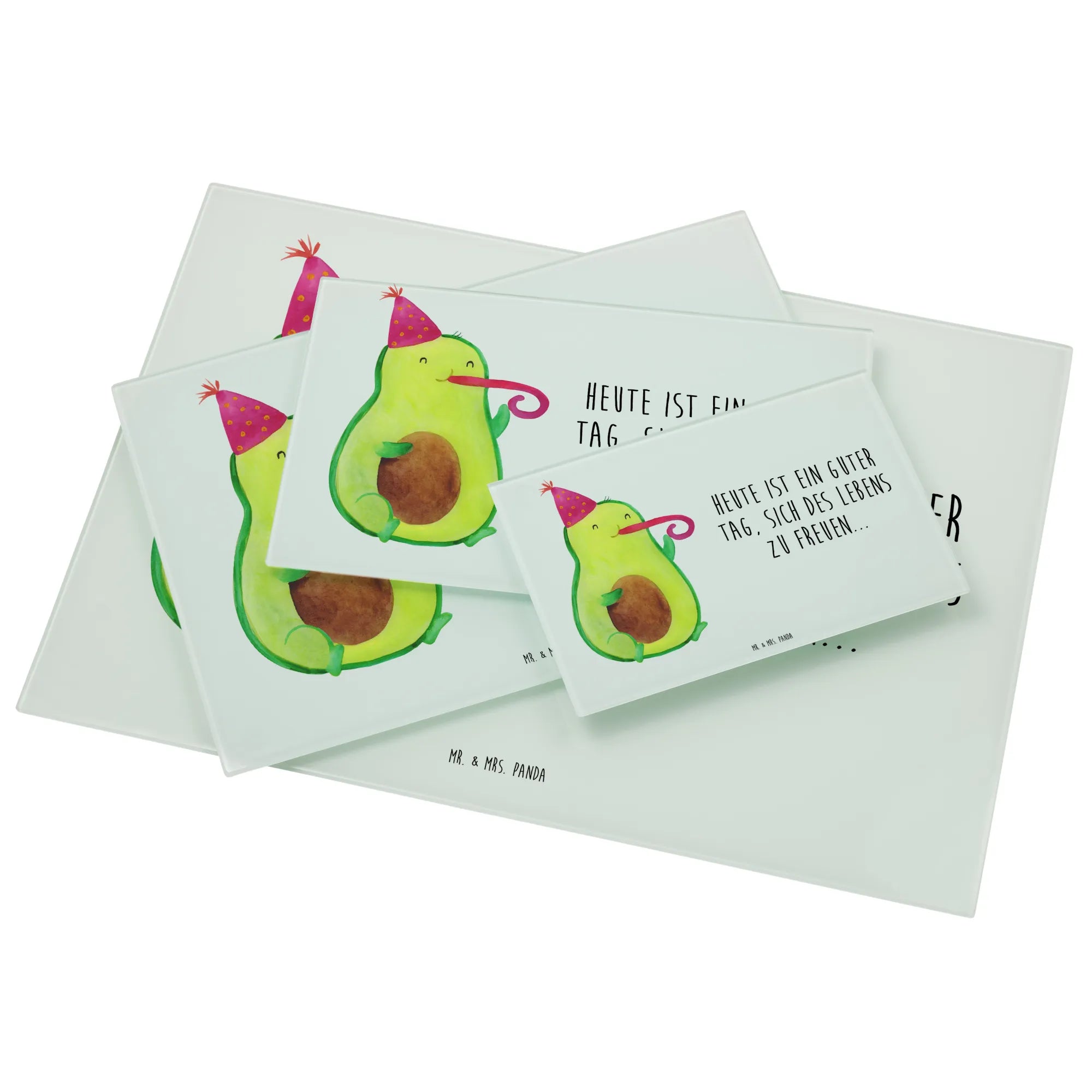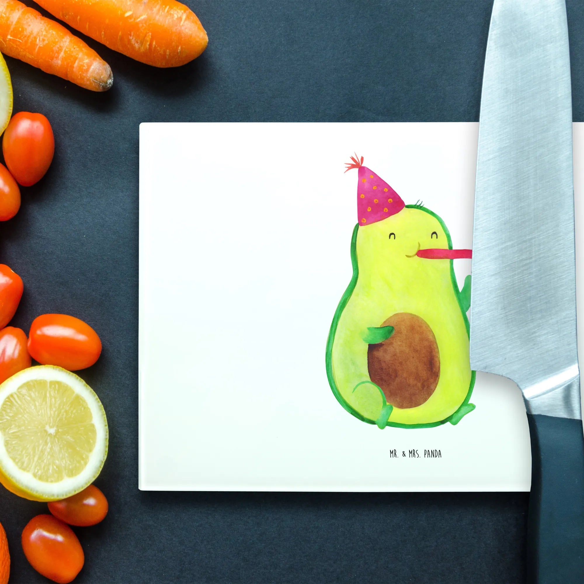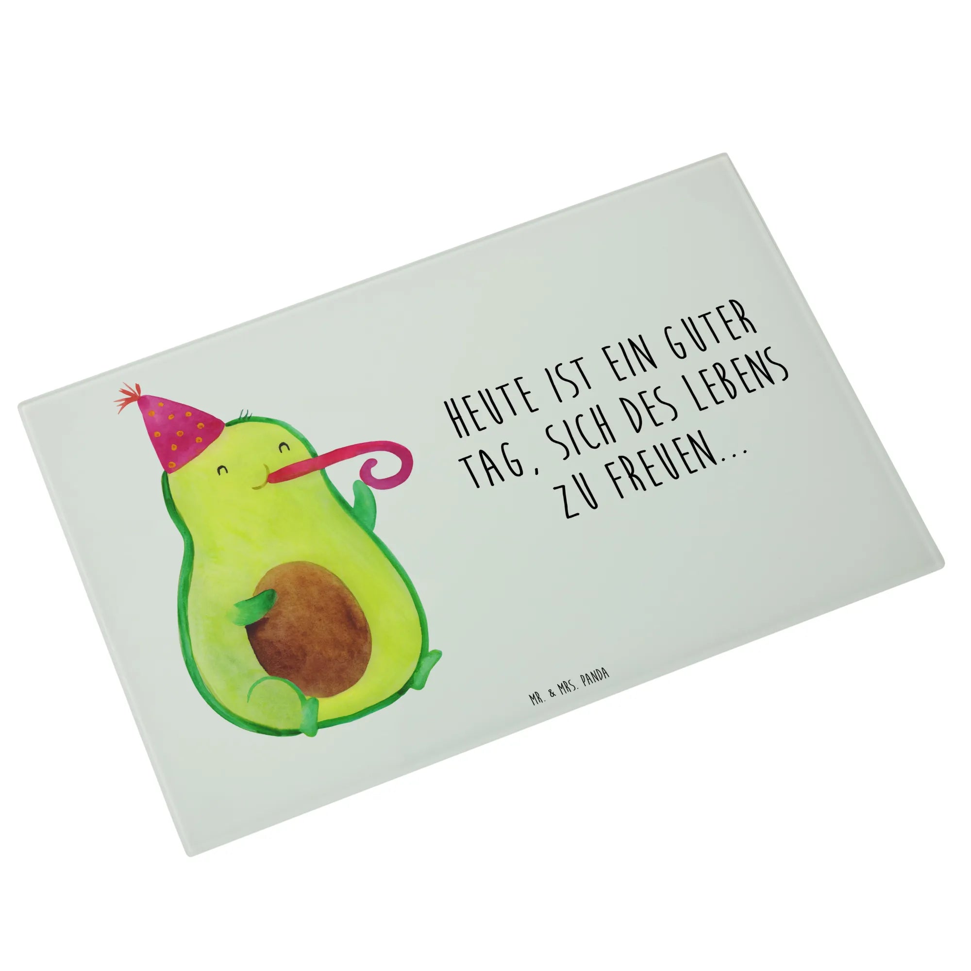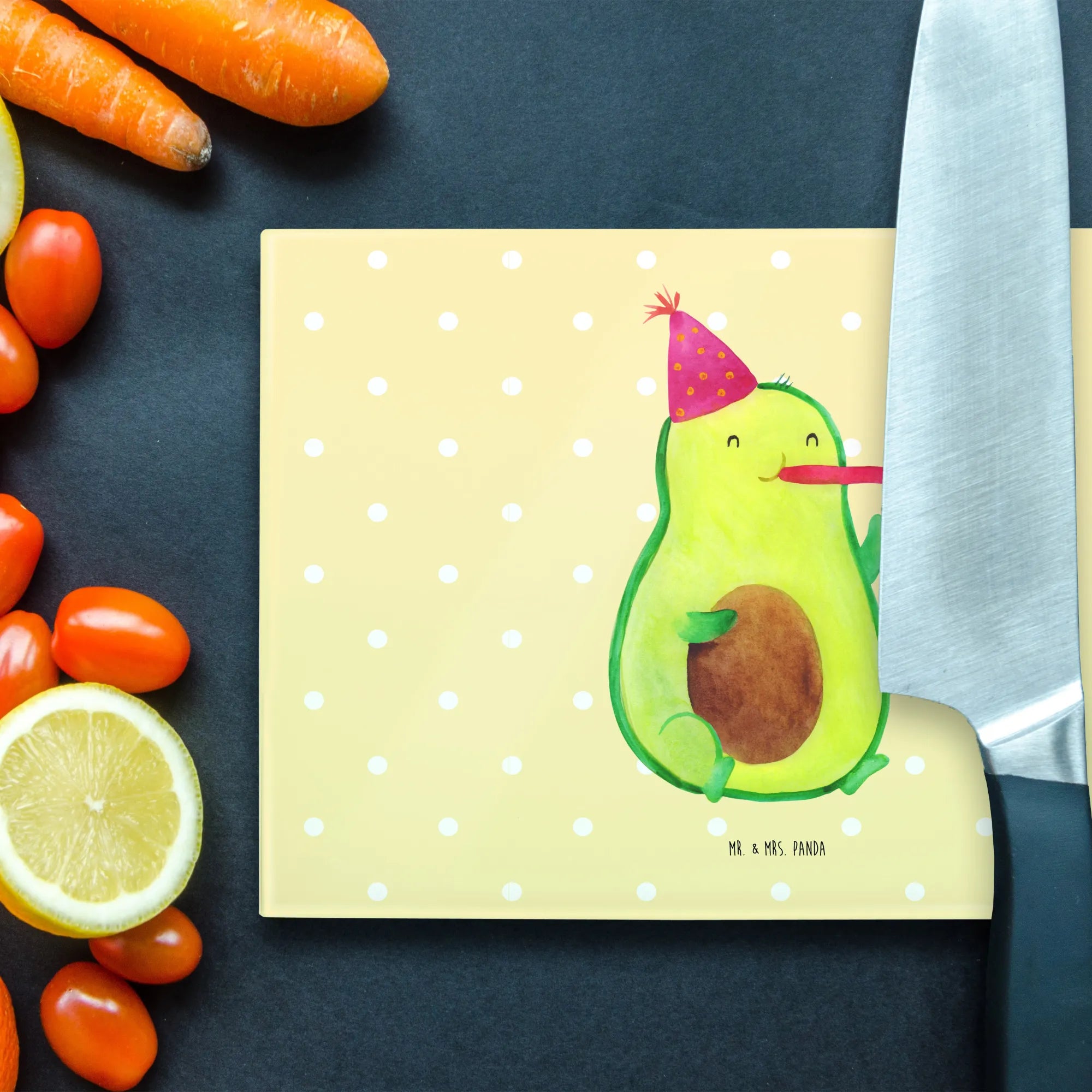 Das XL Glas Schneidbrett mit dem bezaubernden Motiv 'Avocado Partyhupe' von Mr. & Mrs. Panda ist nicht nur ein praktischer Küchenhelfer, sondern auch ein echter Hingucker!