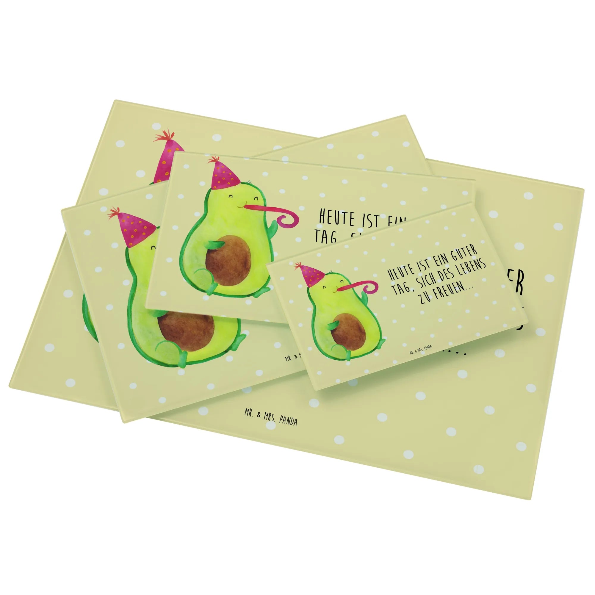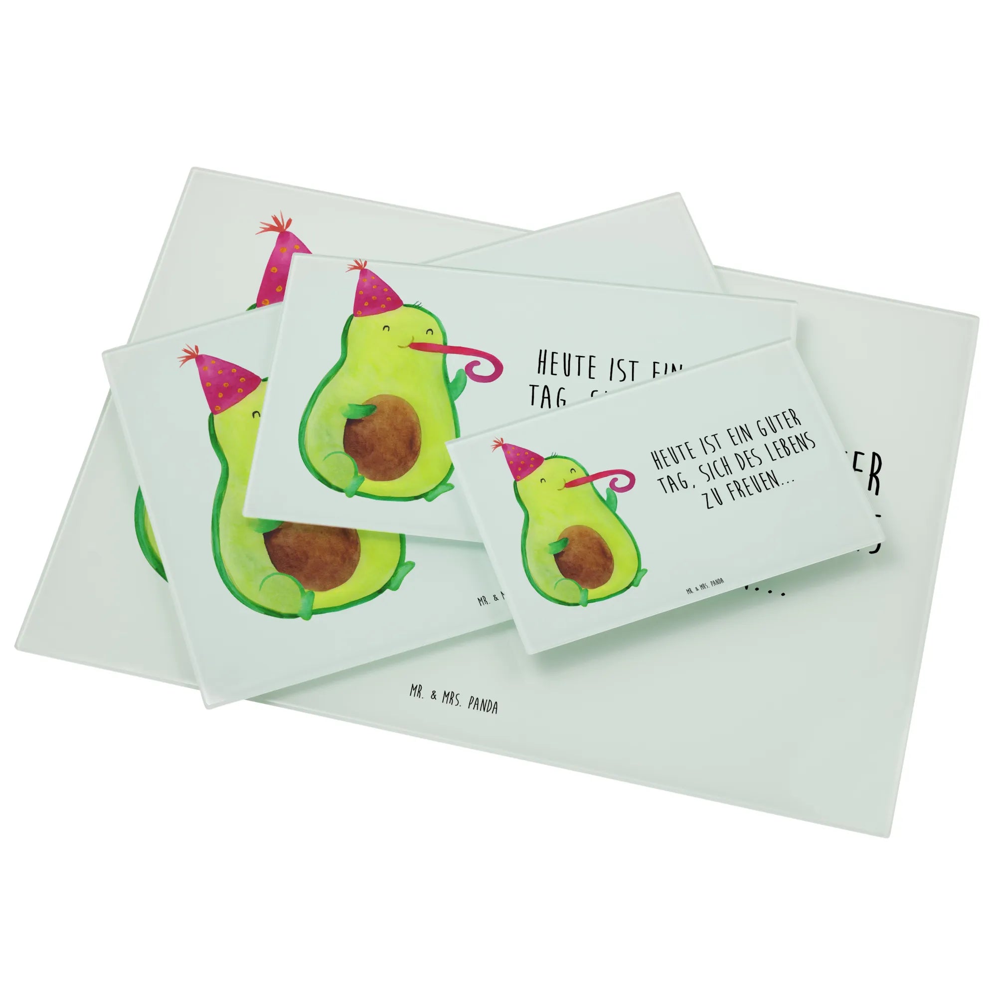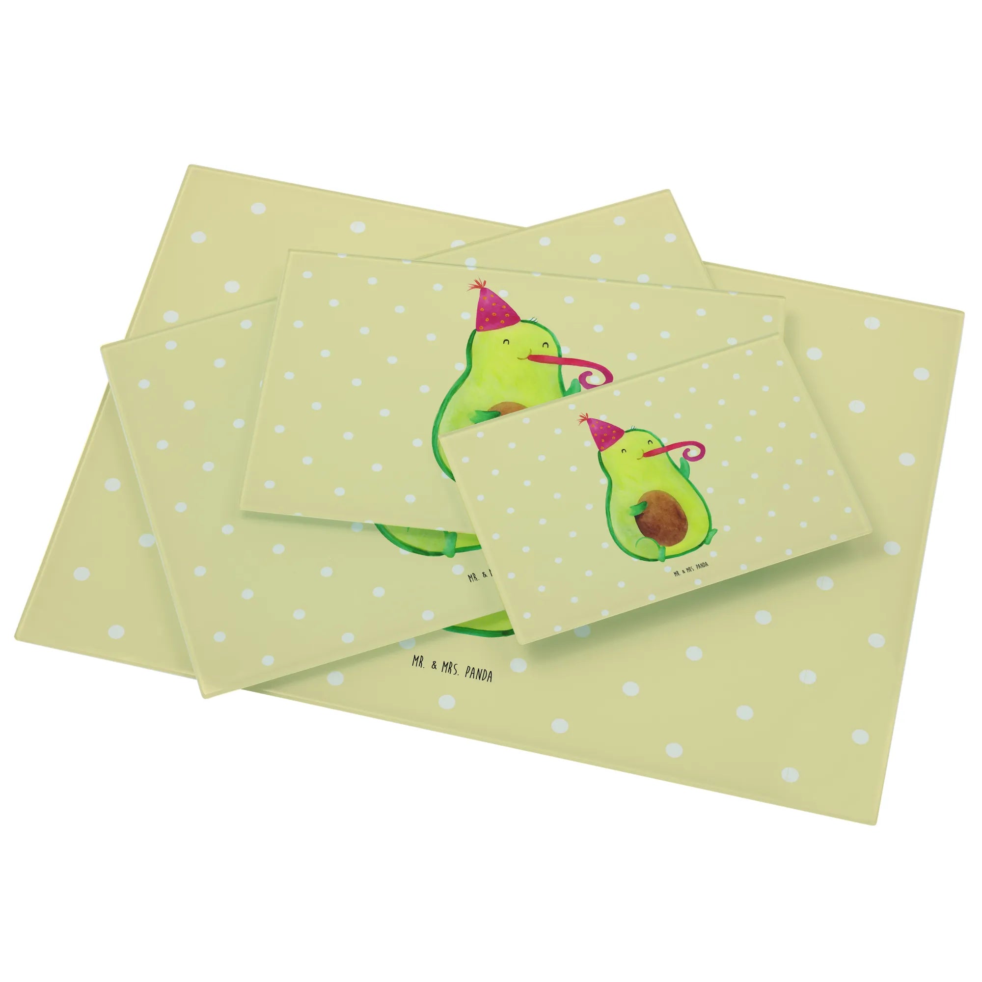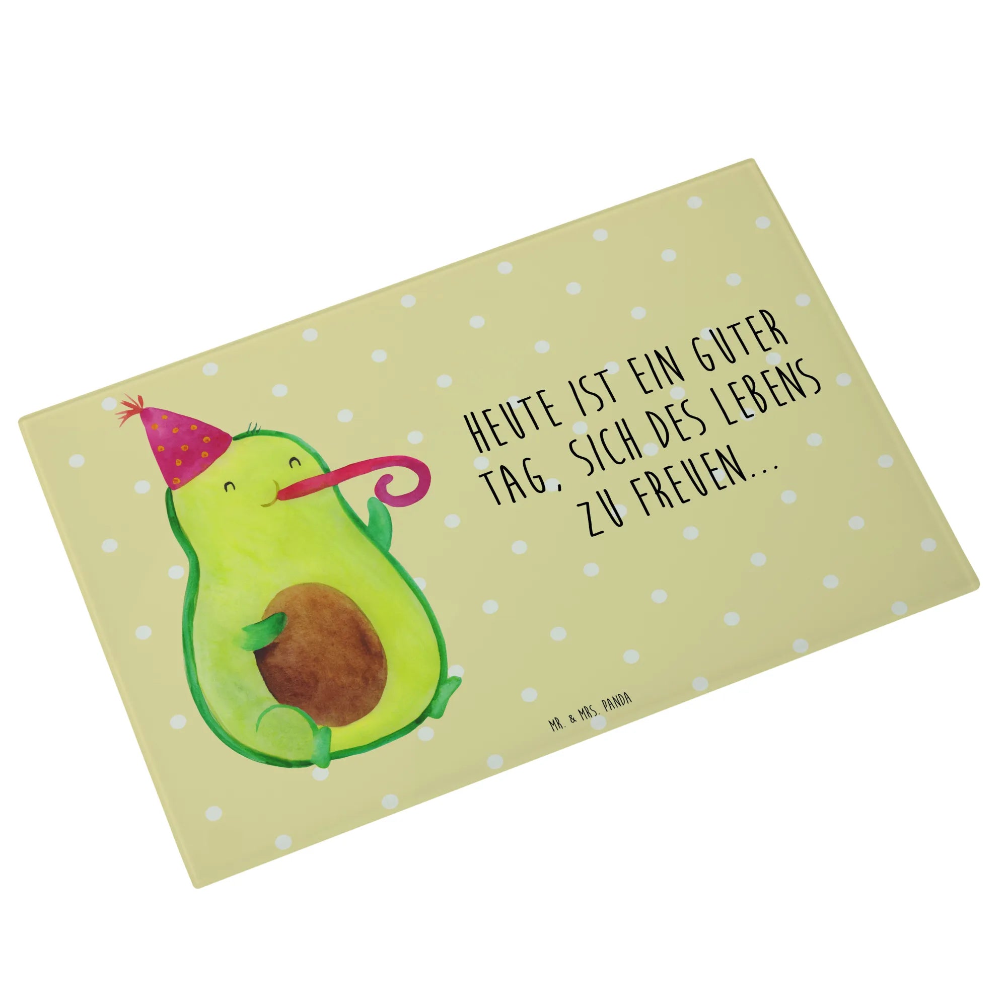 Das XL Glas Schneidbrett mit dem bezaubernden Motiv 'Avocado Partyhupe' von Mr. & Mrs. Panda ist nicht nur ein praktischer Küchenhelfer, sondern auch ein echter Hingucker!