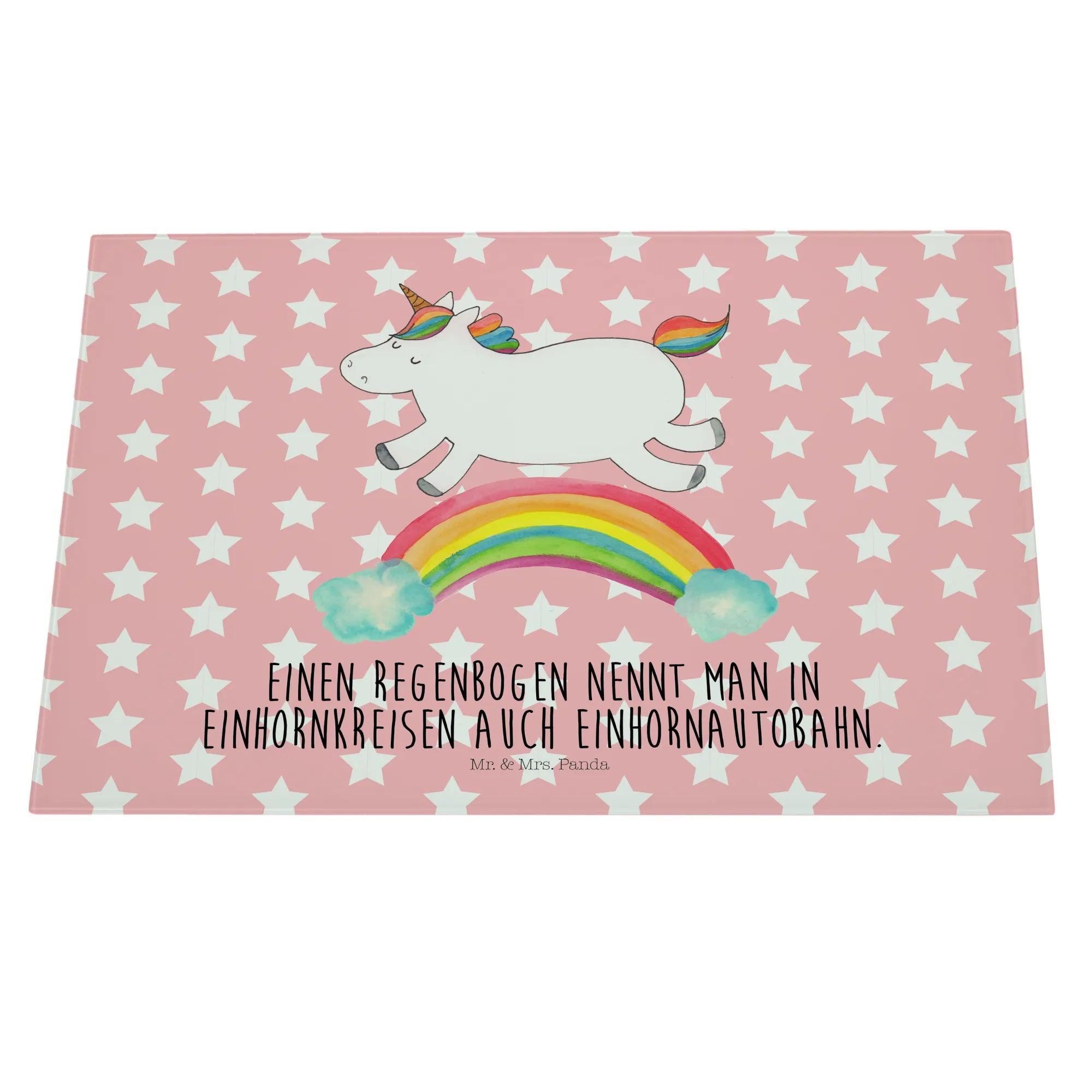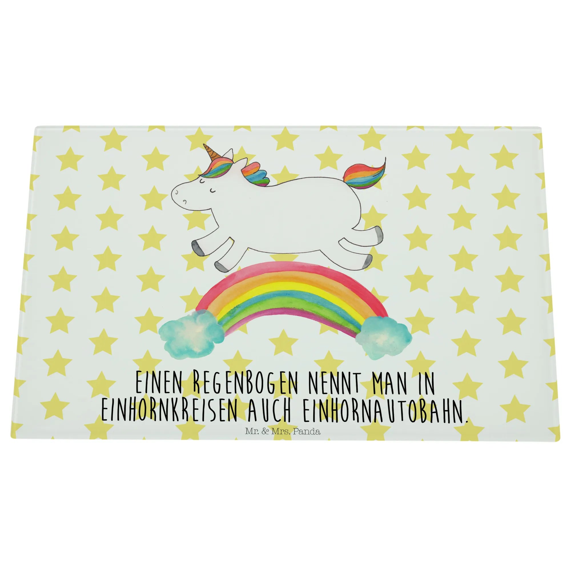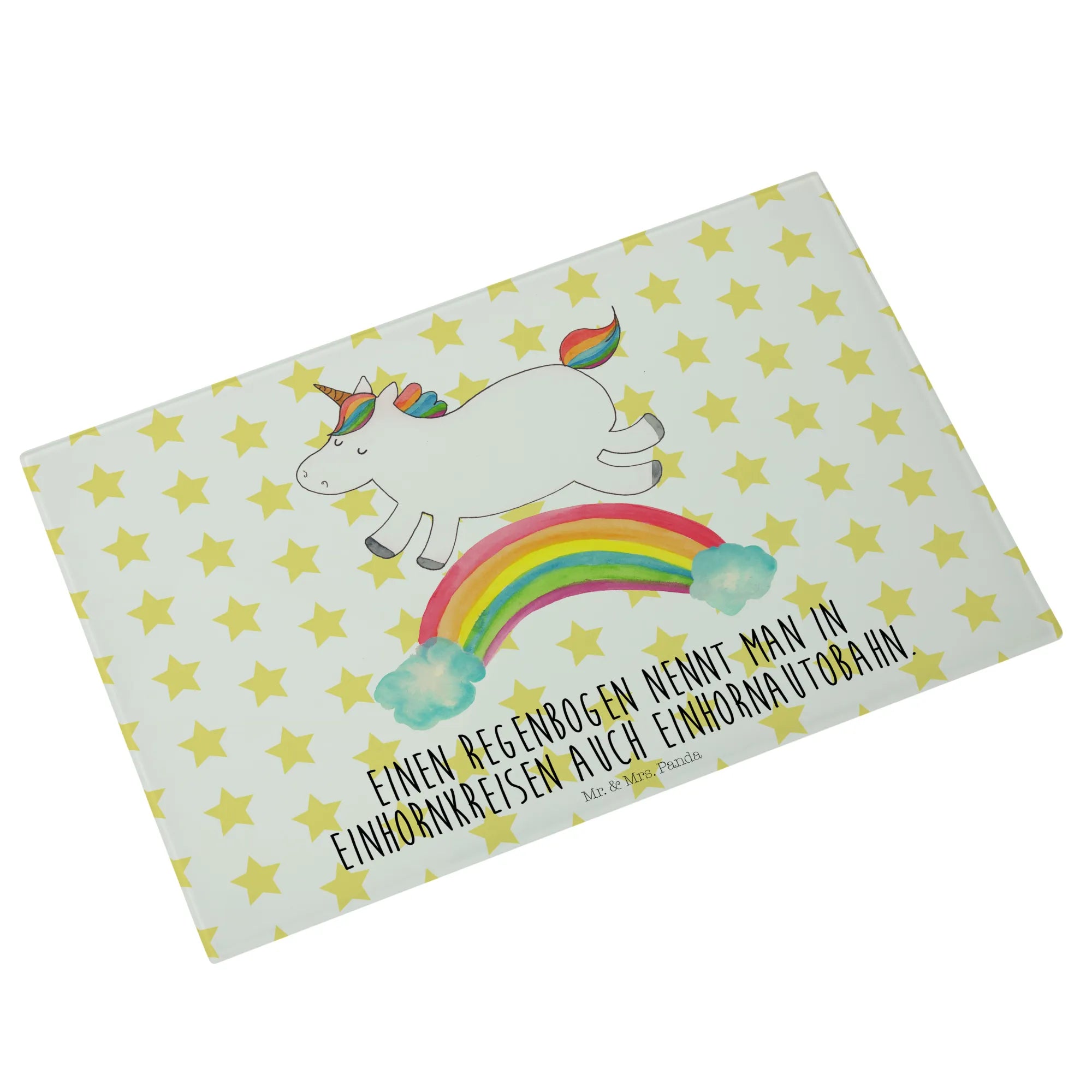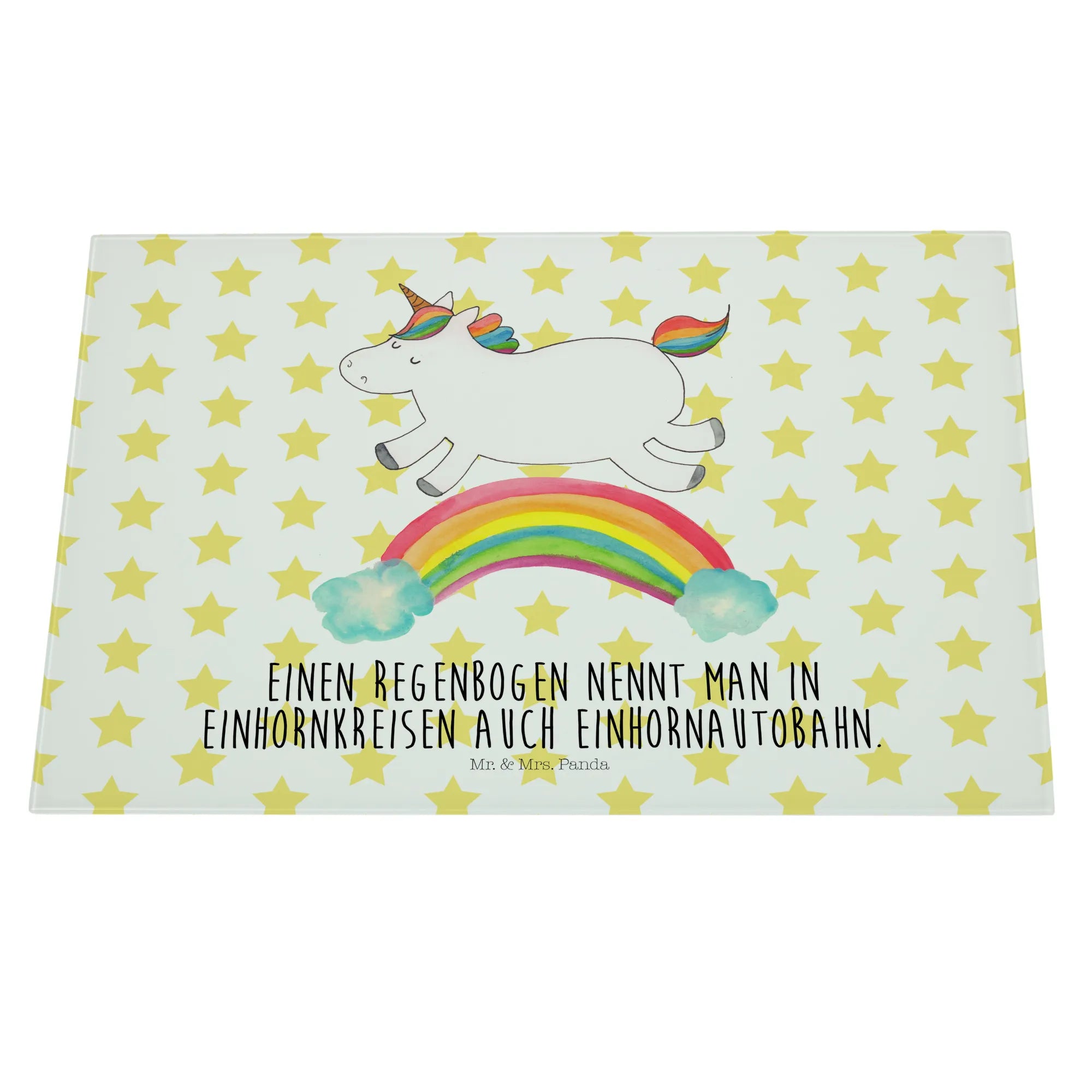 Das Einhorn Motiv ist besonders bei Erwachsenen beliebt, die sich gerne an die zauberhafte Kindheit erinnern, in der Einhörner die Helden ihrer Geschichten waren. Mit einem süßen Motto, dass jedes Herz erwärmt, ist das Medium Glas Schneidbrett von Mr. & Mrs. Panda das perfekte Geschenk für wissbegierige Freunde: "Einen Regenbogen nennt man in Einhornkreisen auch Einhornautobahn." Egal ob du es kaufst, um es zu verschenken oder es selbst nutzen möchtest, es wird definitiv für Freude und Staunen sorgen.