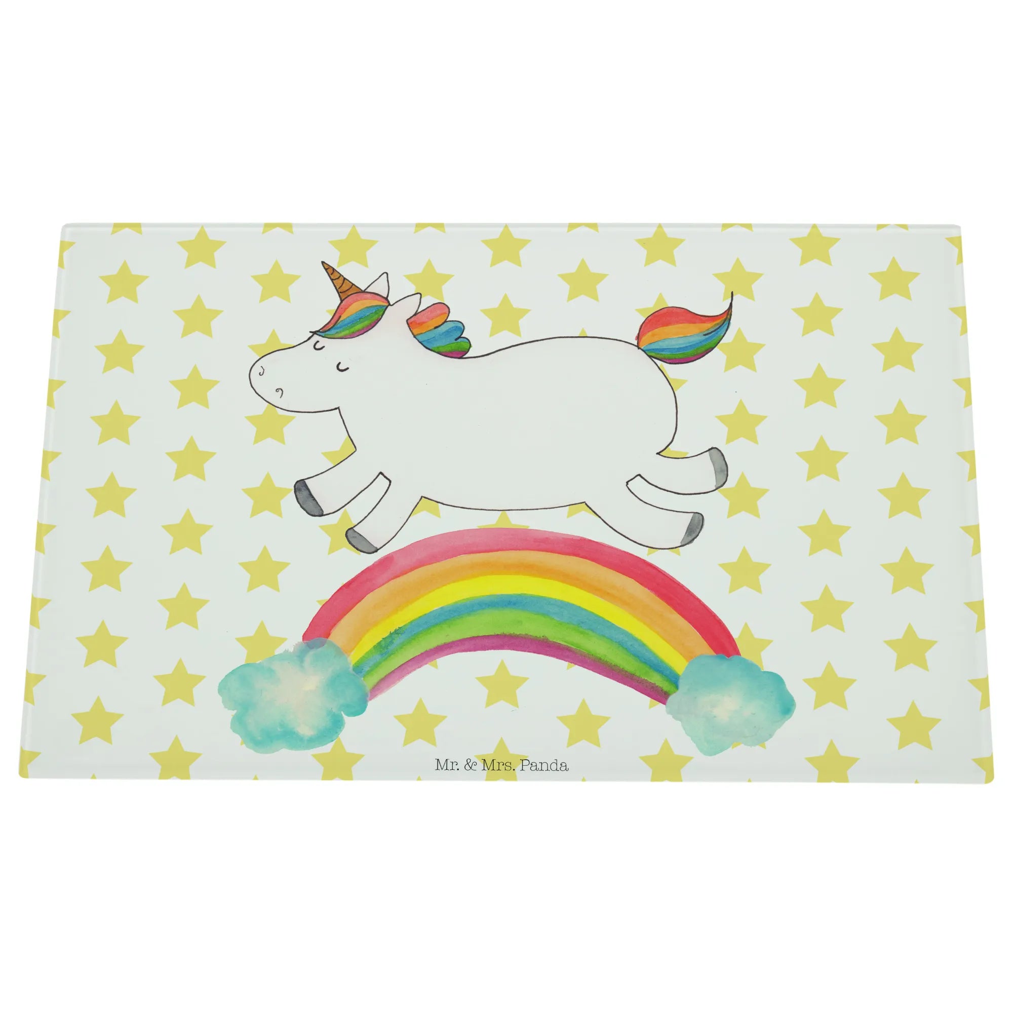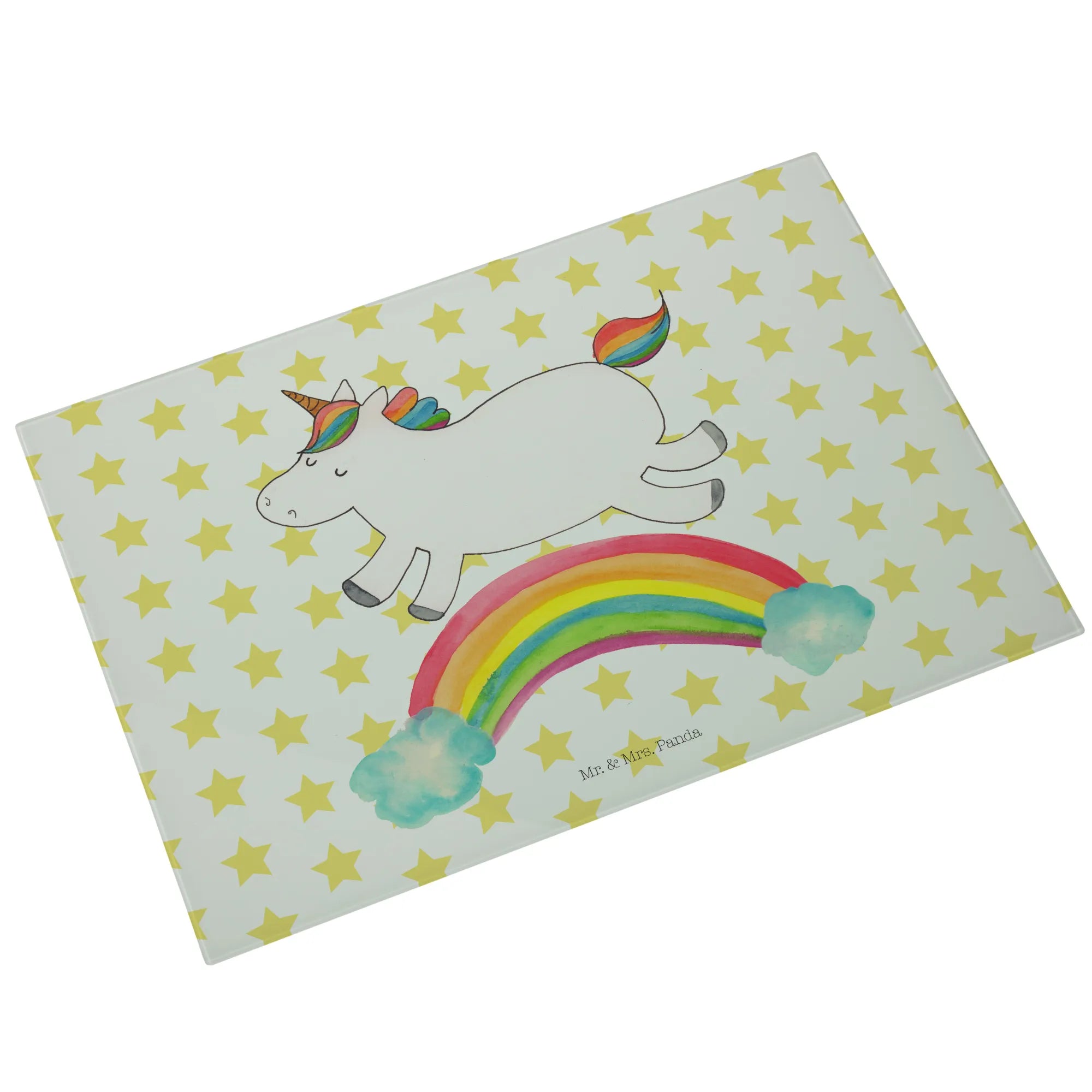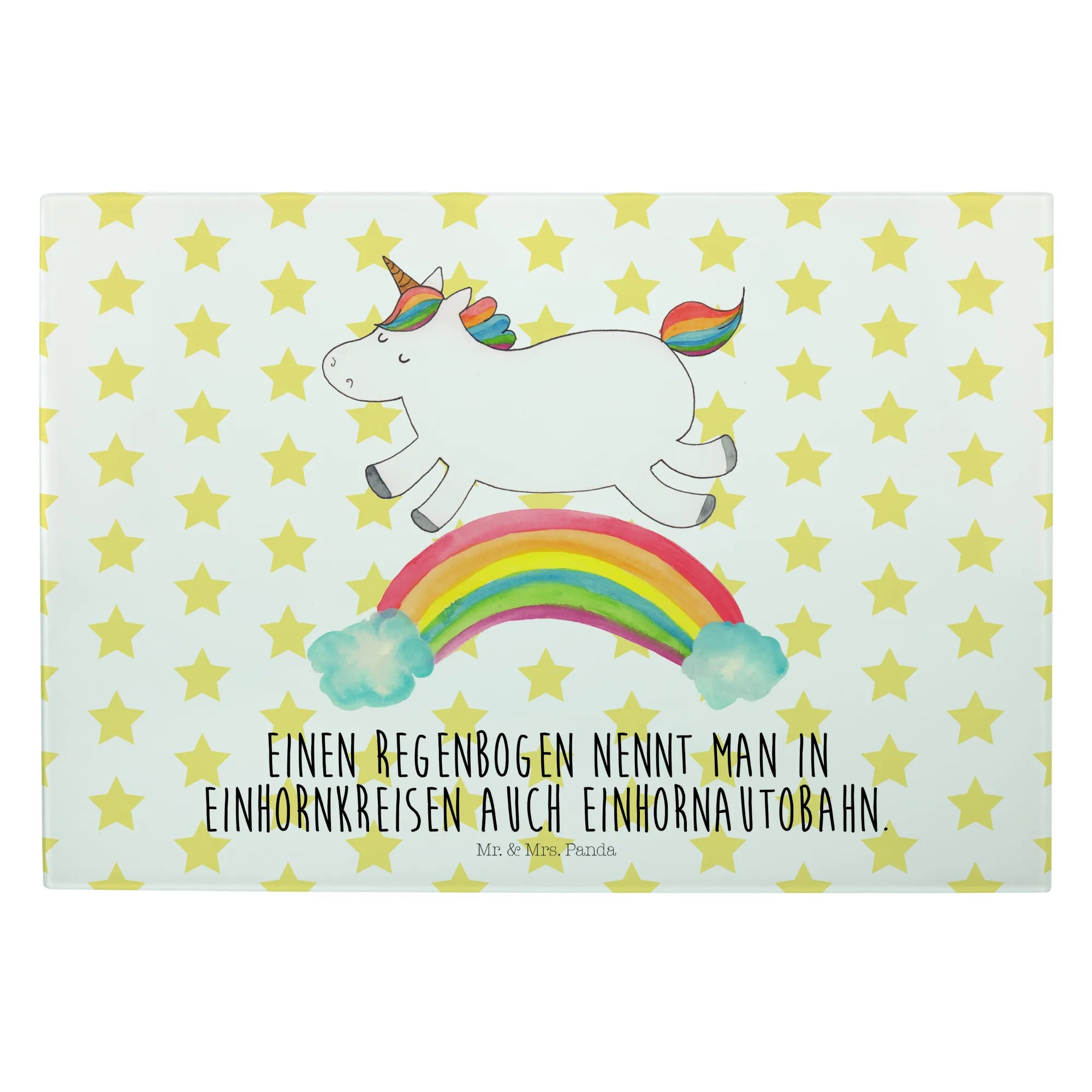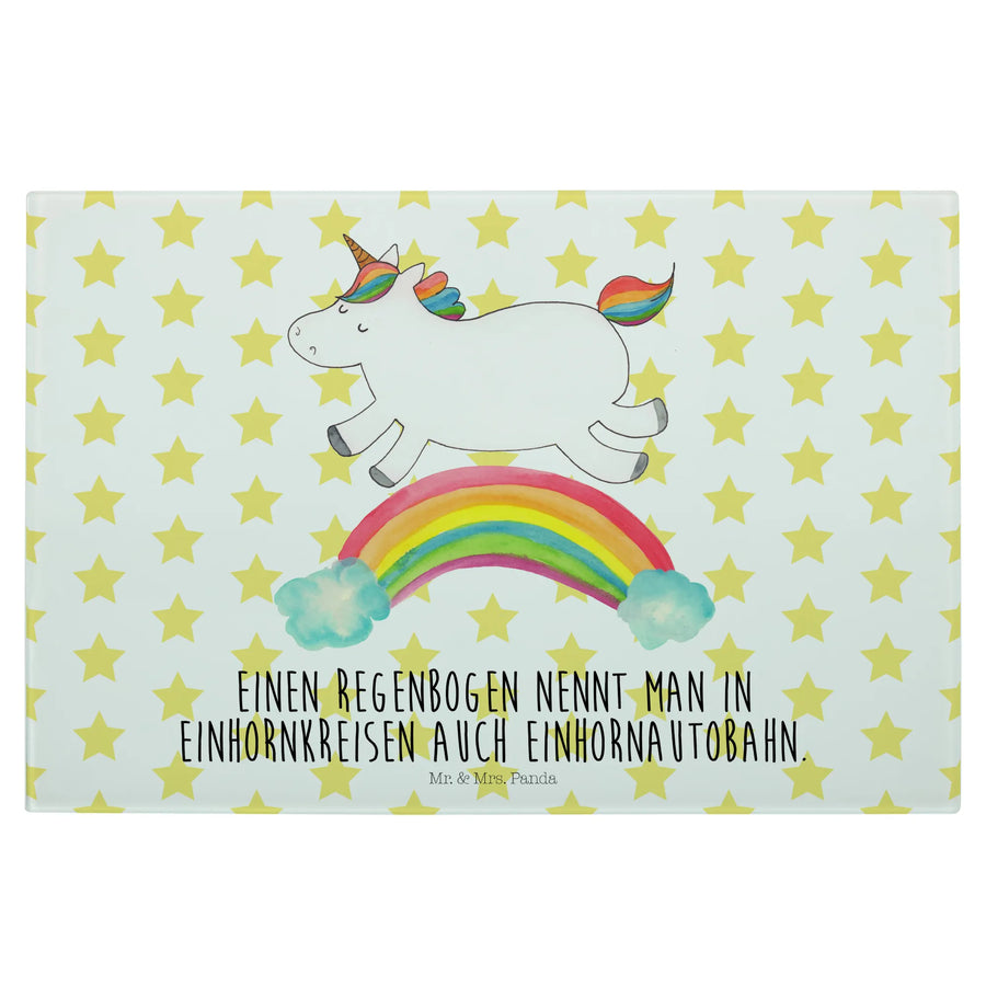 Entdecke das zauberhafte Medium Glas Schneidbrett mit dem fröhlichen Einhorn Regenbogen Motiv aus der einzigartigen Einhorn-Kollektion von Mr. & Mrs. Panda!