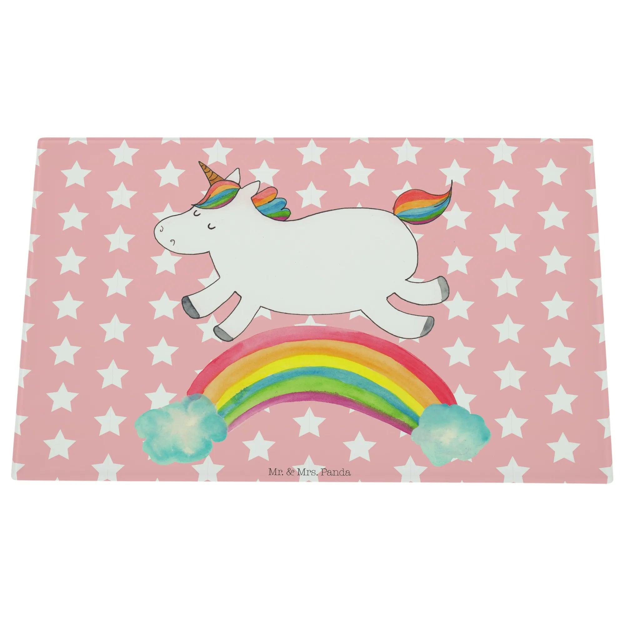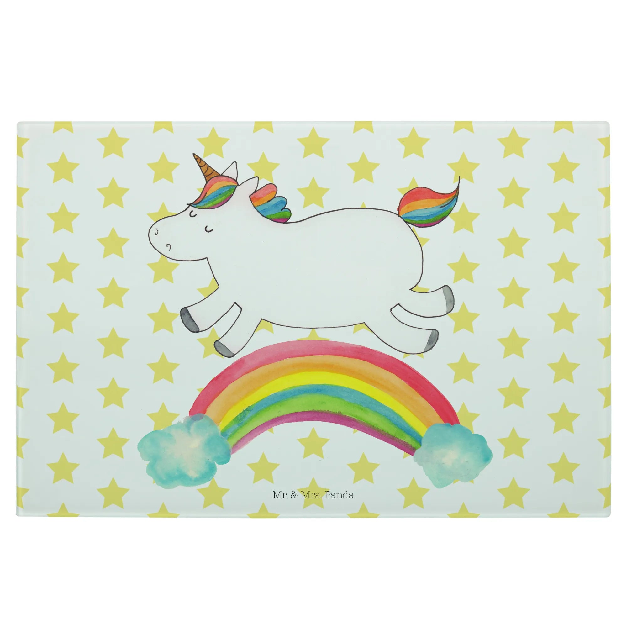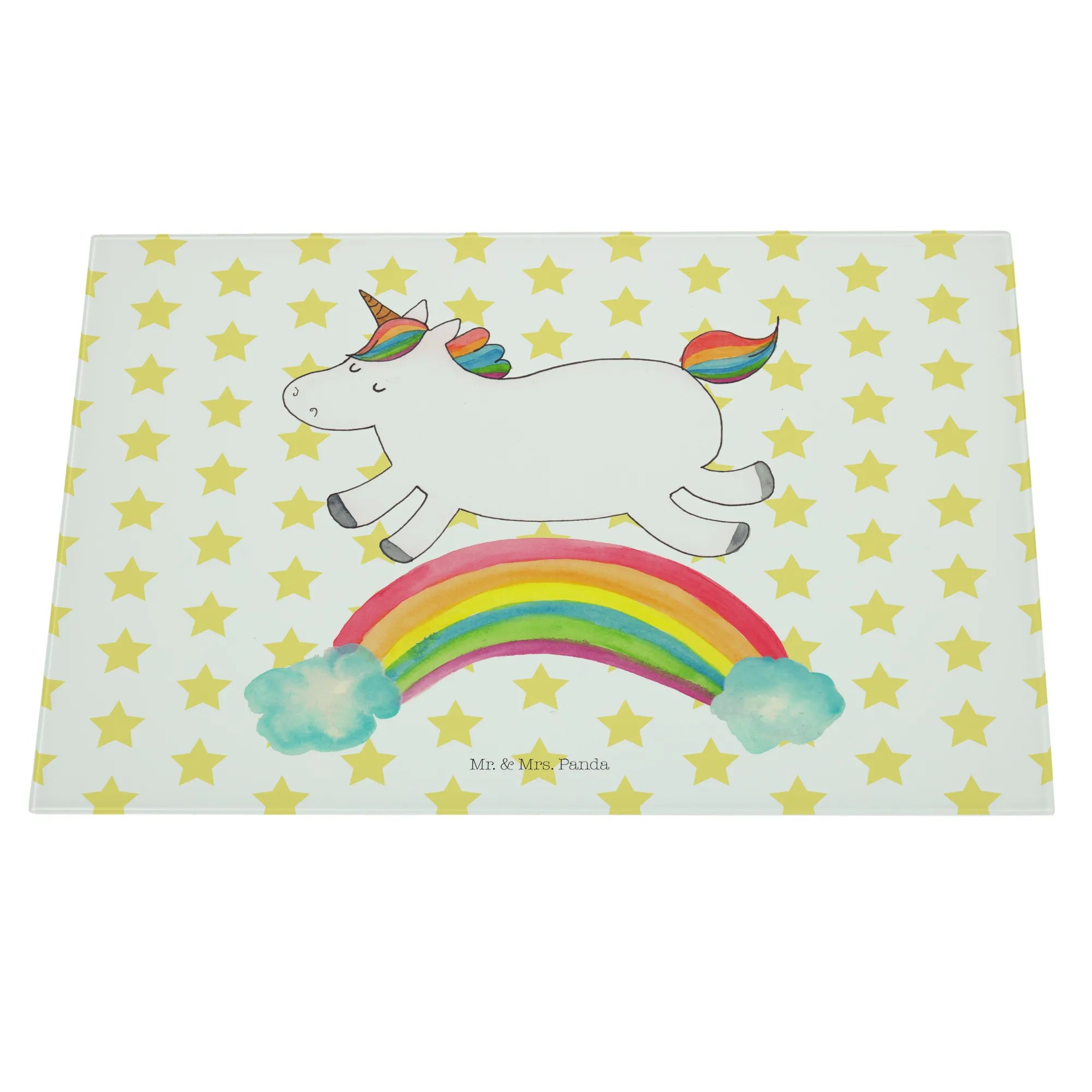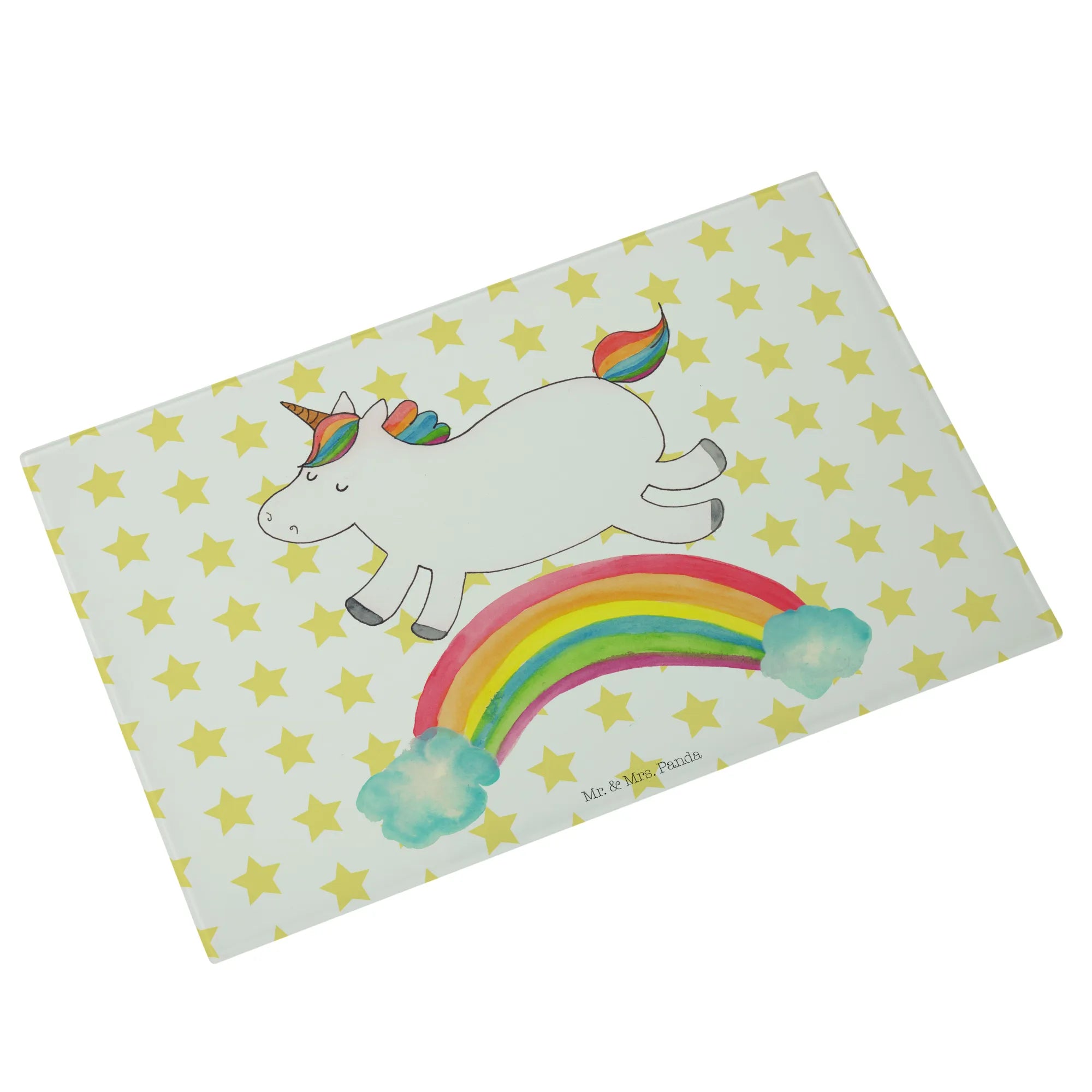 Entdecke das zauberhafte Medium Glas Schneidbrett mit dem fröhlichen Einhorn Regenbogen Motiv aus der einzigartigen Einhorn-Kollektion von Mr. & Mrs. Panda!