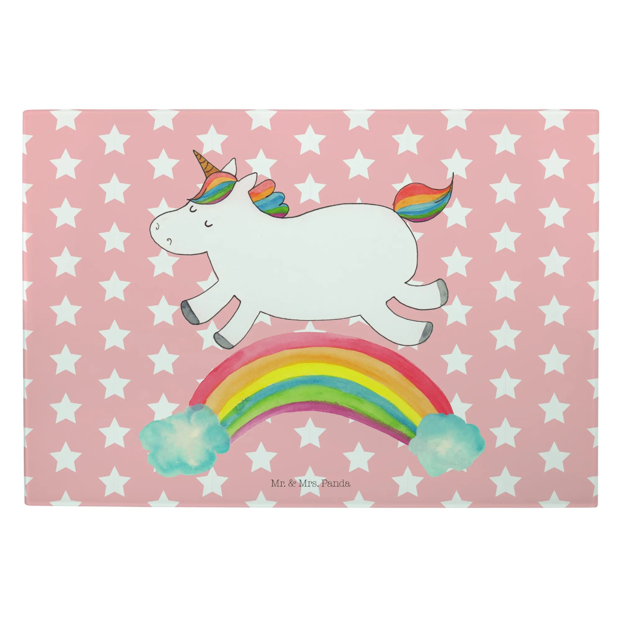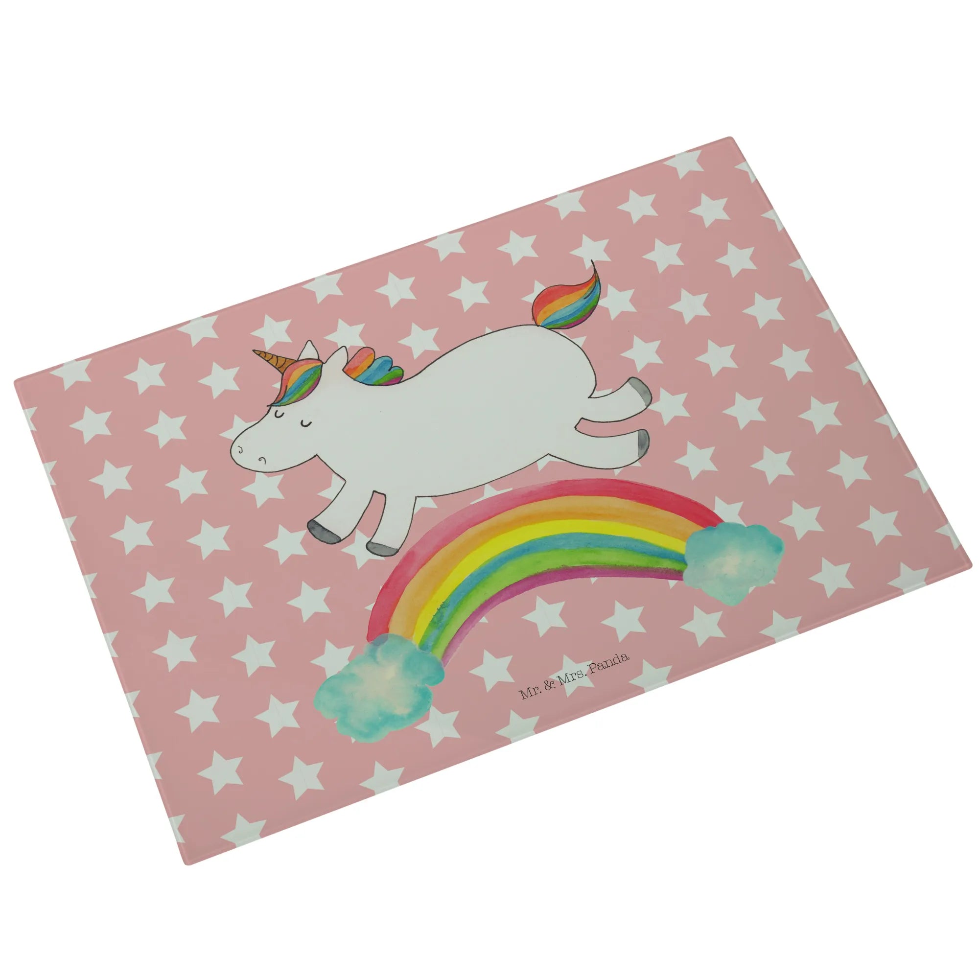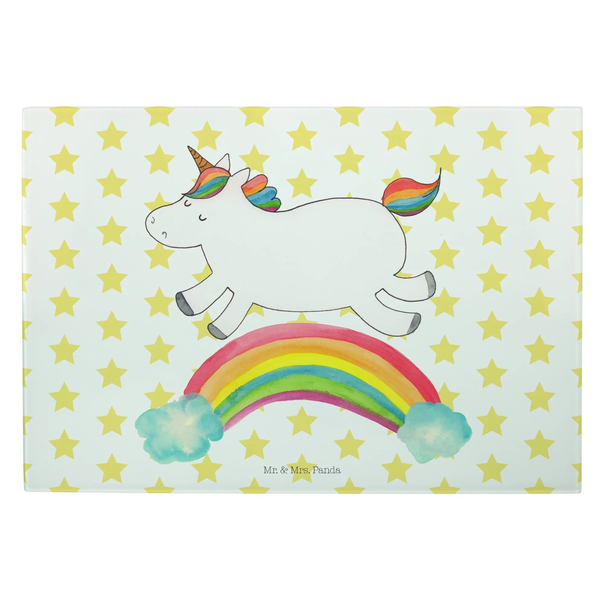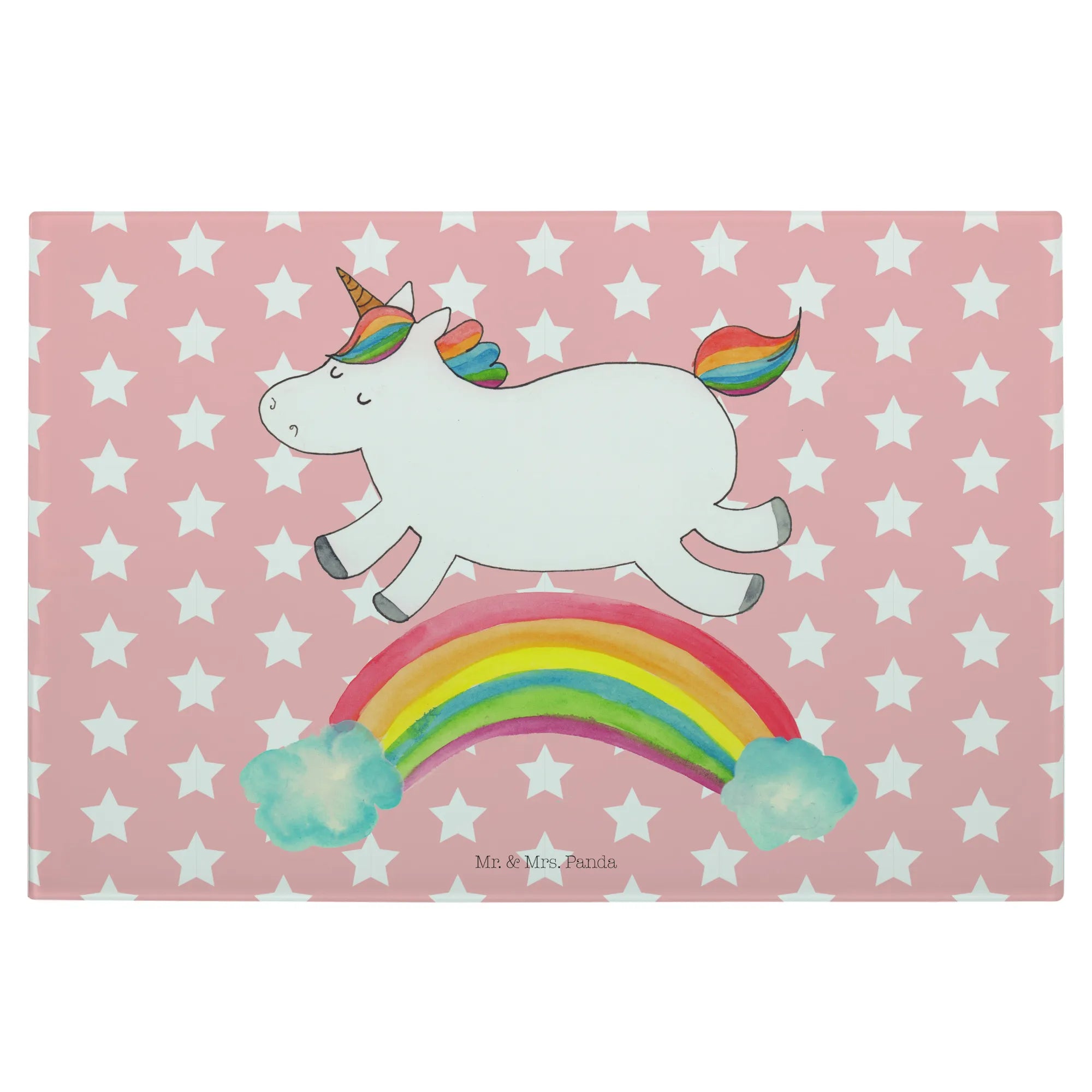 Entdecke das zauberhafte Medium Glas Schneidbrett mit dem fröhlichen Einhorn Regenbogen Motiv aus der einzigartigen Einhorn-Kollektion von Mr. & Mrs. Panda!
