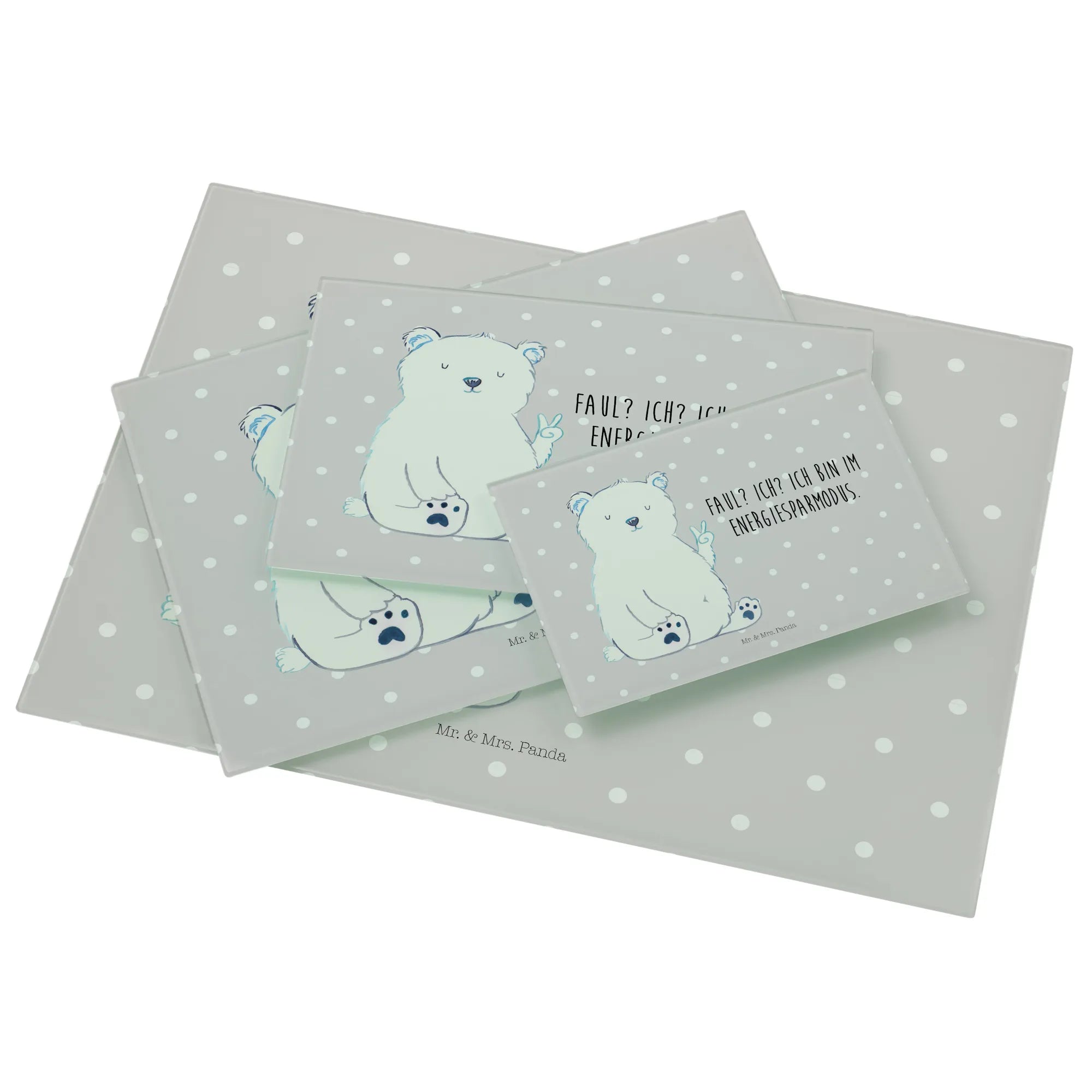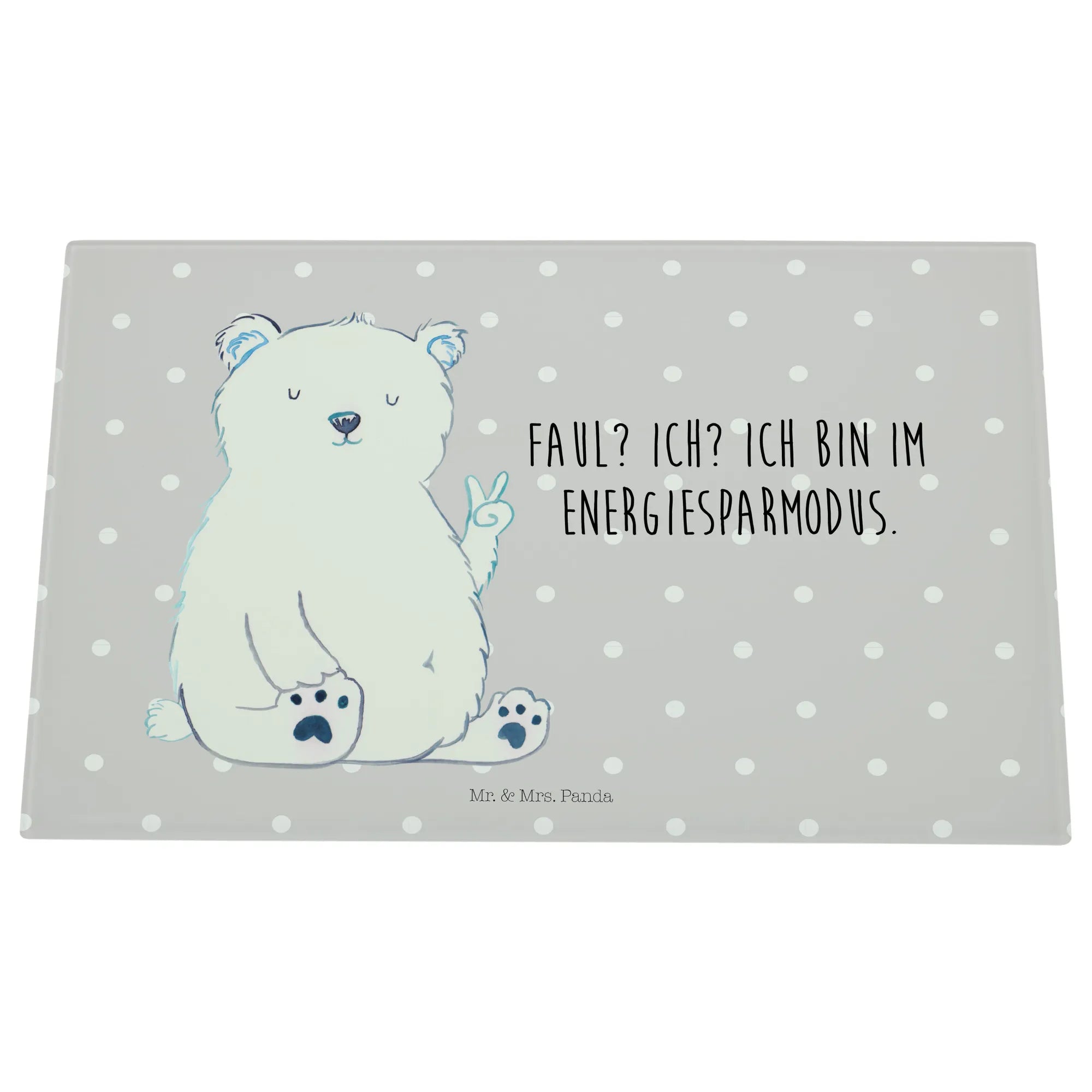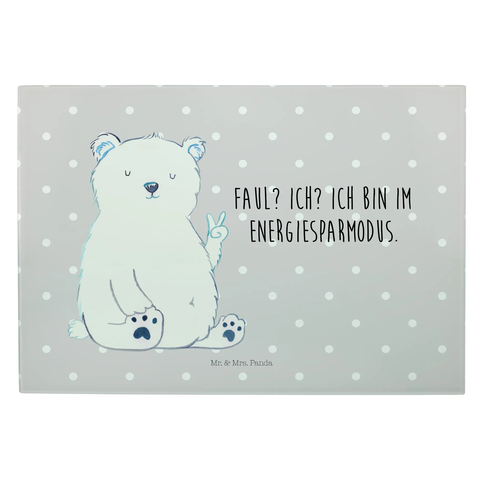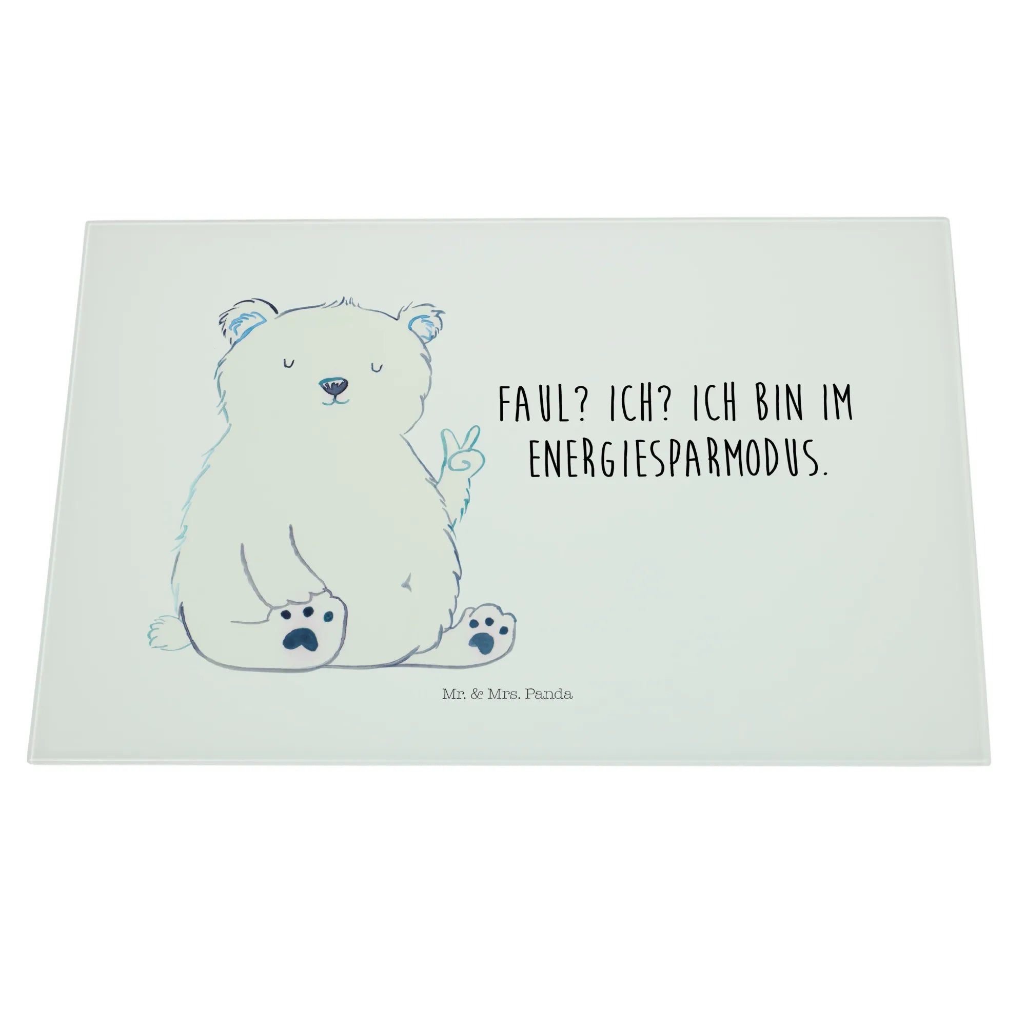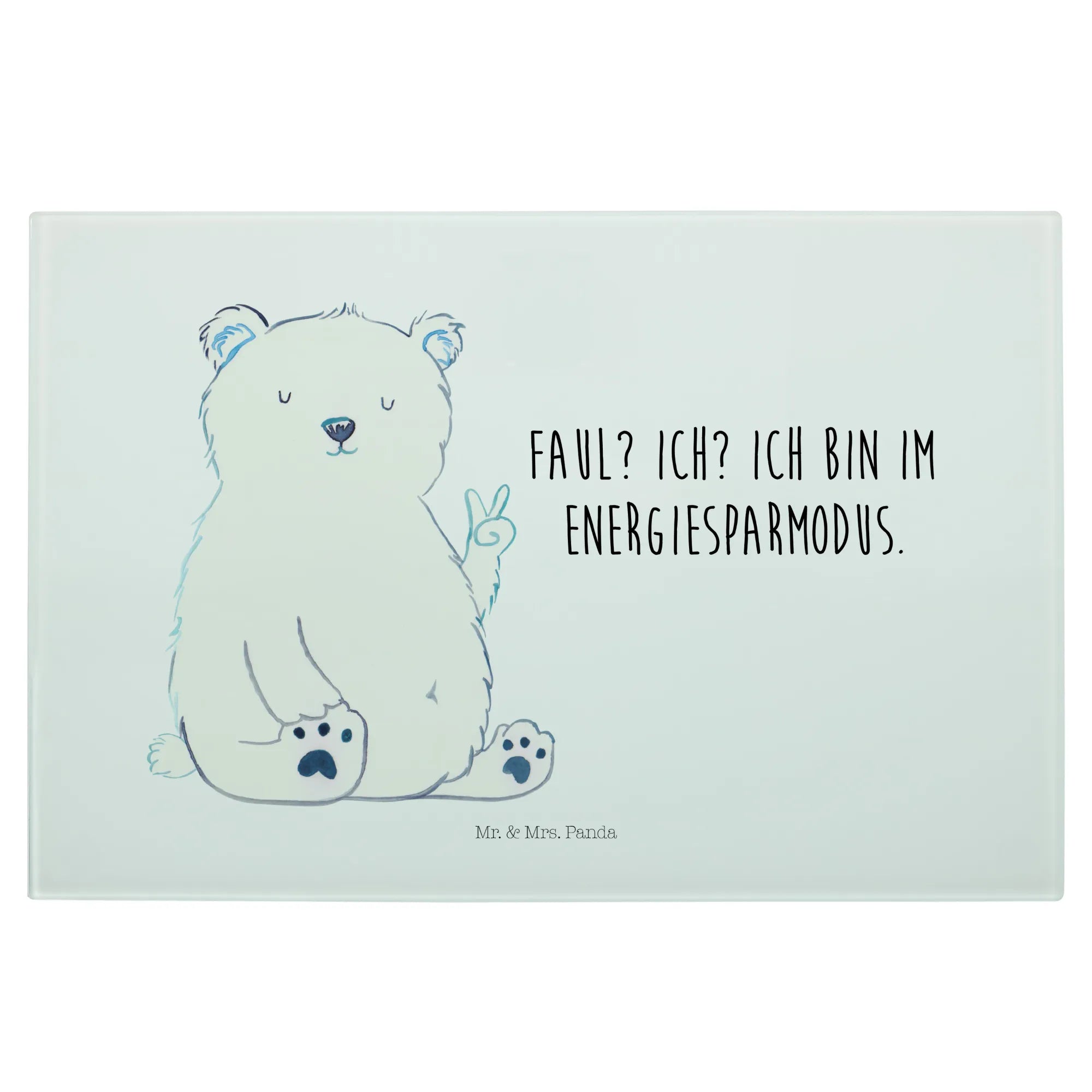 Das XL Glas Schneidbrett Eisbär Faul von Mr. & Mrs. Panda ist das perfekte Geschenk für alle, die Entspannung und einen Hauch von Humor in ihrer Küche lieben. Mit dem niedlichen Eisbär, der das Peace-Zeichen zeigt und dem Slogan „Faul? Ich? Ich bin im Energiesparmodus.“, bringt dieses Schneidebrett nicht nur Freude beim Kochen, sondern auch ein breites Lächeln auf die Gesichter deiner Freunde und Familie.