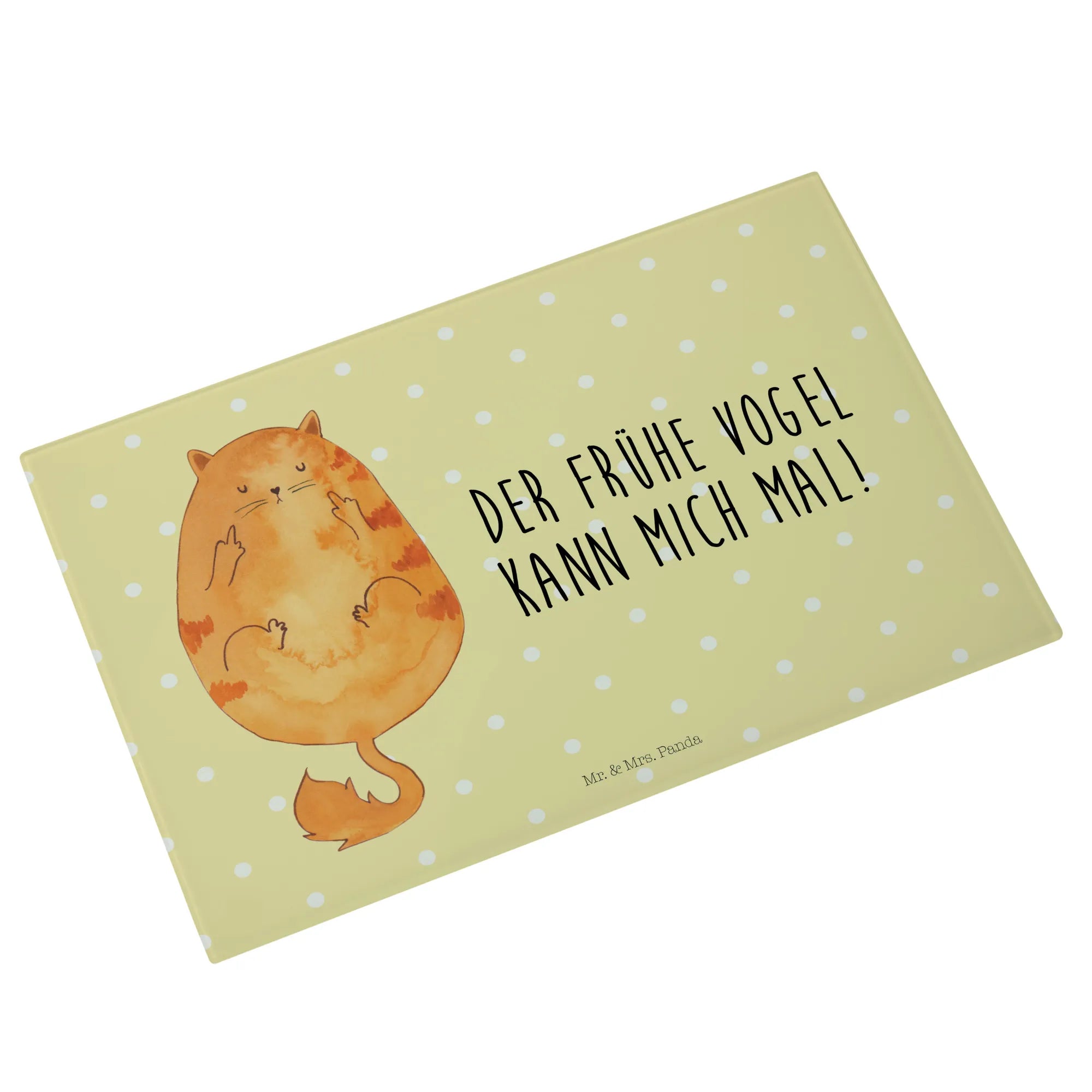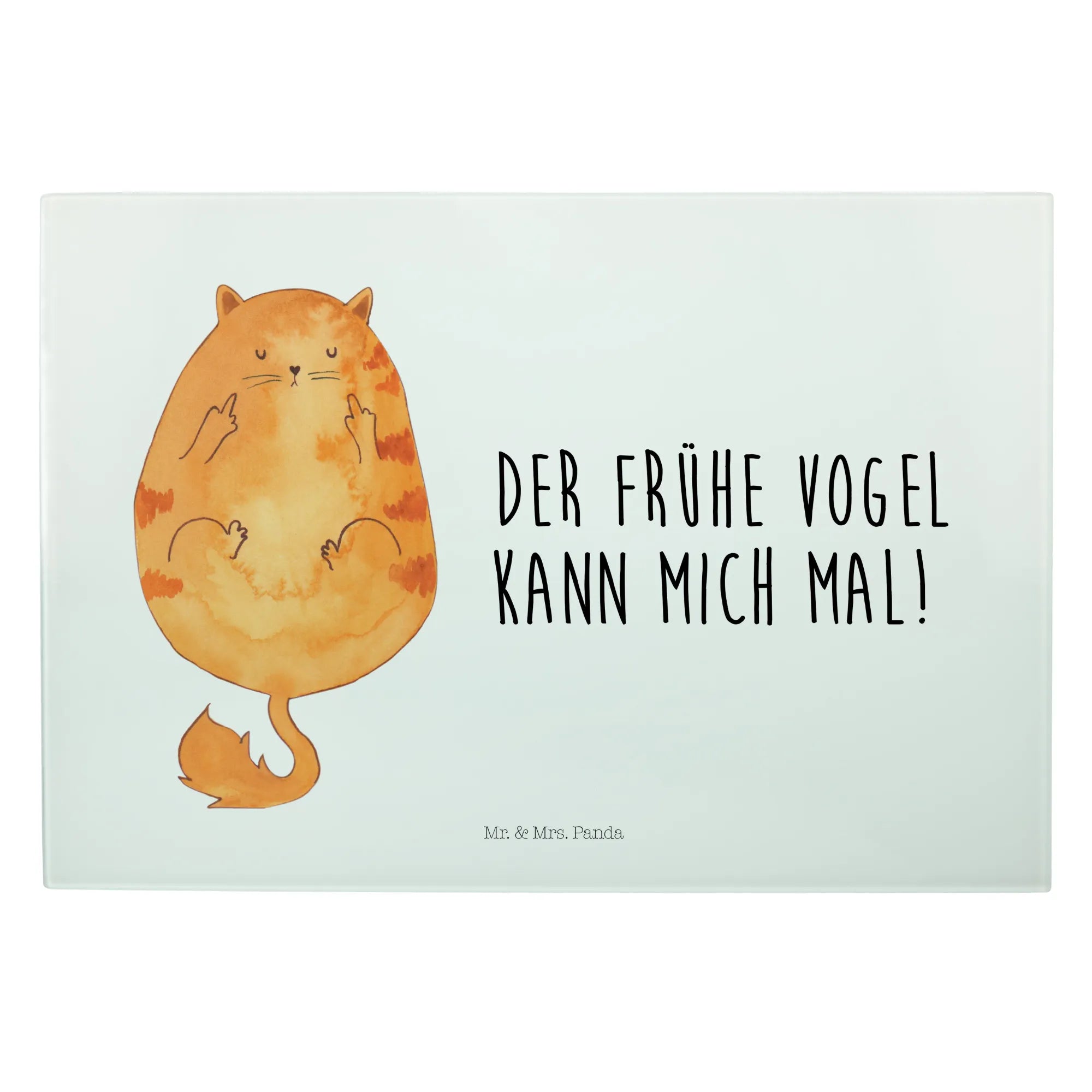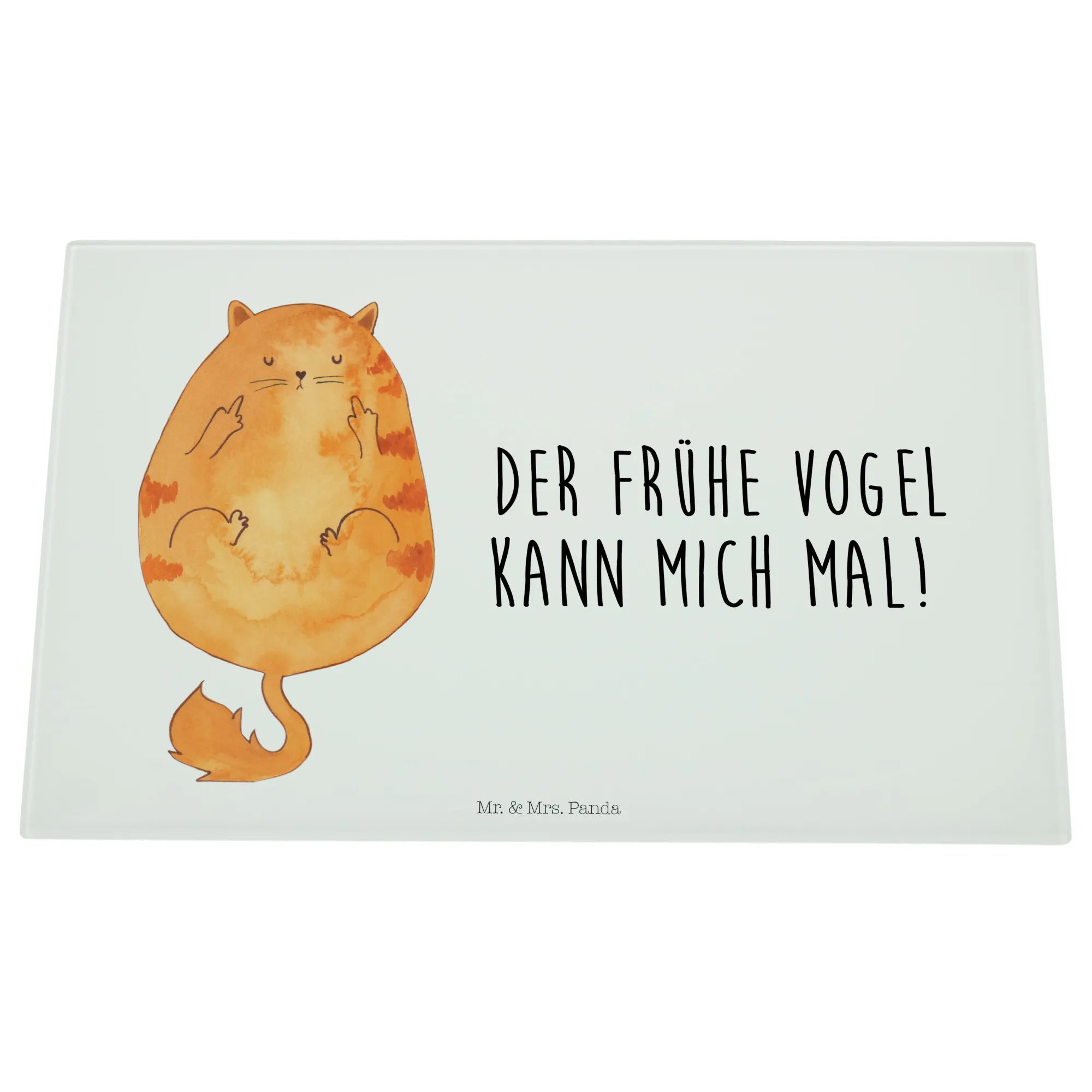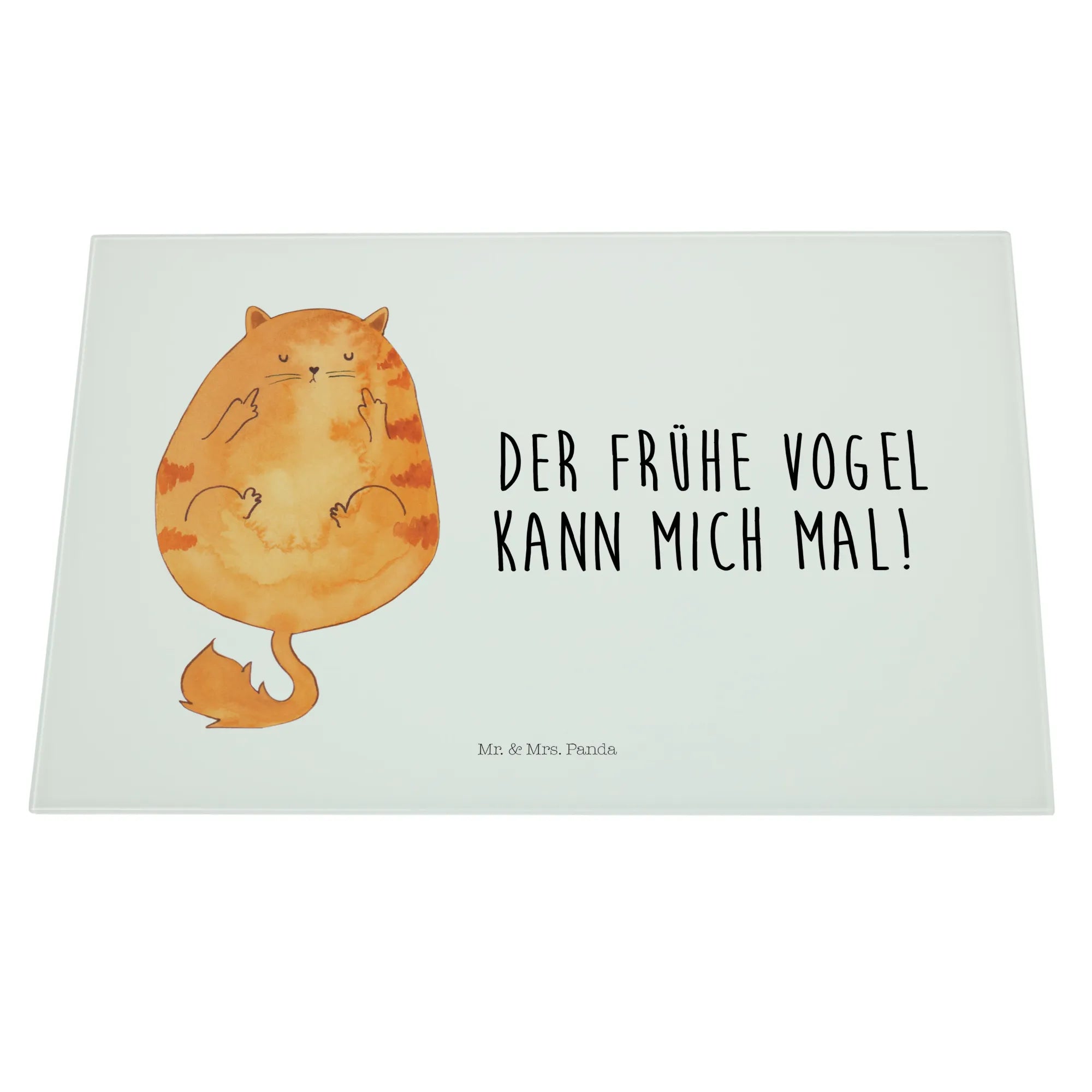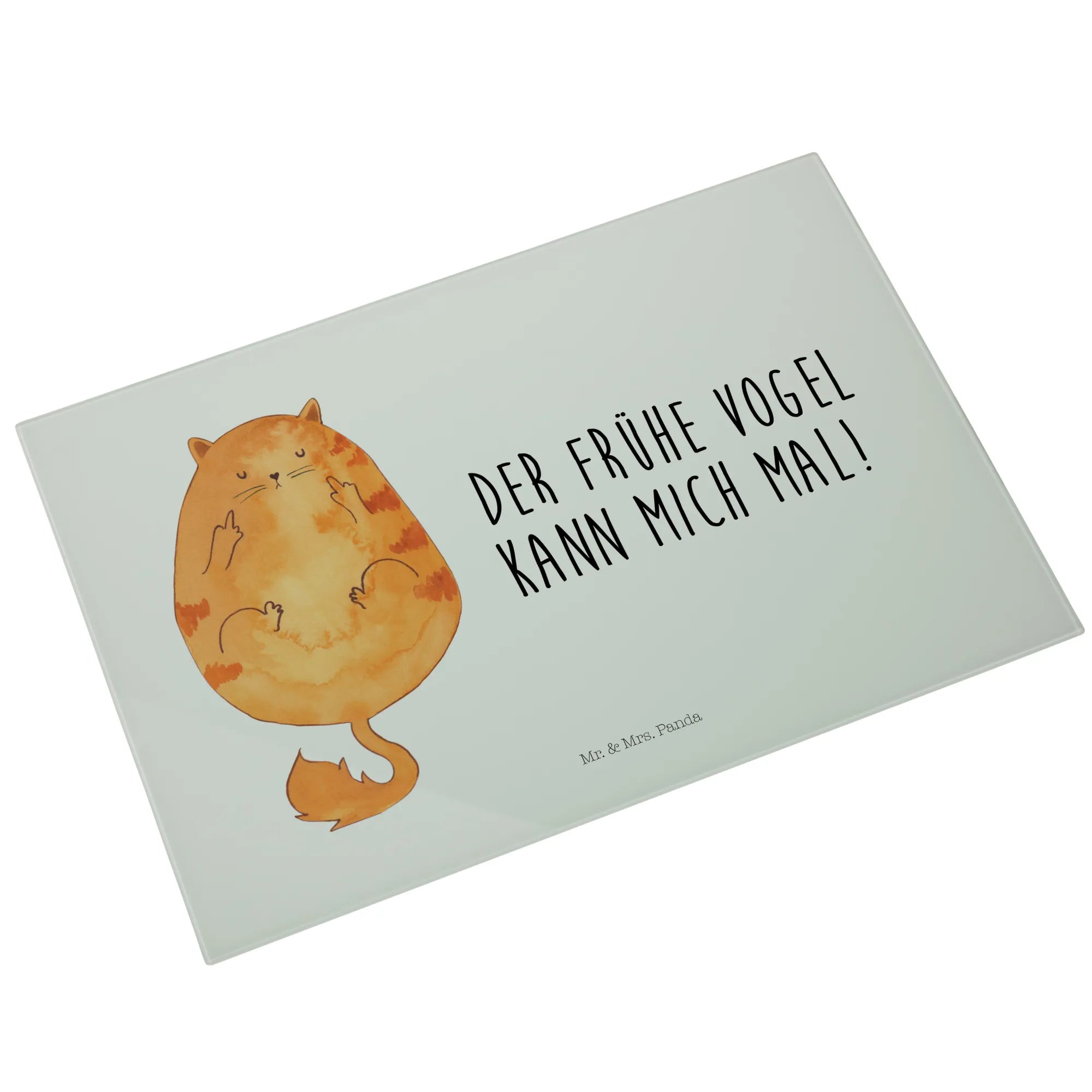 Entdecke unser einzigartiges und stabiles XL Glas Schneidbrett "Katze Frühaufsteher" aus der exklusiven Katzen-Kollektion von Mr. & Mrs. Panda!
