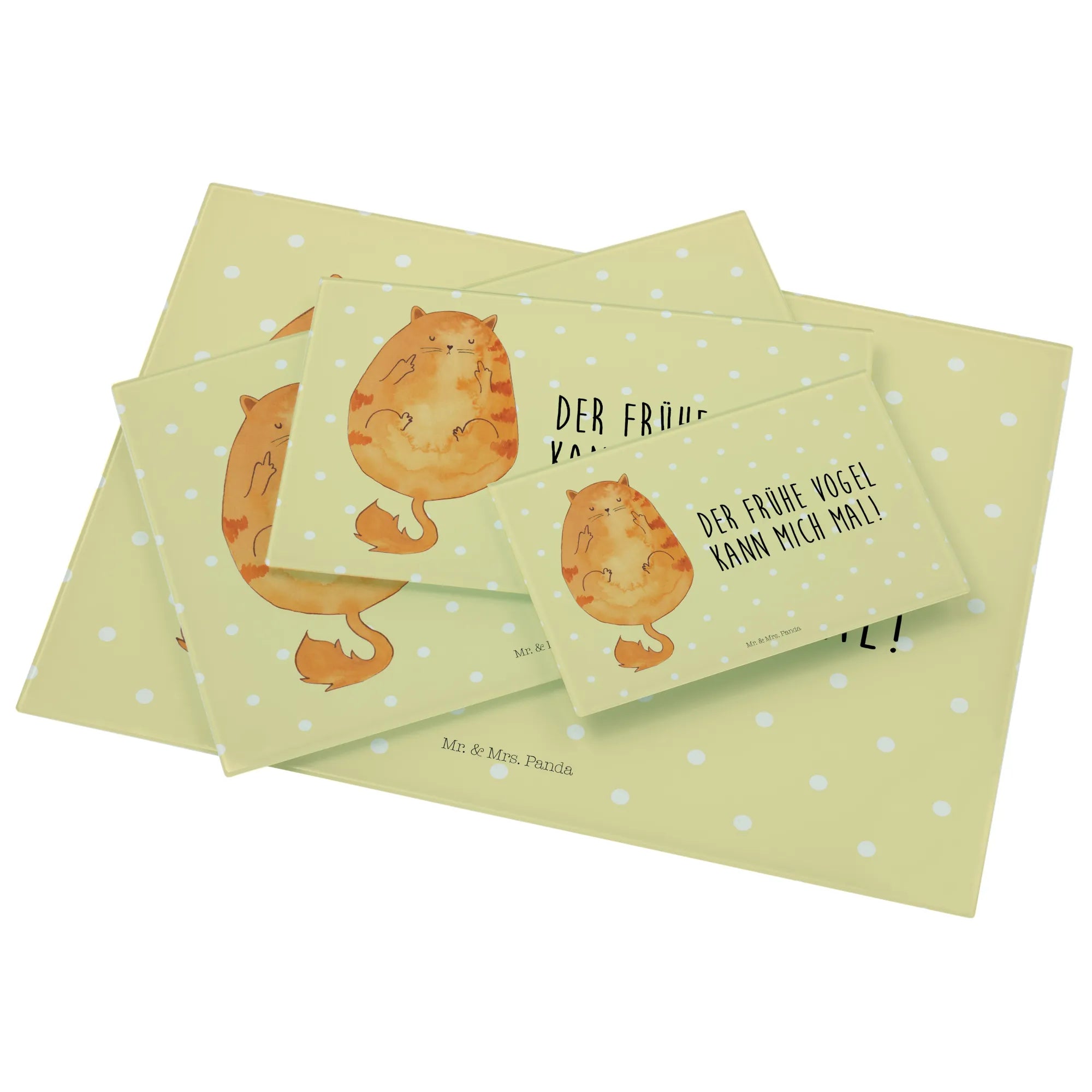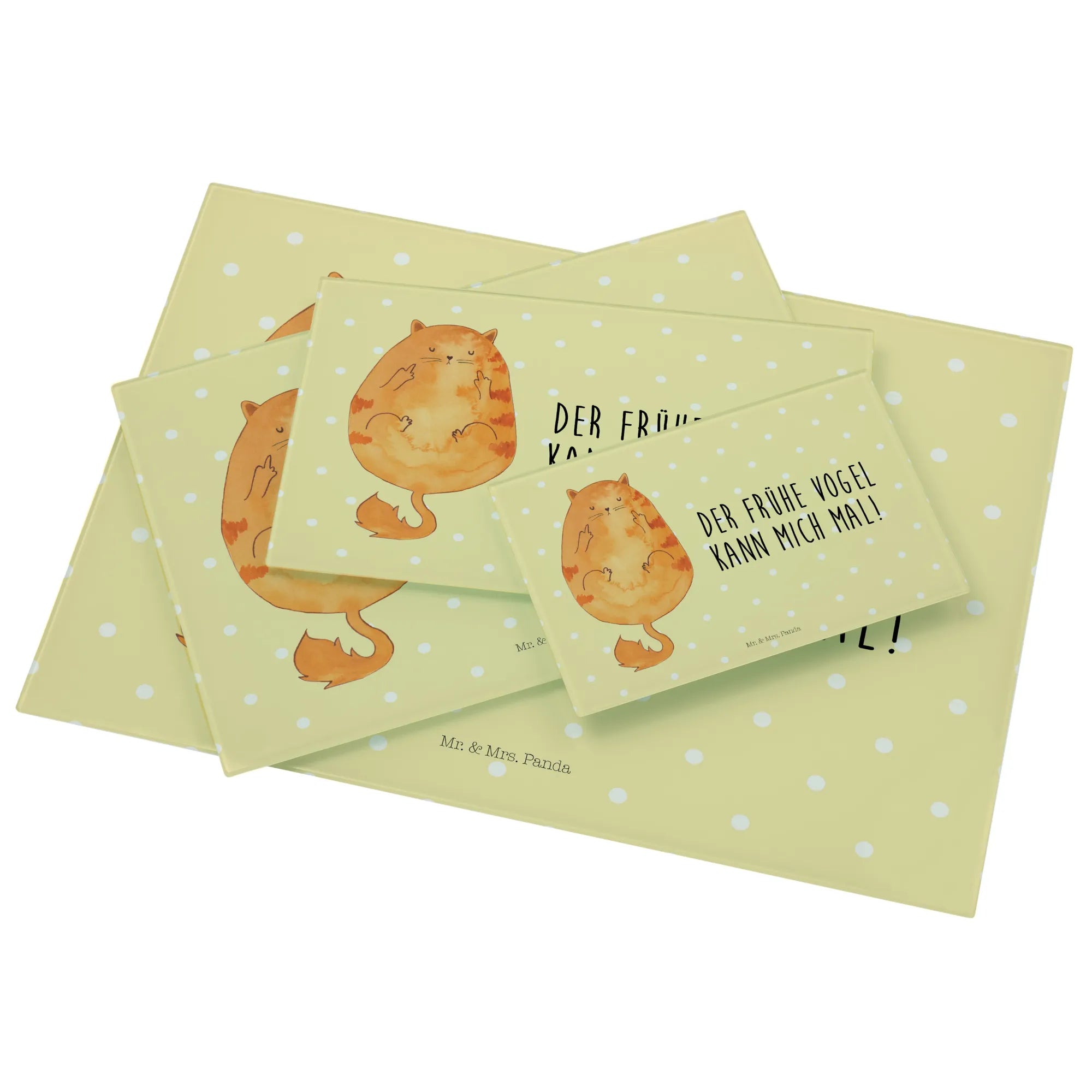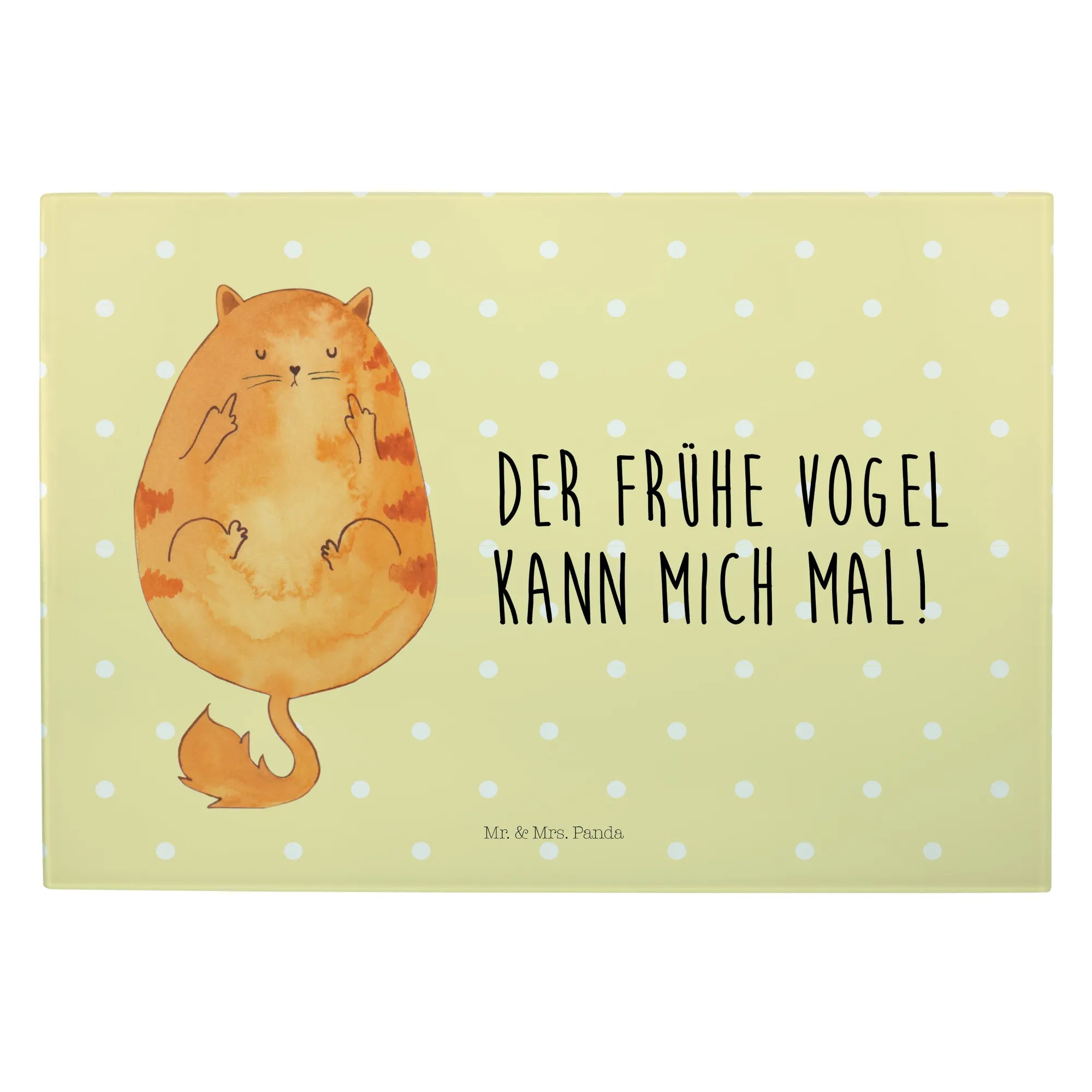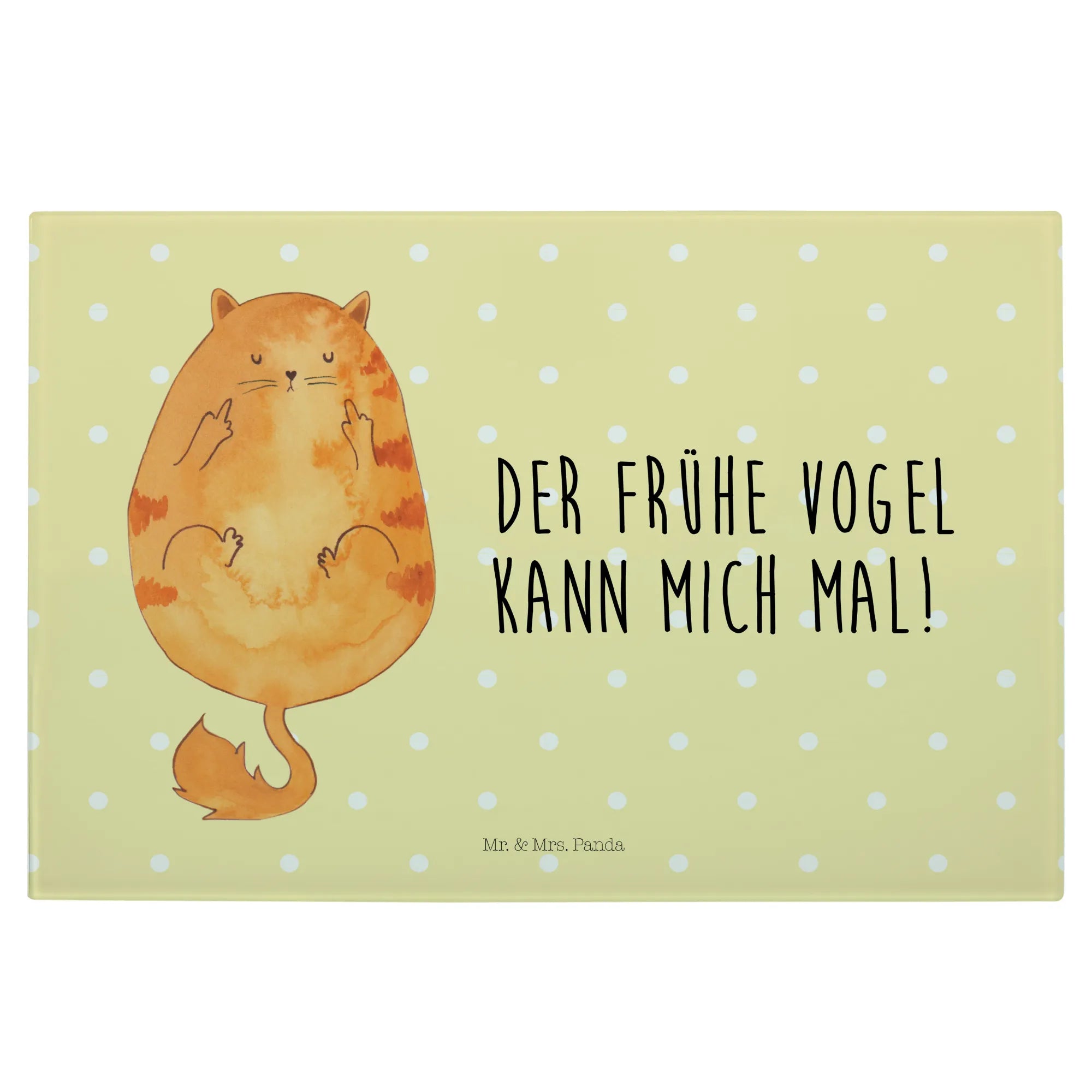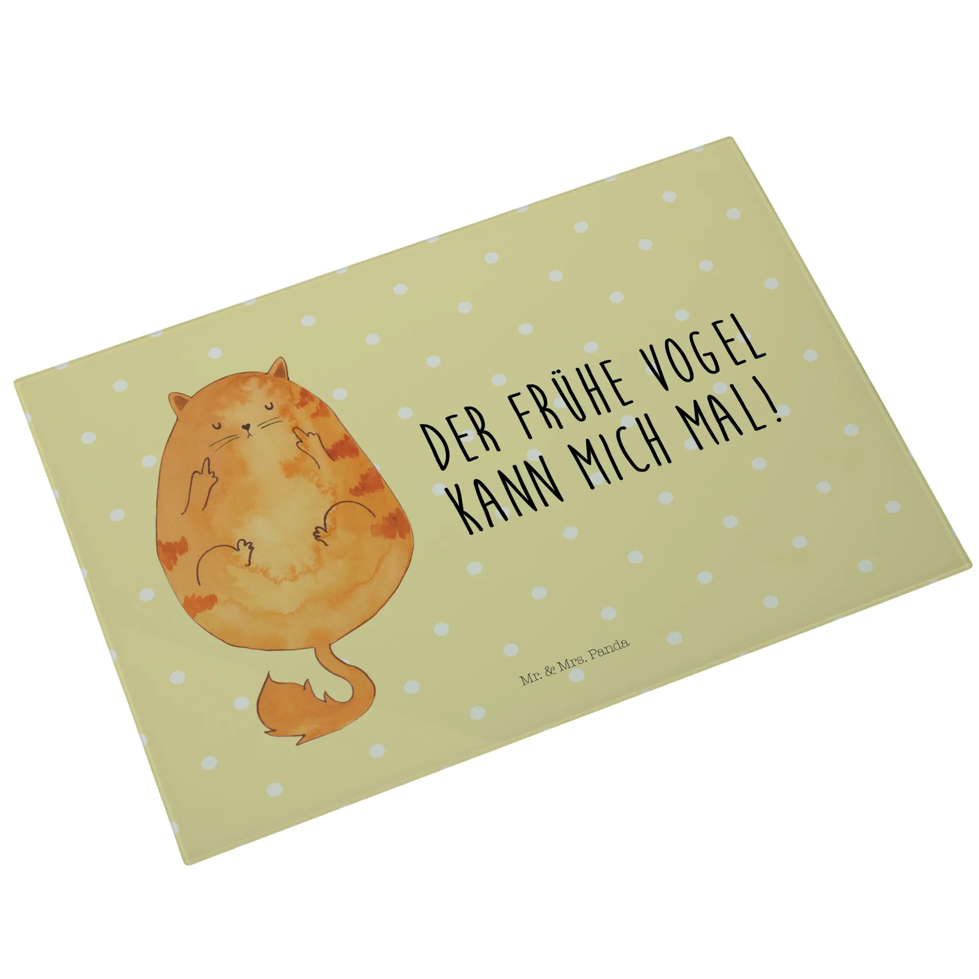 Entdecke unser einzigartiges und stabiles XL Glas Schneidbrett "Katze Frühaufsteher" aus der exklusiven Katzen-Kollektion von Mr. & Mrs. Panda!