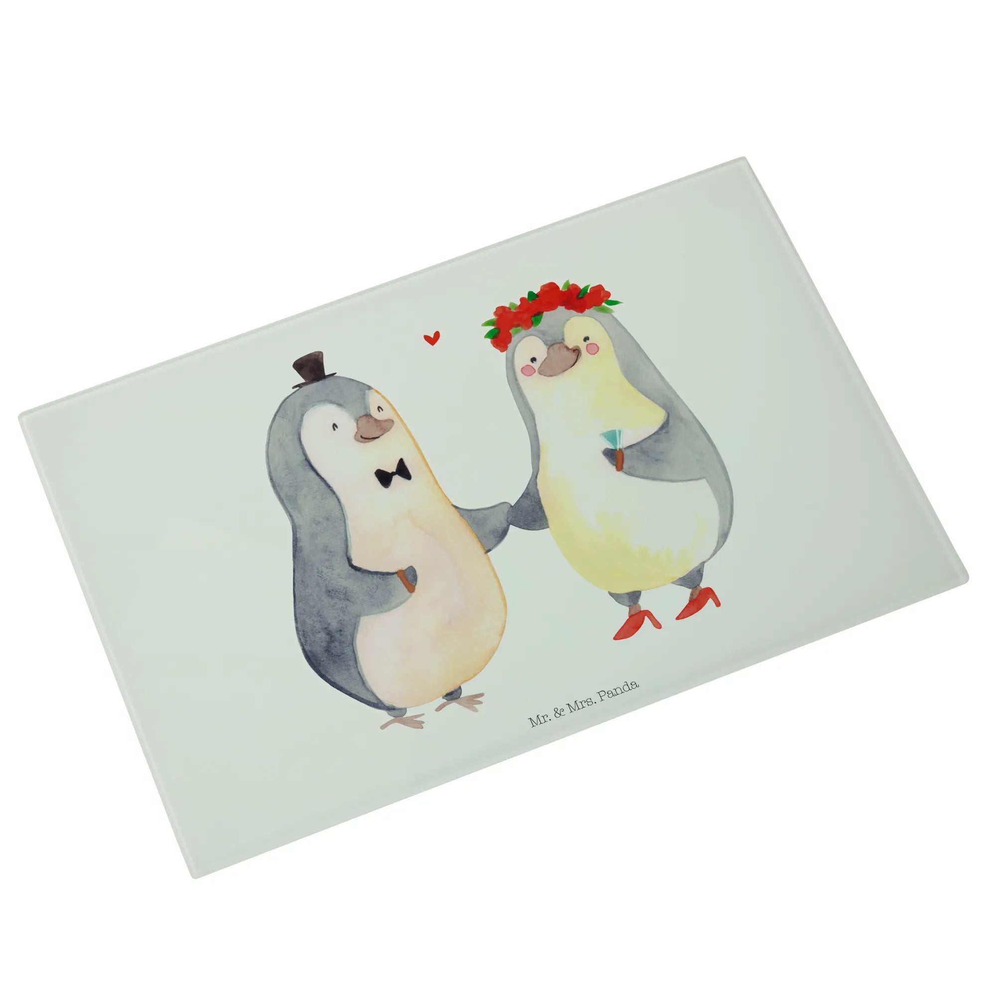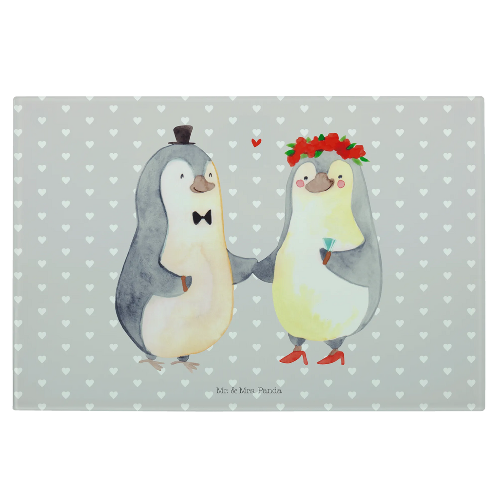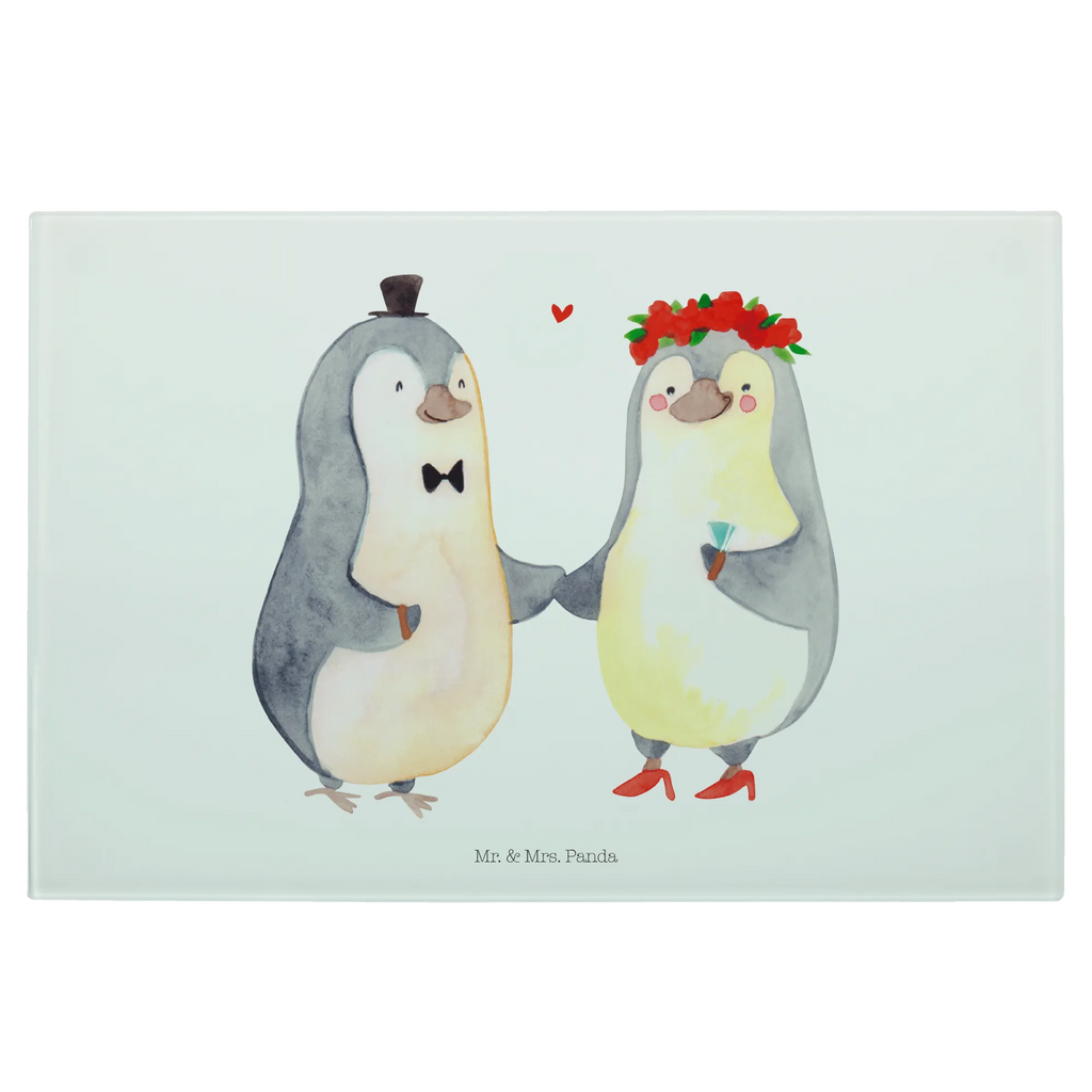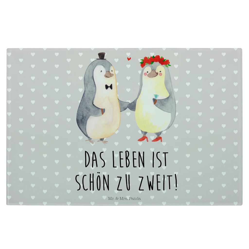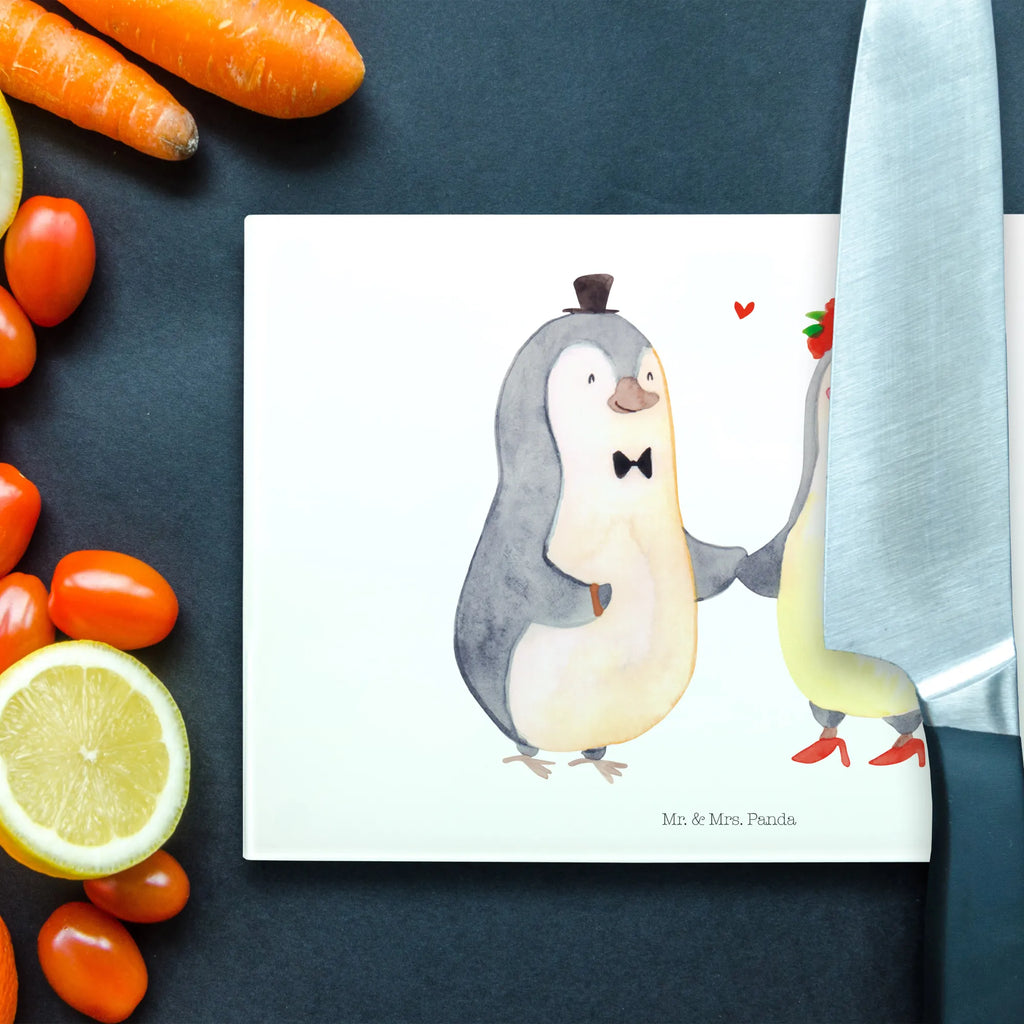 Das perfekte Geschenk für Verliebte und frisch Vermählte – unser XL Glas Schneidbrett mit dem herzerwärmenden Pinguin Heirat-Motiv aus der Liebe Kollektion von Mr. & Mrs. Panda!