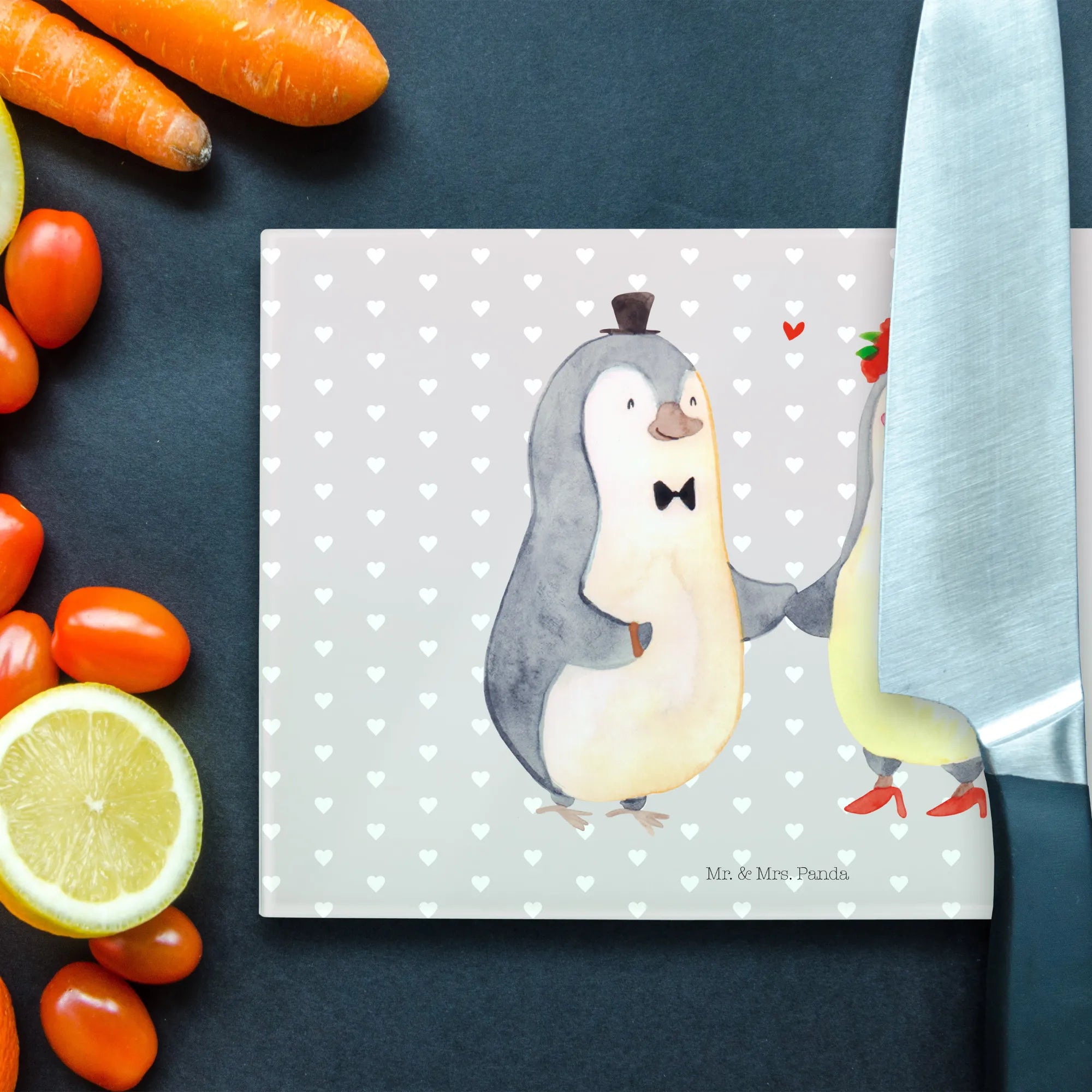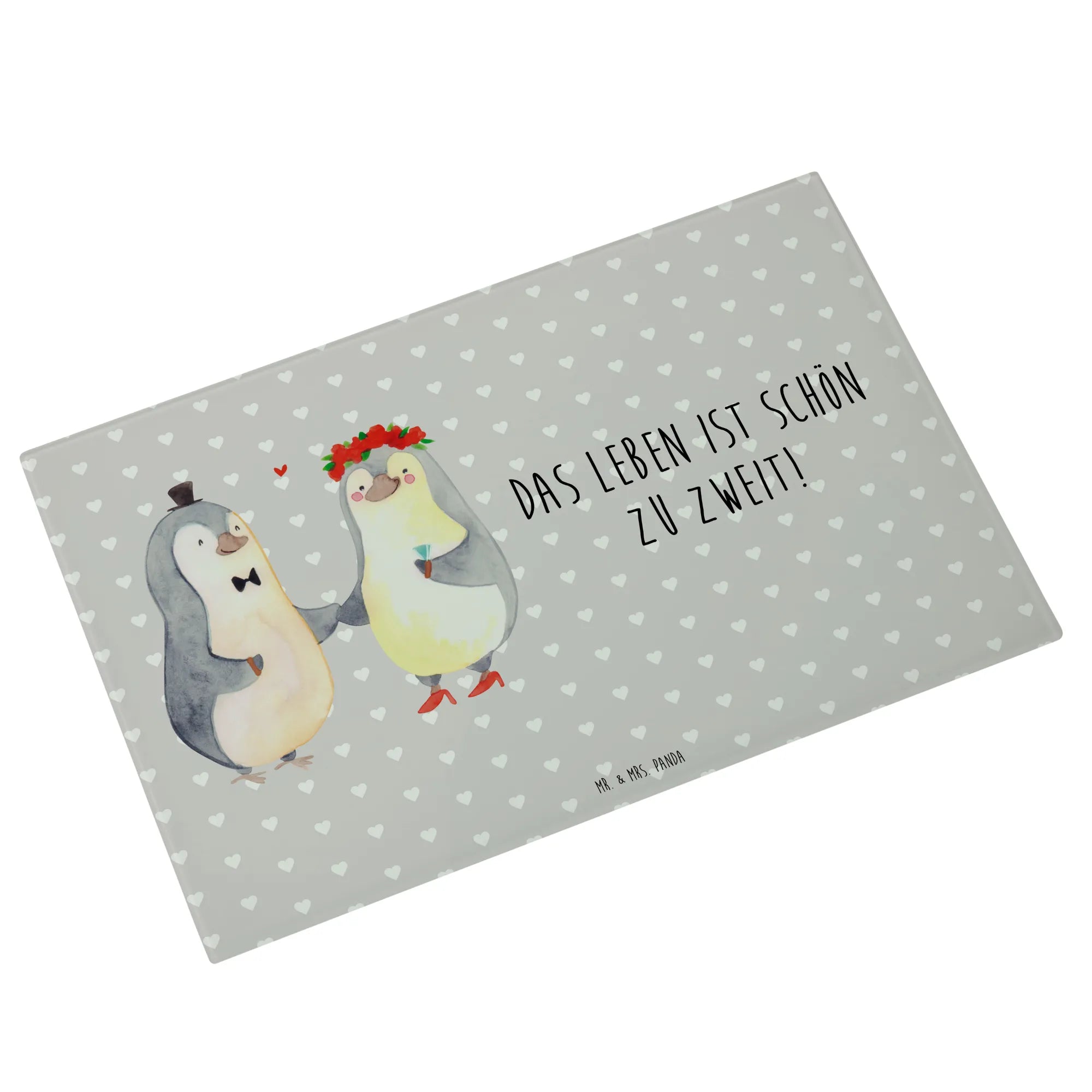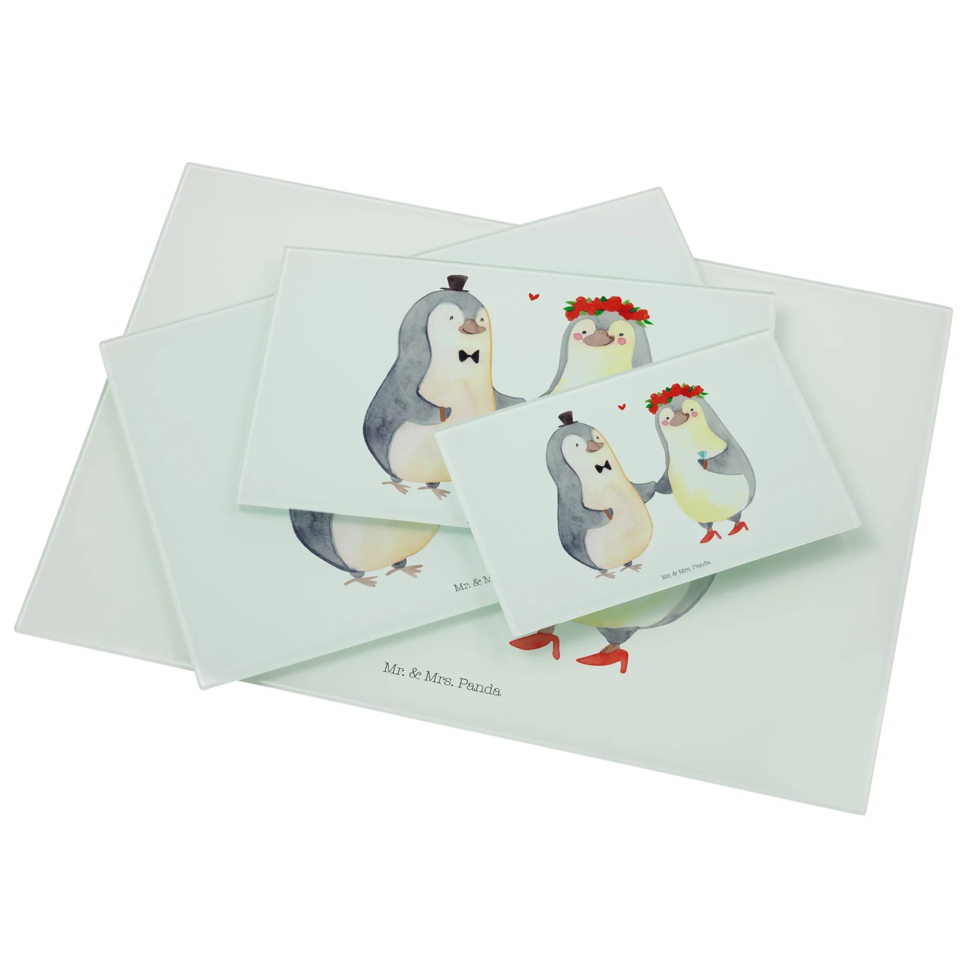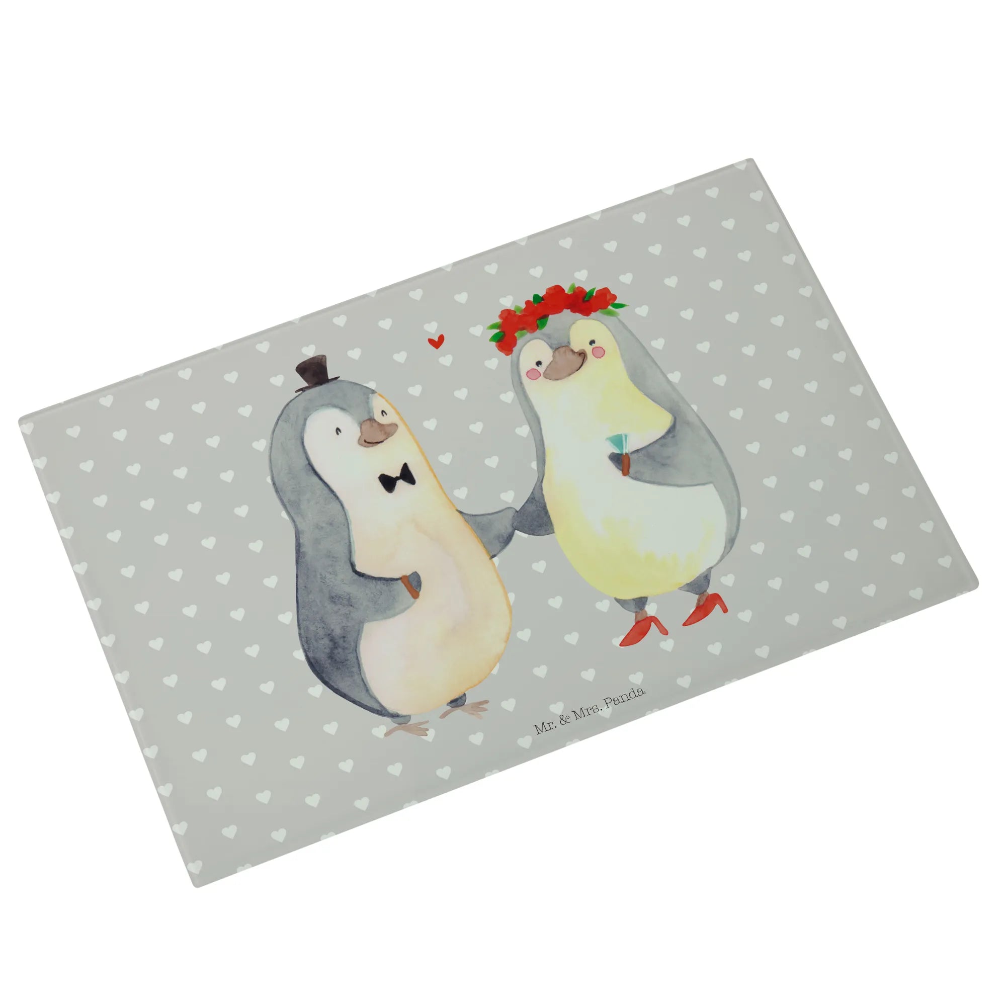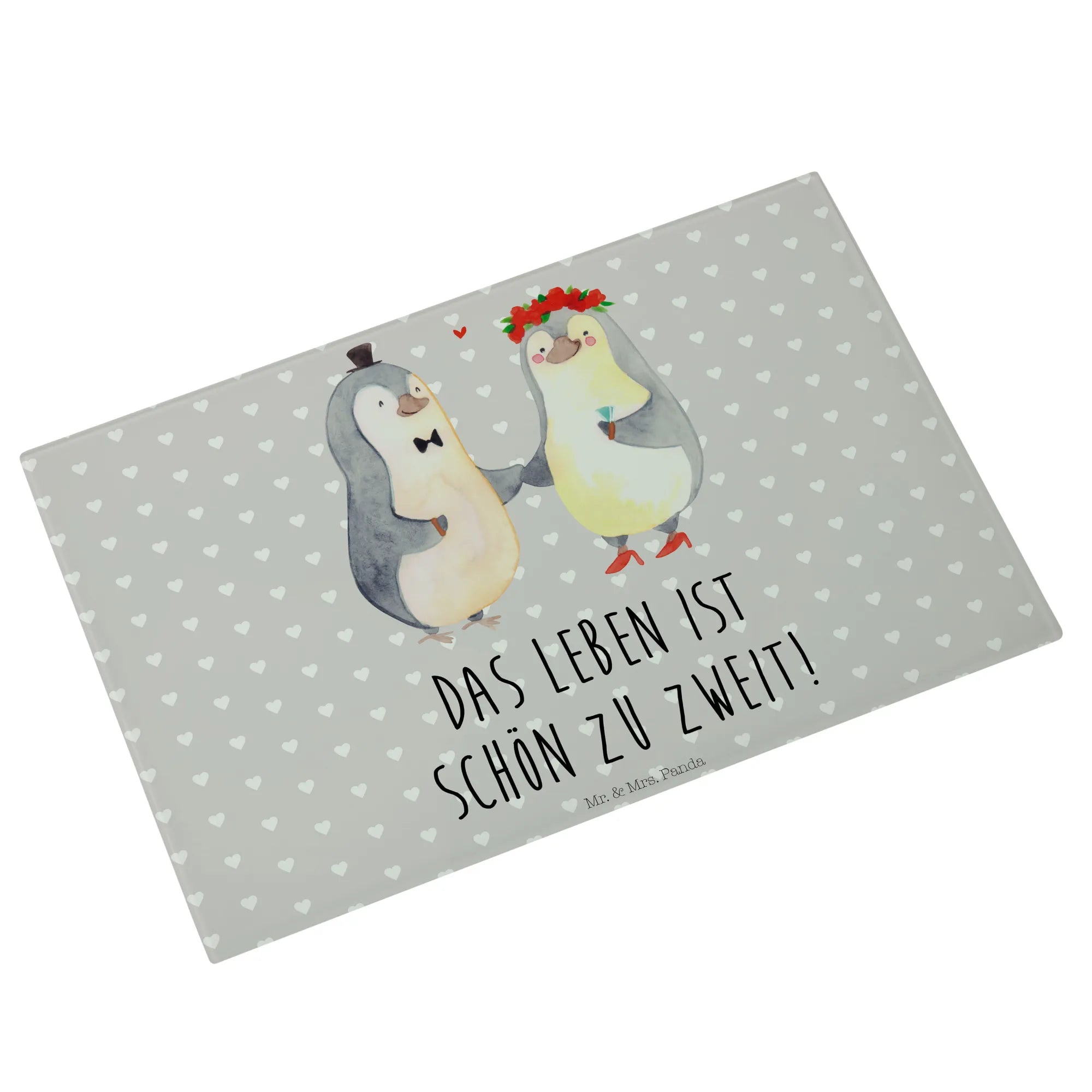 Das perfekte Geschenk für Verliebte und frisch Vermählte – unser XL Glas Schneidbrett mit dem herzerwärmenden Pinguin Heirat-Motiv aus der Liebe Kollektion von Mr. & Mrs. Panda!