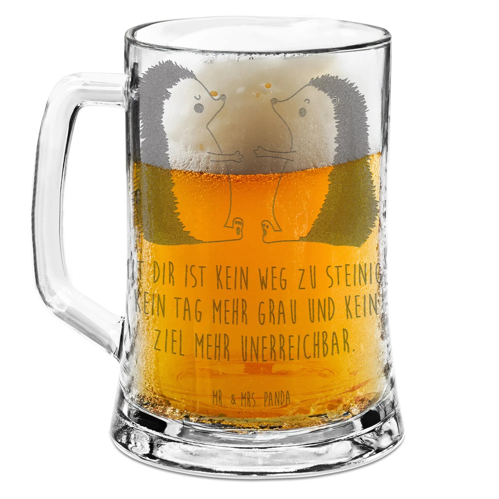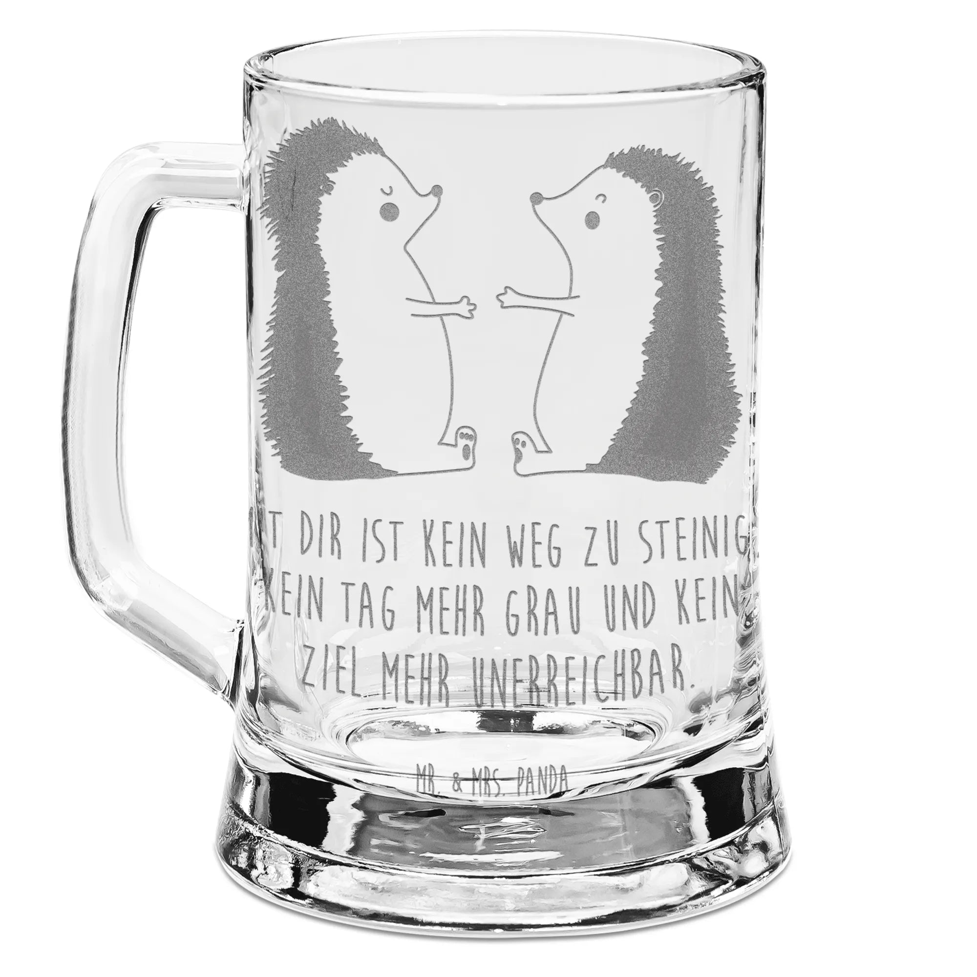 Der wunderschöne Gravur Bierkrug "Igel Liebe" von Mr. & Mrs. Panda ist das ideale Geschenk für all die Bierliebhaber da draußen! Egal ob für deinen Freund, deine Freundin, deinen Ehemann oder Ehefrau, dieser liebevoll gestaltete Bierkrug wird die Herzen höher schlagen lassen. Mit einem bezaubernden Motiv von niedlichen, verliebten Igeln verfügt der Krug über eine besonders berührende Botschaft: "Mit dir ist kein Weg zu steinig, kein Tag mehr grau und kein Ziel mehr unerreichbar." Verschenke diesen einzigartigen Bierkrug zu besonderen Anlässen wie dem Jahrestag, Hochzeitstag, zur Verlobung oder einfach nur als überraschendes Liebesgeschenk!