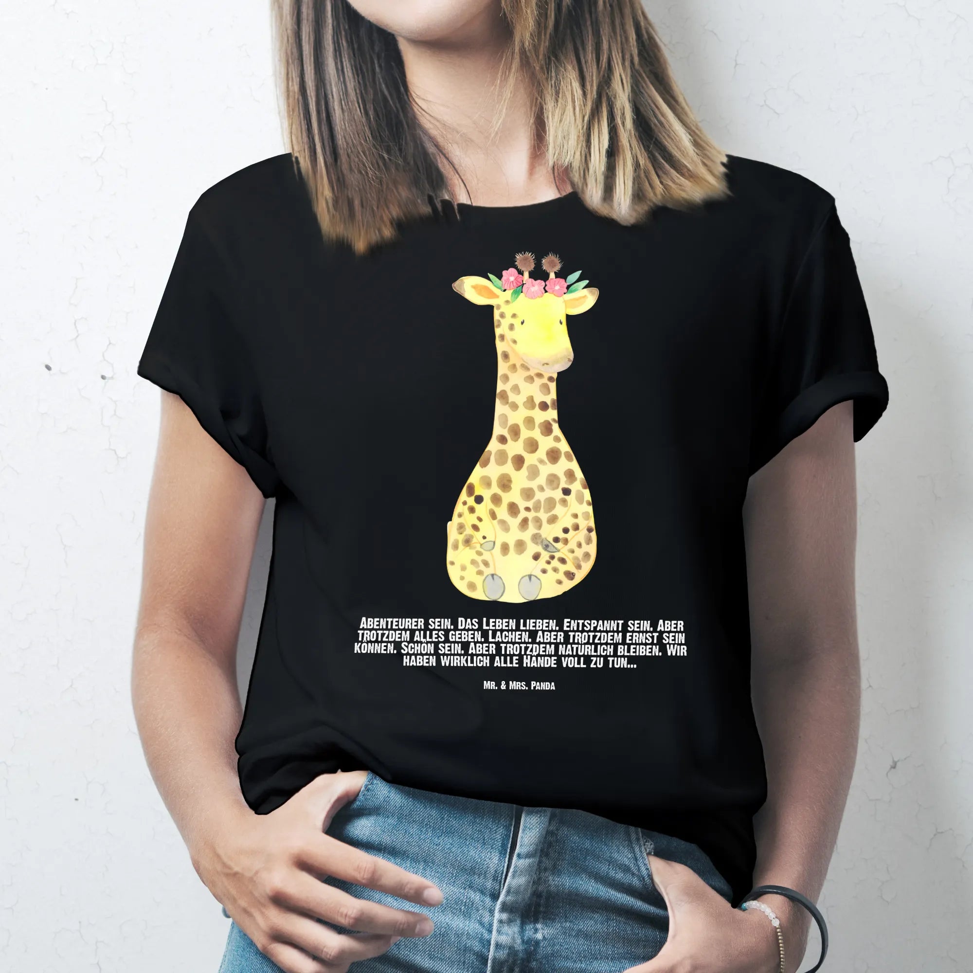Da das Motiv in liebevoller Handarbeit von der talentierten Mrs. Panda gestaltet wurde, strahlt es eine persönliche Note aus, die es zu einem ganz besonderen Geschenk macht. Die Kombination aus dem einzigartigen Giraffenmotiv, dem bunten Blumenkranz und dem ansprechenden Slogan wird jeden begeistern und das Tragen zu einem wunderbaren Erlebnis machen.