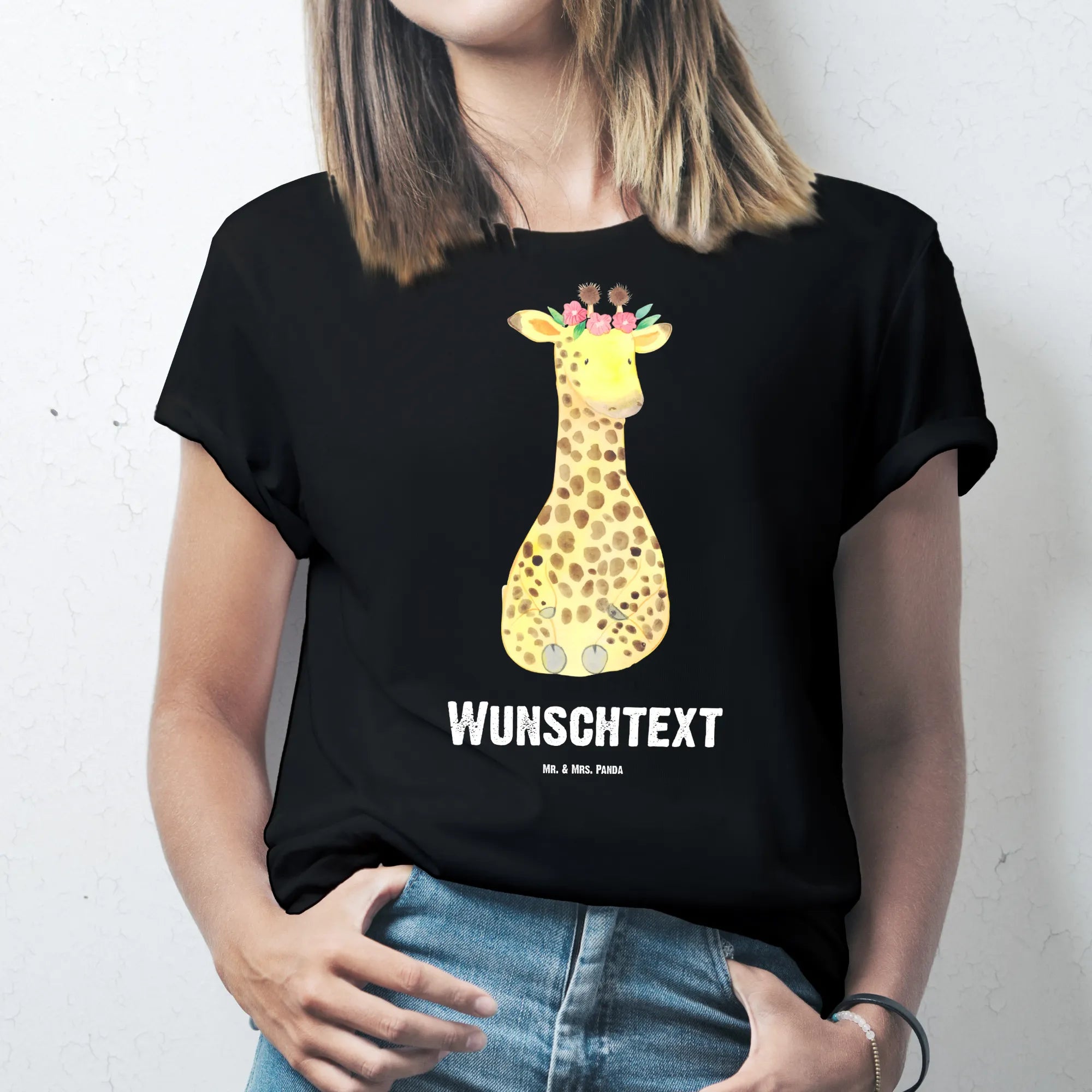 Größe L Personalisiertes T-Shirt – Giraffe mit Blumenkranz | Afrika Kollektion