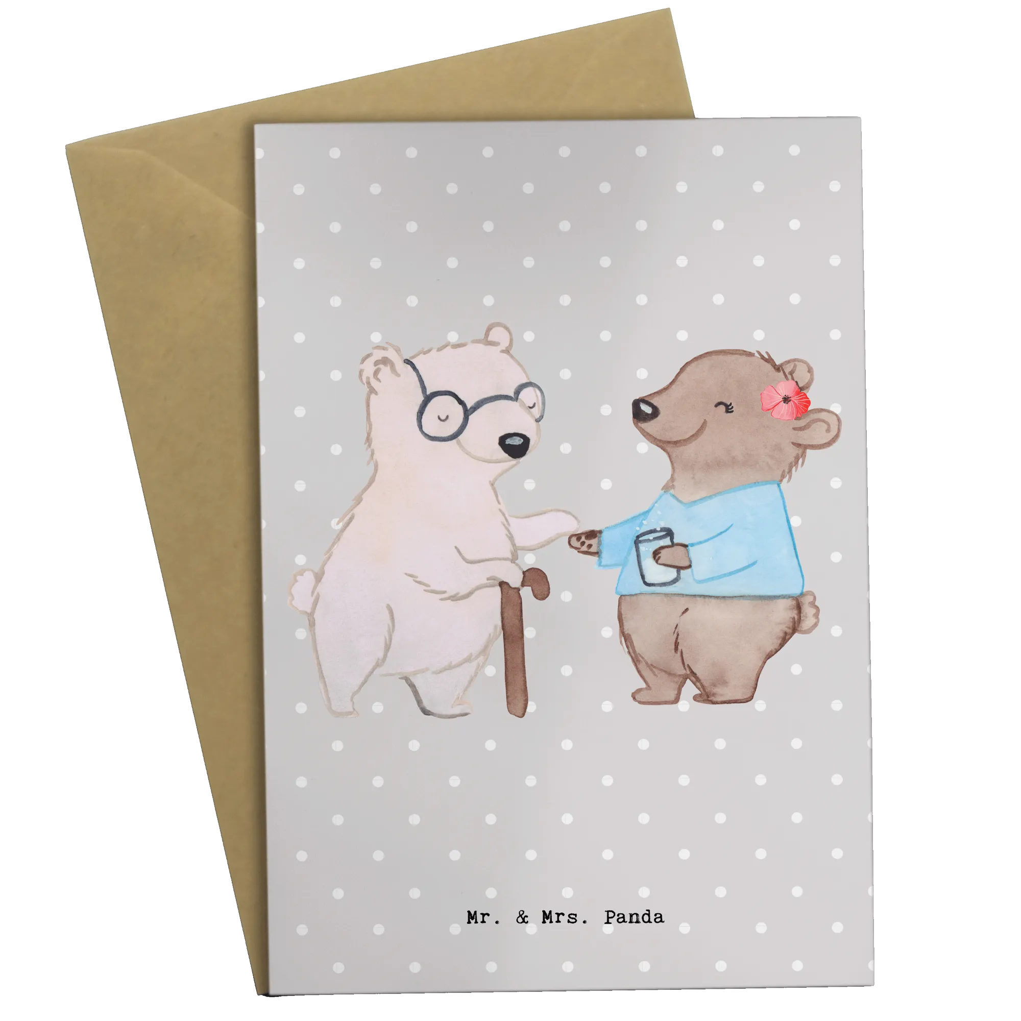 Herzensgrüße für Pflegerinnen: Die Grußkarte „Altenpflegerin mit Herz“ von Mr. & Mrs. Panda ist die liebevolle Art, Danke zu sagen. Das sanfte Aquarell-Motiv zeigt einen fürsorglichen Bären, der einer älteren Figur die Hand reicht und symbolisiert Wärme, Respekt und Mitgefühl.