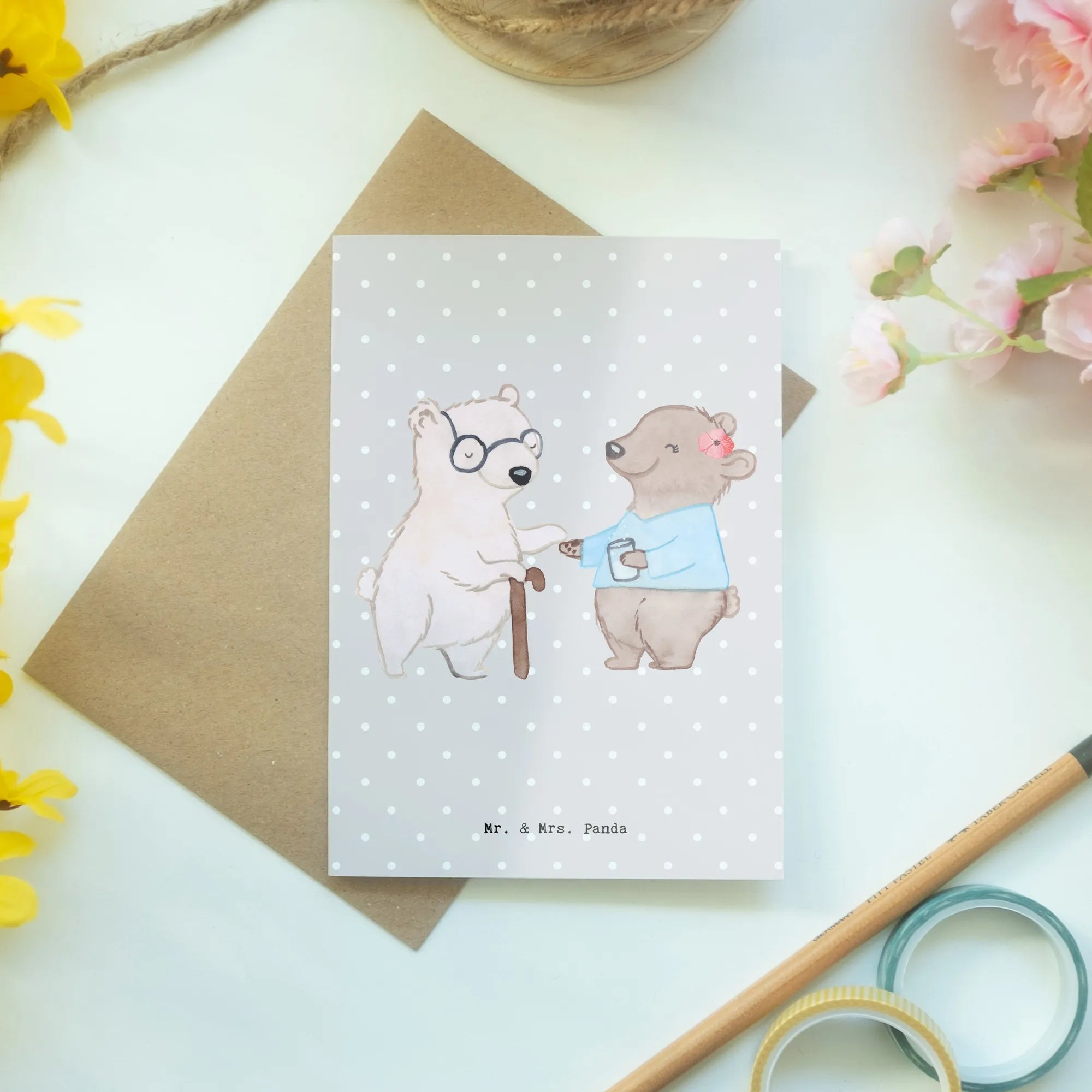 Willkommen in der zauberhaften Welt von Mr. & Mrs. Panda! Unsere Grußkarte "Altenpflegerin mit Herz" aus der besonderen Sammlung Berufe ist das perfekte Geschenk für all die wunderbaren Altenpflegerinnen, die sich tagtäglich für das Wohl der älteren Generation einsetzen. Diese süße Karte ist nicht nur ein Ausdruck der Dankbarkeit, sondern auch eine kleine Aufmunterung im Berufsalltag. Mit einem liebevoll handgezeichneten Motiven, das einen niedlichen Bär zeigt, der einer älteren Bärin mit einem Krückstock eine Hand reicht, transportiert diese Karte nicht nur ein Willkommen, sondern auch Wärme und Wertschätzung.