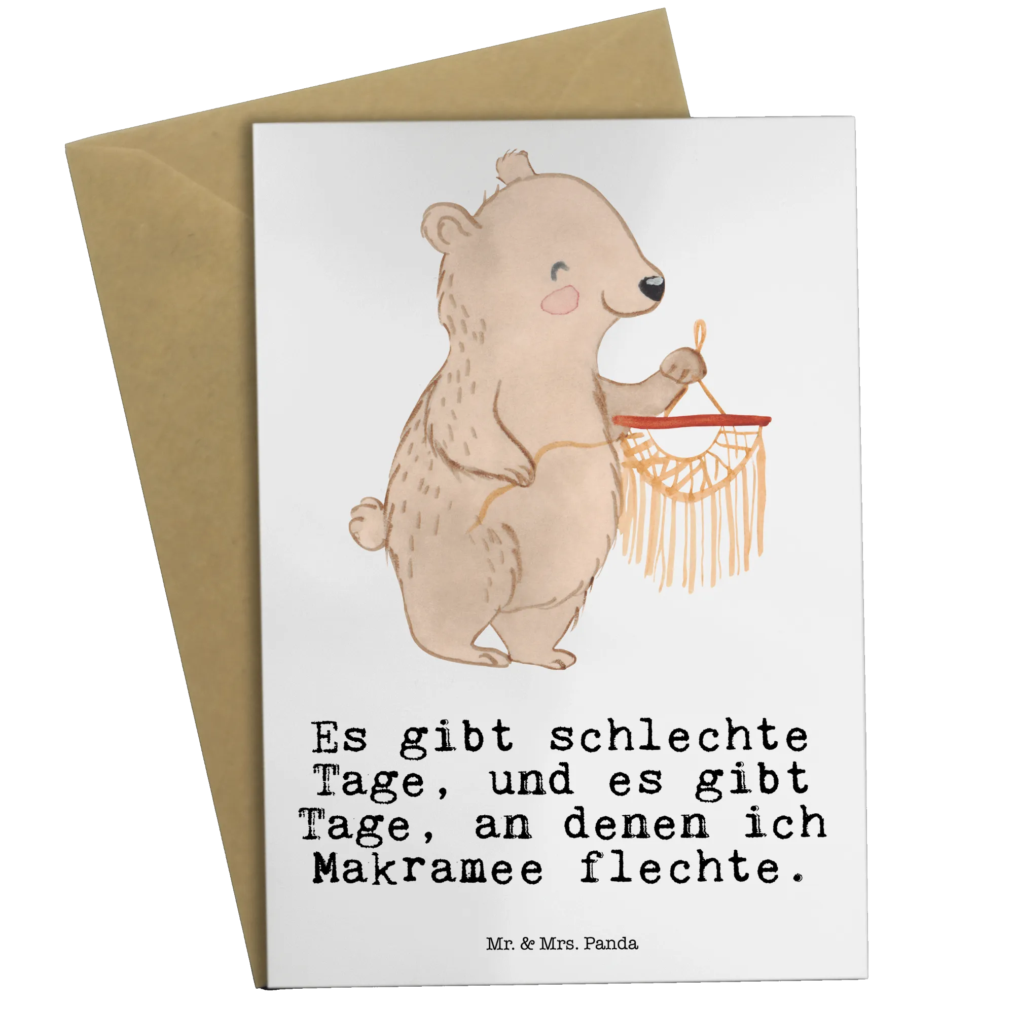 Die Grußkarte "Bär Makramee Tage" von Mr. & Mrs. Panda ist das perfekte Geschenk für alle Hobby- und Sportbegeisterten in Deinem Leben! Mit dem niedlichen Motiv eines Bären, der stolz sein Makramee-Werk präsentiert, zaubert diese Karte jedem ein Lächeln ins Gesicht. Egal ob zu Geburtstag, Hochzeit oder einfach nur um Danke zu sagen – diese Karte bietet die ideale Möglichkeit, persönliche Glückwünsche zu übermitteln.