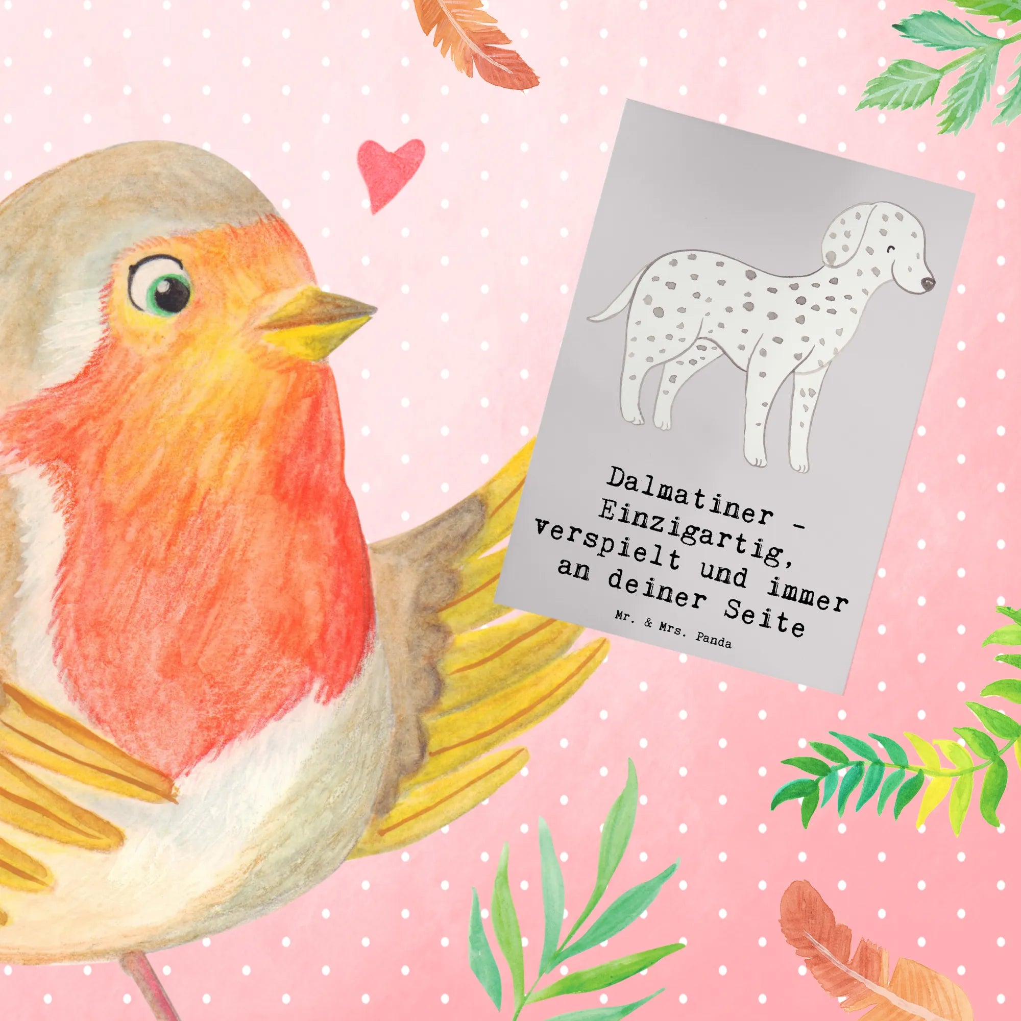 Suchst du das perfekte Geschenk für einen Hundefan? Dann ist die Grußkarte mit dem wundervollen Dalmatiner-Motiv von Mr. & Mrs. Panda genau das Richtige für dich! Diese einzigartige Karte aus der speziellen Kollektion „Hunderassen“ überzeugt nicht nur durch ihr ansprechendes Design, sondern auch durch ihre Vielseitigkeit. Mit dem Spruch "Dalmatiner - Einzigartig, verspielt und immer an deiner Seite" spricht sie das Herz eines jeden Hundeliebhabers.