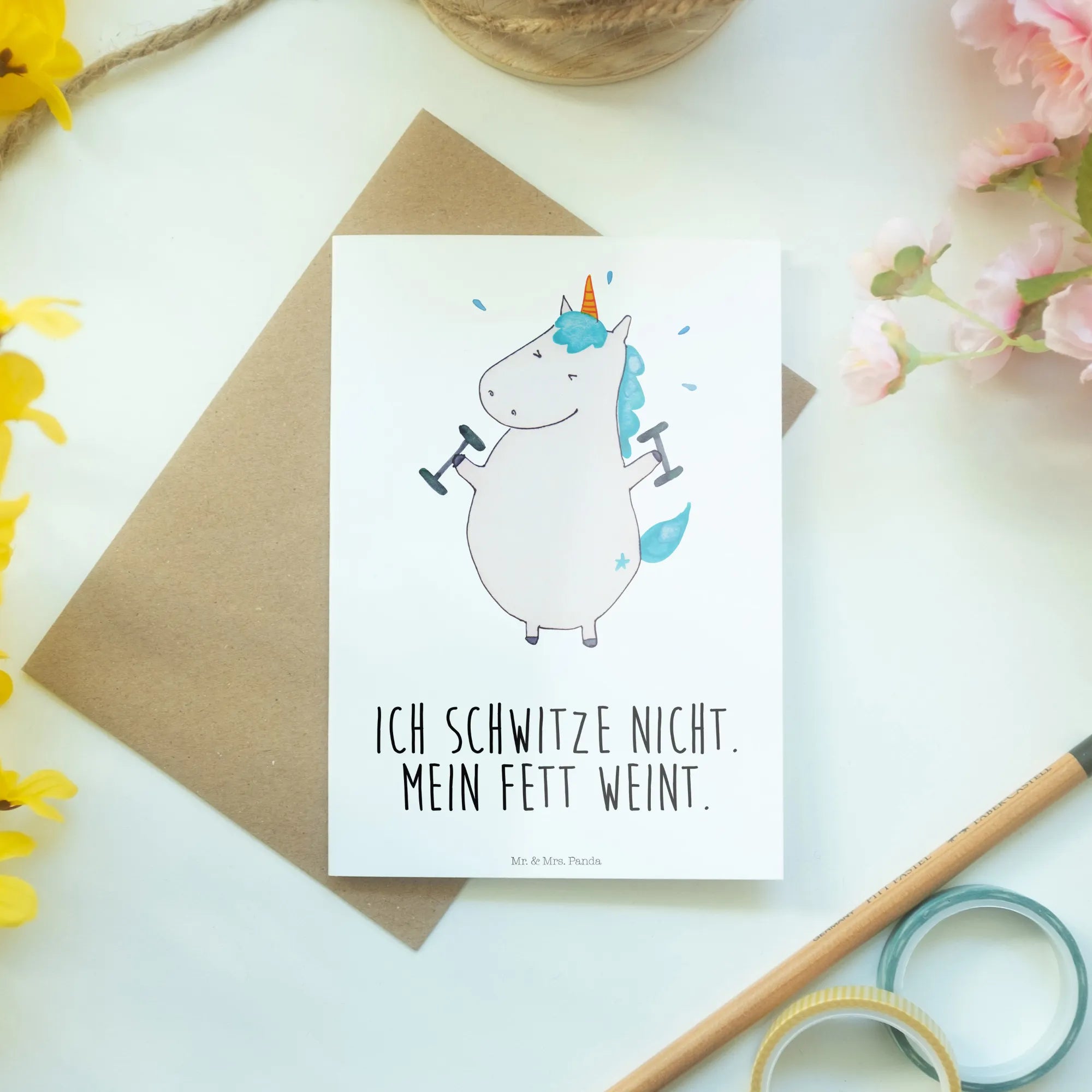 \nWenn Du auf der Suche nach einer Karte für einen besonderen Anlass bist und Einhörner liebst, ist das Fitness-Einhorn genau das Richtige für Dich! Egal ob Geburtstagskarte, Hochzeitskarte oder einfach nur ein Gruß – zeige Deine Liebe mit dieser zauberhaften Karte. Die Einhorn - Kollektion von Mr. & Mrs. Panda bietet viele weitere hübsche Produkte, die dein Herz höher schlagen lassen!