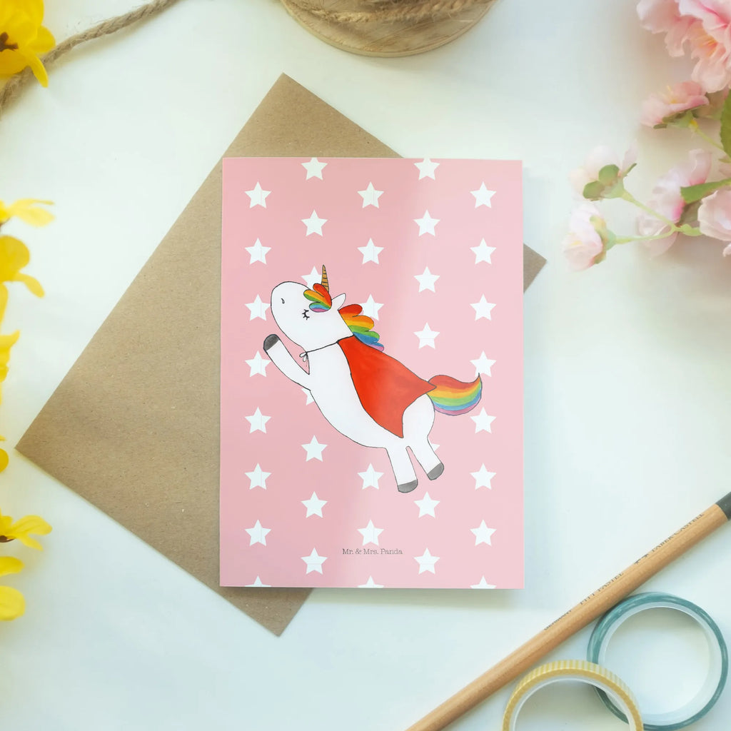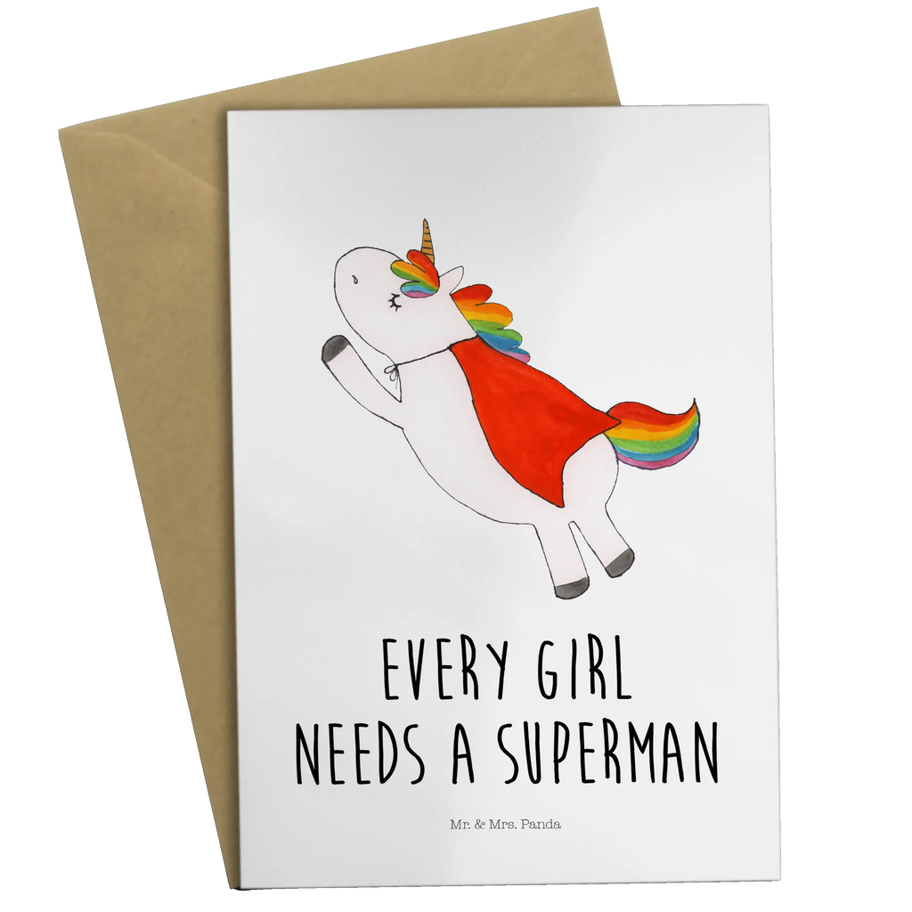 Die wunderschöne Grußkarte "Einhorn Super" von Mr. & Mrs. Panda ist das perfekte Geschenk für alle Mädchen und jungen Frauen, die an die Magie der Einhörner glauben. Jedes kleine Mädchen braucht einen Superhelden, und was könnte besser sein als ein strahlendes Einhorn, das in seinem Kostüm die Welt rettet?
