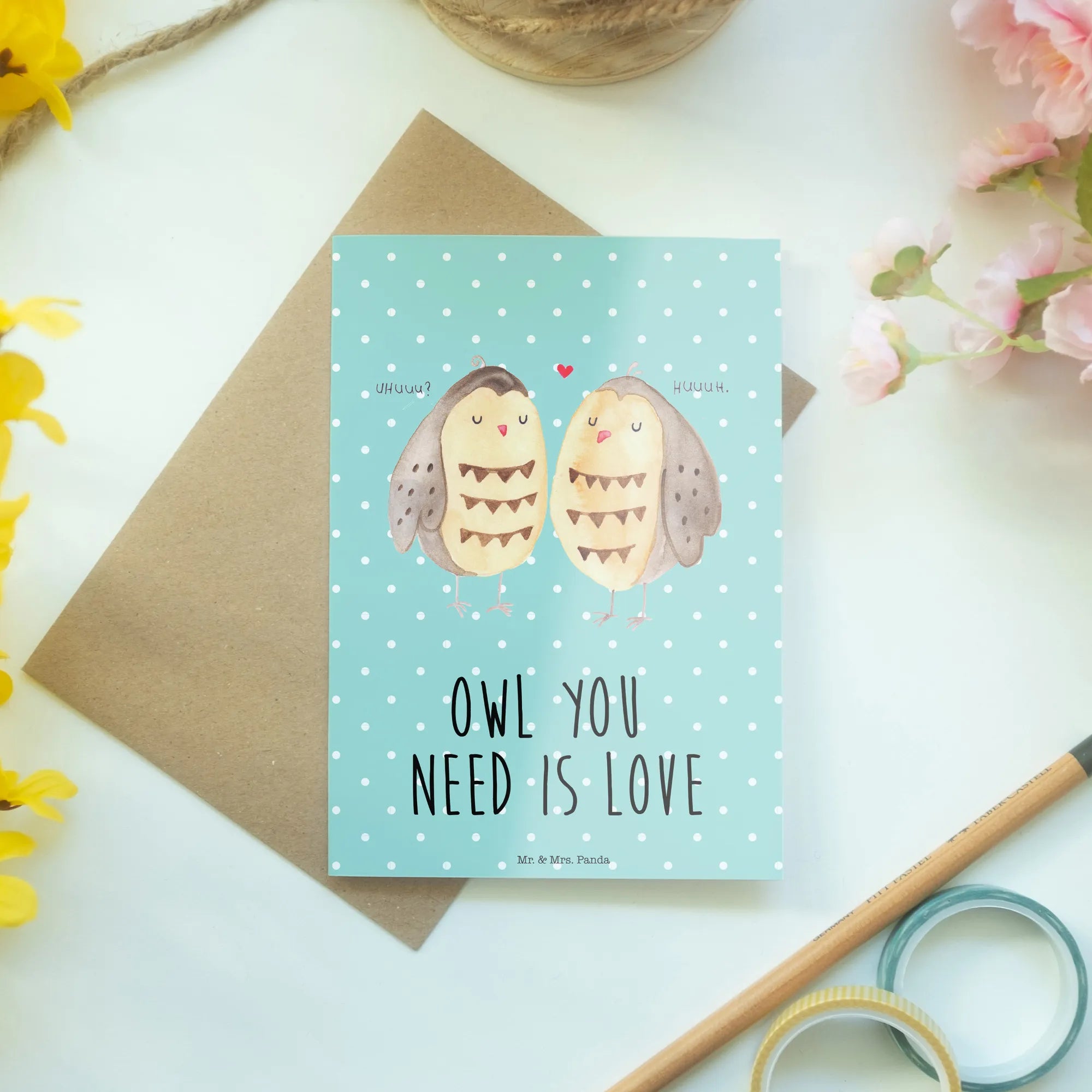 Diese wunderschöne und einzigartige Grußkarte von Mr. & Mrs. Panda ist das perfekte Geschenk für alle Eulenliebhaber und romantischen Seelen. Das Motiv der Eule Liebe zeigt zwei niedliche, verliebte Eulen, die gemeinsam auf einem Ast sitzen und das Leben genießen. Mit dem zauberhaften Slogan "Owl you need is love" zeigst Du auf charmante Weise Deine Zuneigung zu Freunden oder Deinem Partner.