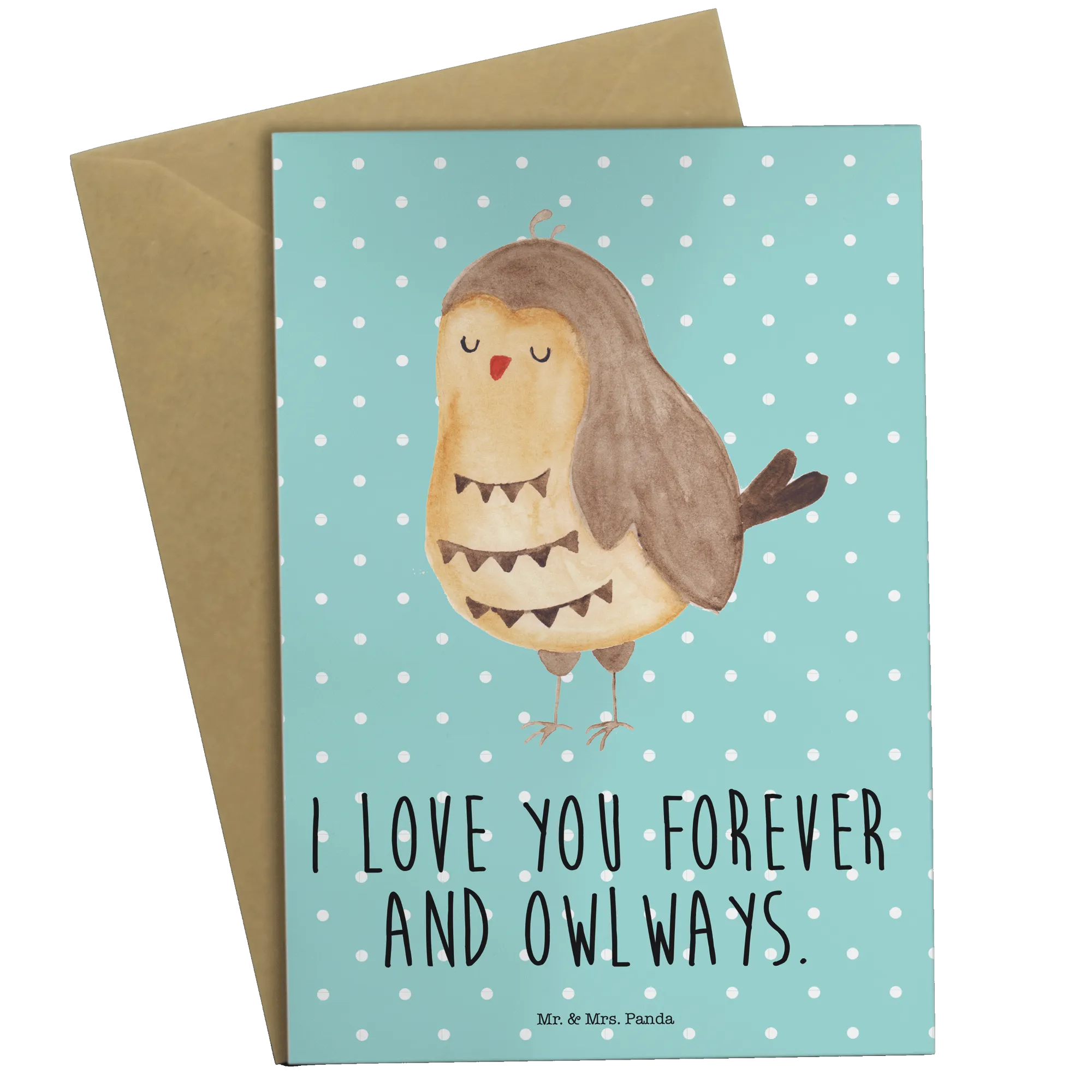 Die liebevolle Grußkarte Eule Zufrieden von Mr. & Mrs. Panda ist das perfekte Geschenk für all jene, die einer besonderen Person eine Freude machen möchten! Egal ob zum Geburtstag, Hochzeitstag oder einfach nur so - diese Karte enthält den zauberhaften Spruch "I love you forever and owlways" und wird garantiert für Herzklopfen sorgen. Mit einer niedlichen Eule, die zufrieden dasteht, bringt sie Freude in jedes Zuhause.