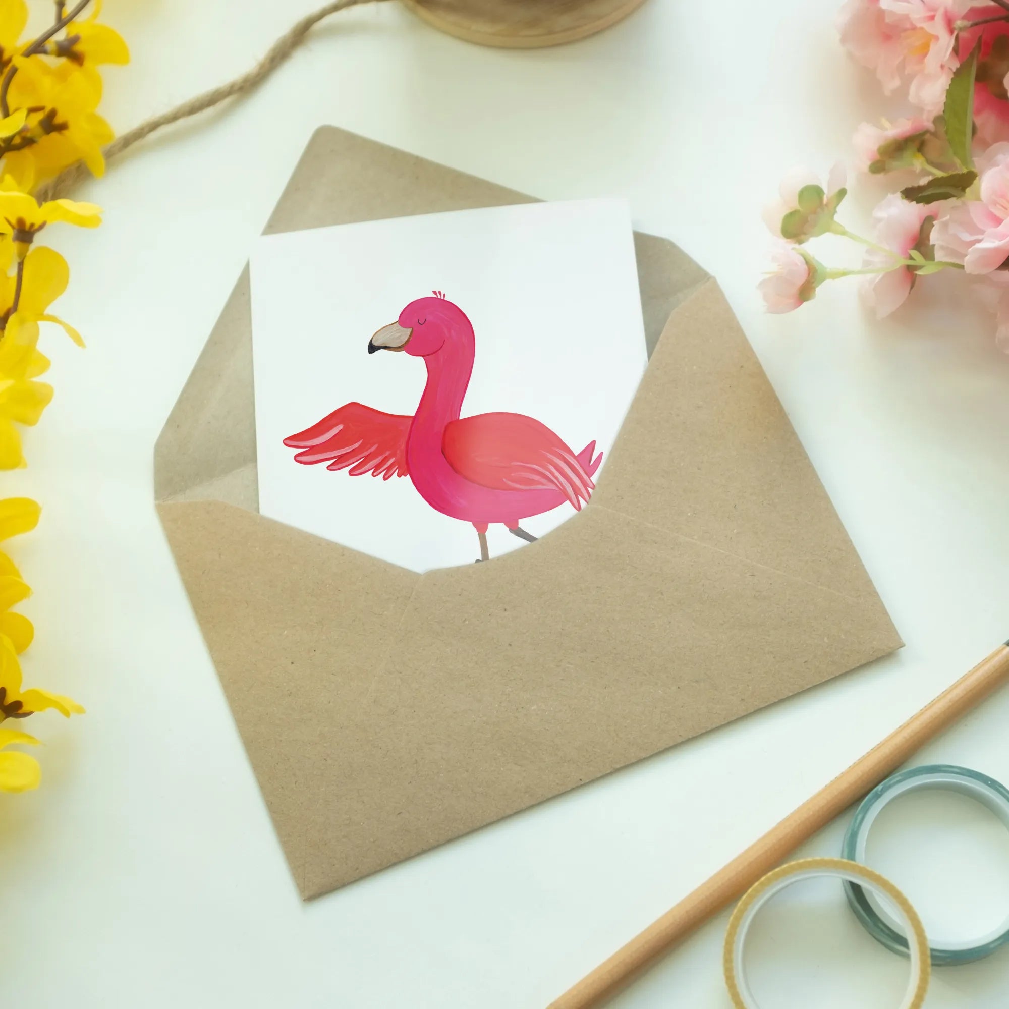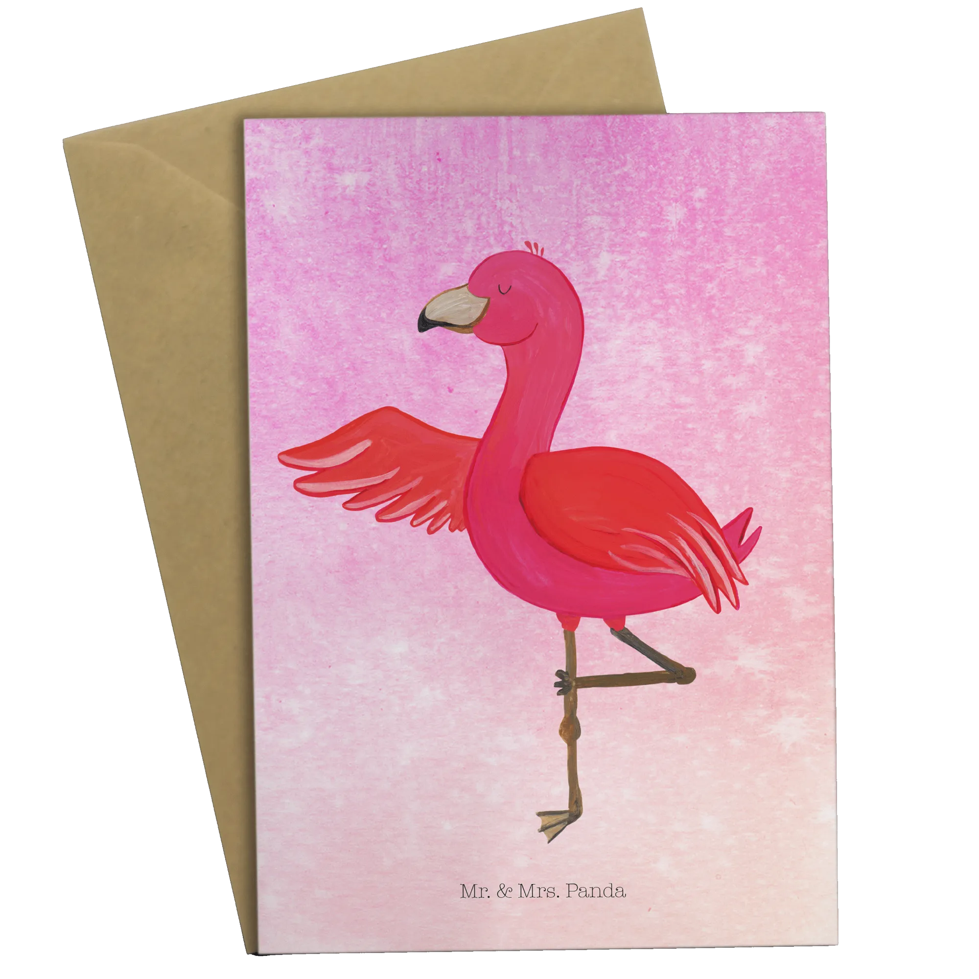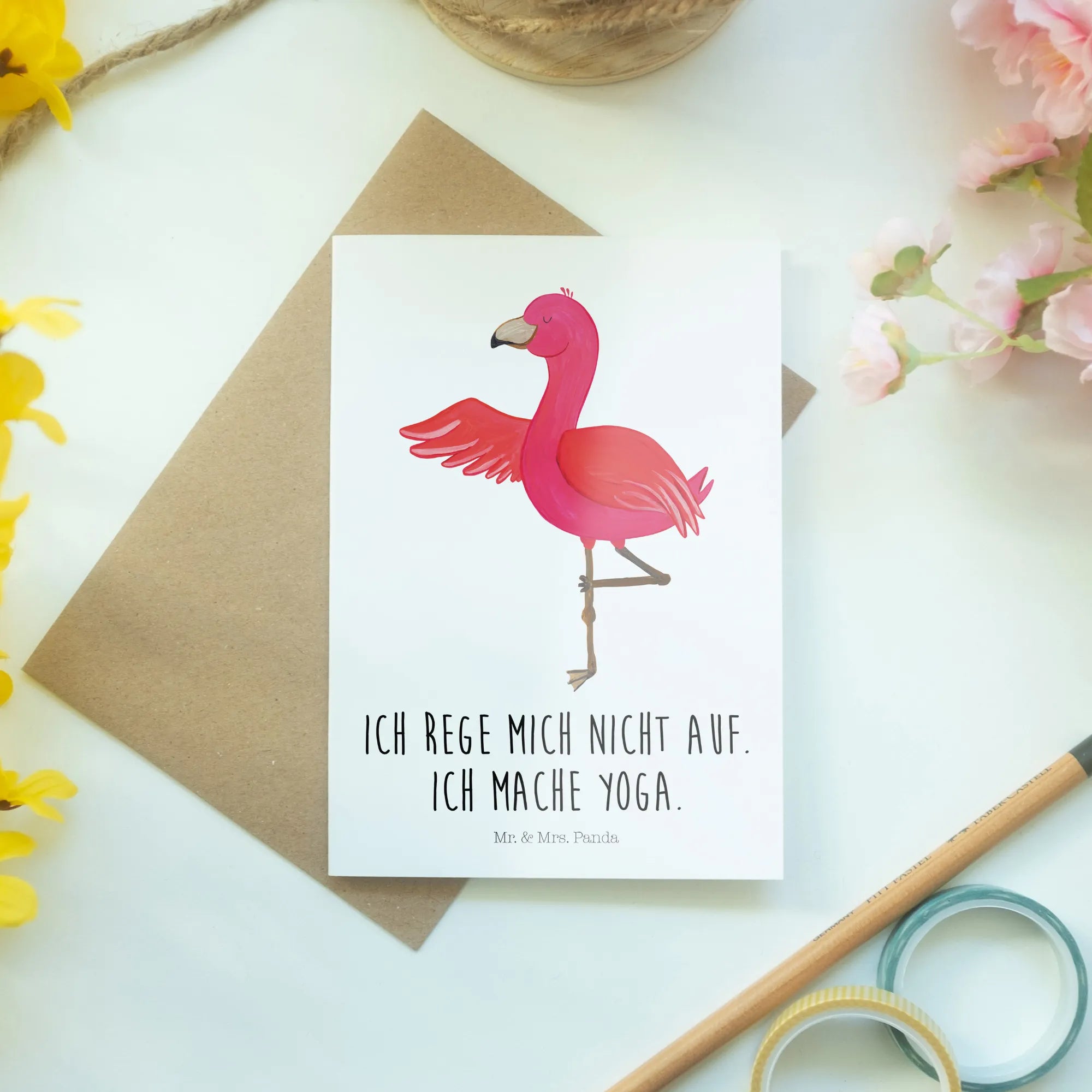 Stell dir vor: Ein pinker Flamingo in Yogapose und der freche Spruch „Ich rege mich nicht auf. Ich mache Yoga.“ – unsere Grußkarte Flamingo Yoga aus der Flamingo - Kollektion von Mr. & Mrs. Panda bringt Sommerlaune und Entspannung in einem.