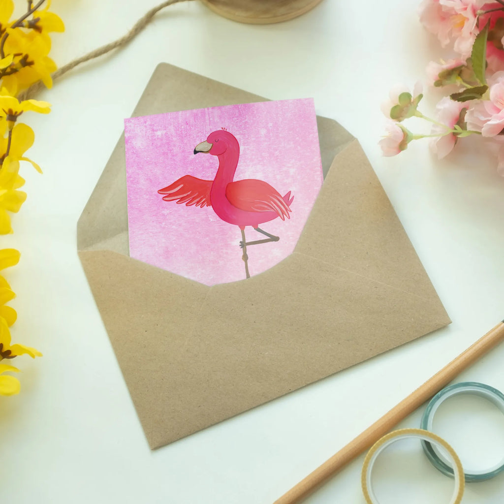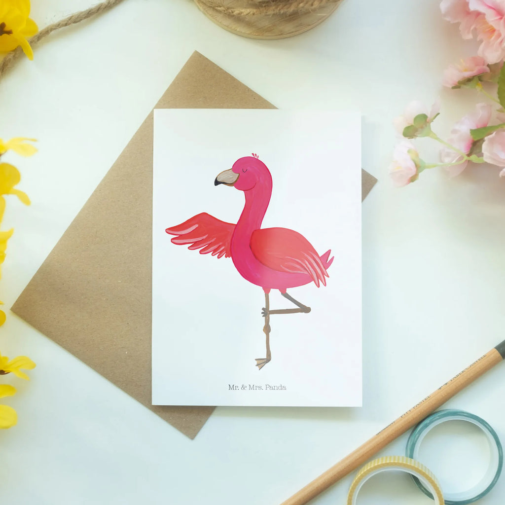 Die Grußkarte Flamingo Yoga aus unserer zauberhaften Flamingo-Kollektion von Mr. & Mrs. Panda ist das ideale Geschenk für alle, die Leidenschaft für Achtsamkeit und Entspannung in ihr Leben bringen möchten. Diese wunderschöne und einzigartige Grußkarte mit einem handgezeichneten, lebhaften pinken Flamingo in einer eleganten Yoga-Pose spricht nicht nur die Yogis unter dir an, sondern auch jeden, der einen Moment der Ruhe und Gelassenheit sucht. Der helle und freundliche Flamingo steht auf einem Bein und vermittelt mit seiner offenen Flügelhaltung einen Eindruck von Freiheit und Entspannung, genau das, was wir in unserem hektischen Alltag brauchen!