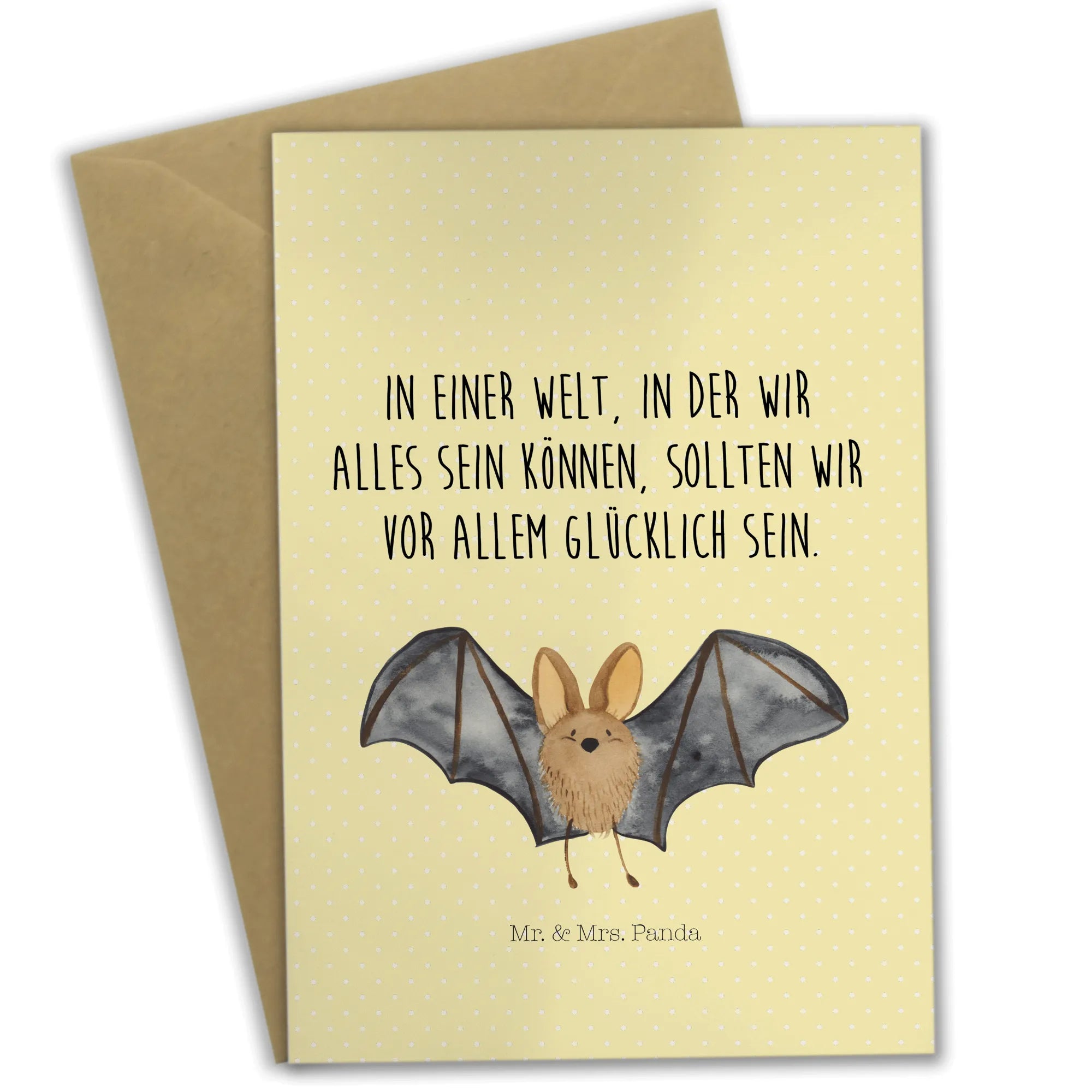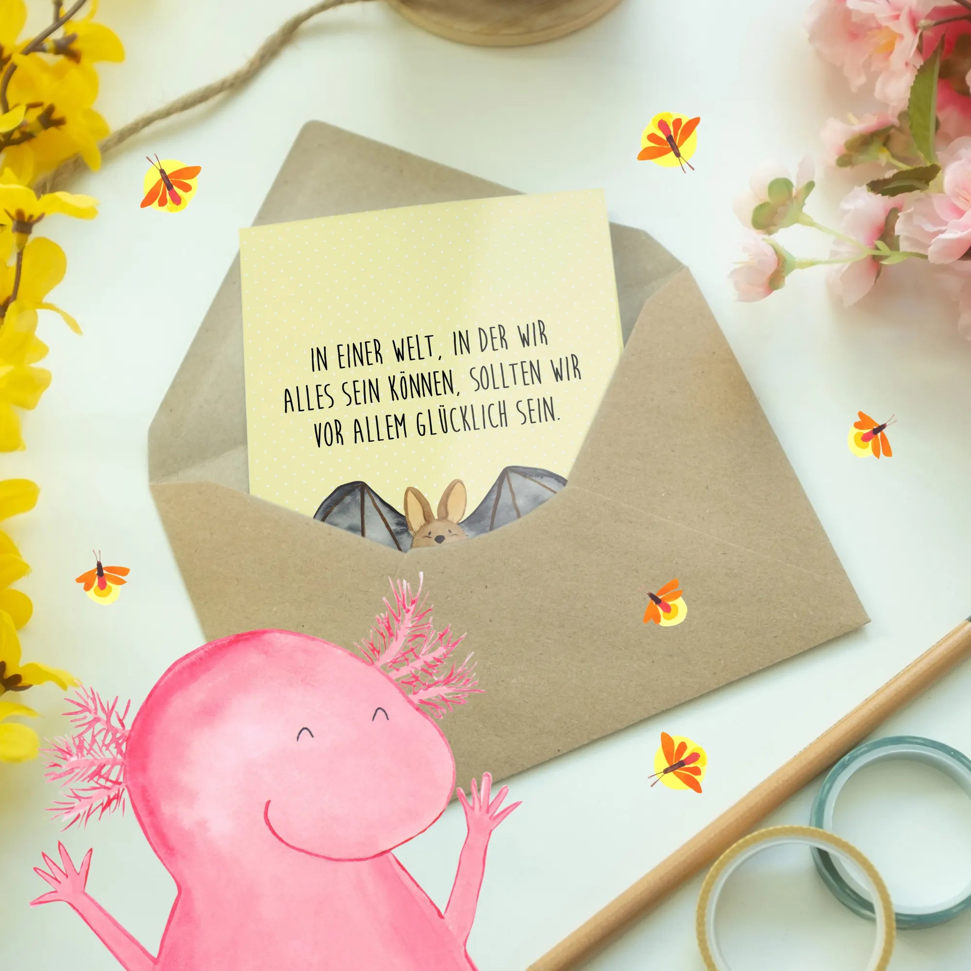Mit einem liebevollen Design, das von Mrs. Panda handgezeichnet wurde, bringt diese Grußkarte einen Hauch von Magie zu jedem Anlass. Die Frontseite ist hochglänzend veredelt und begeistert mit den fliegenden Flügeln der süßen Fledermaus, die für Freiheit und Lebensfreude stehen. Der Spruch auf der Vorderseite, "In einer Welt, in der wir alles sein können, sollten wir vor allem glücklich sein", sorgt dafür, dass der Empfänger beim Lesen gleich in gute Stimmung kommt.