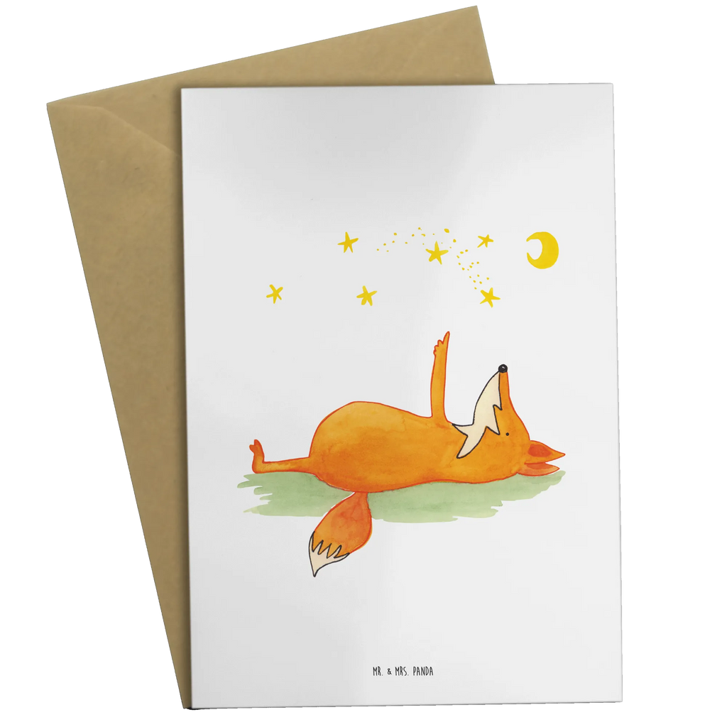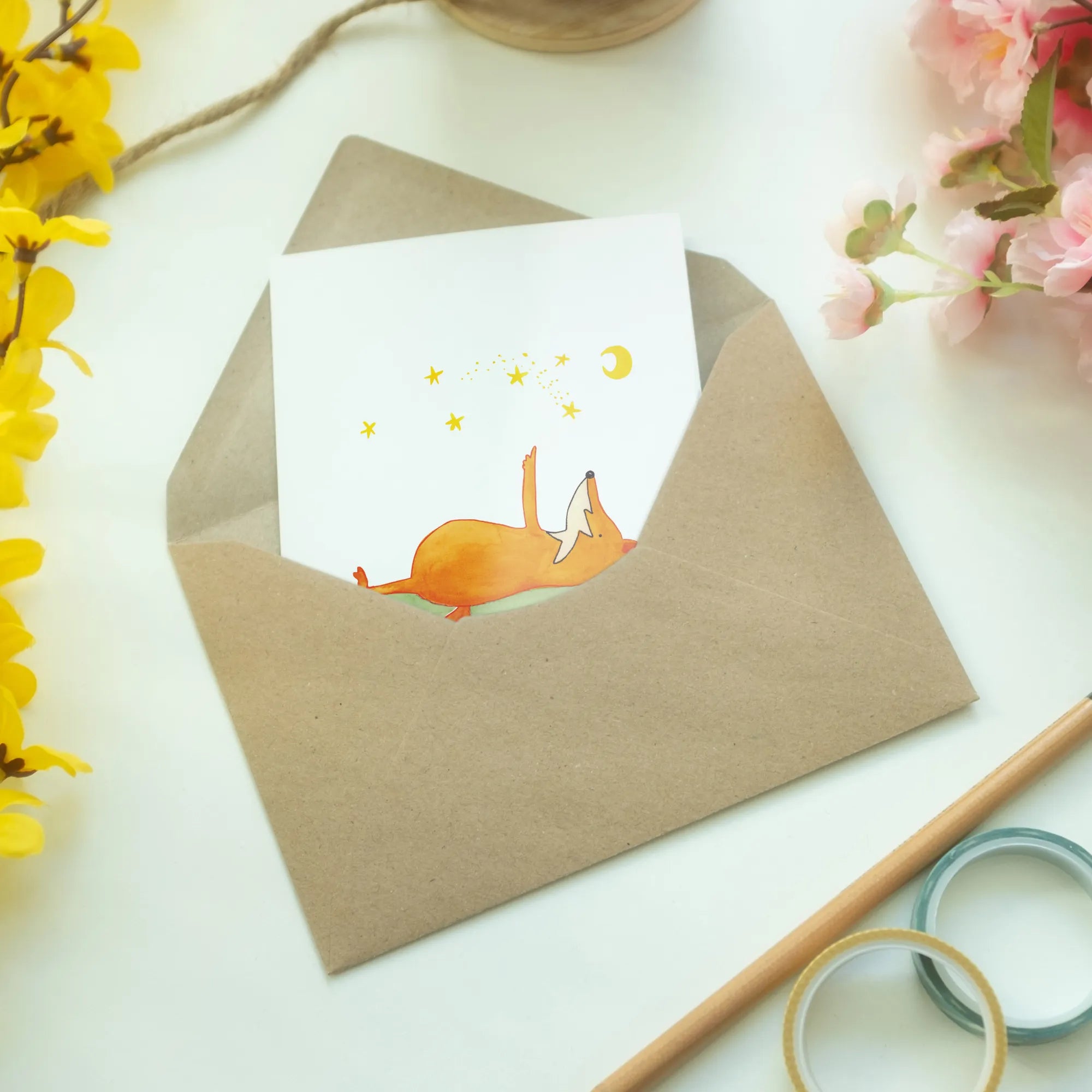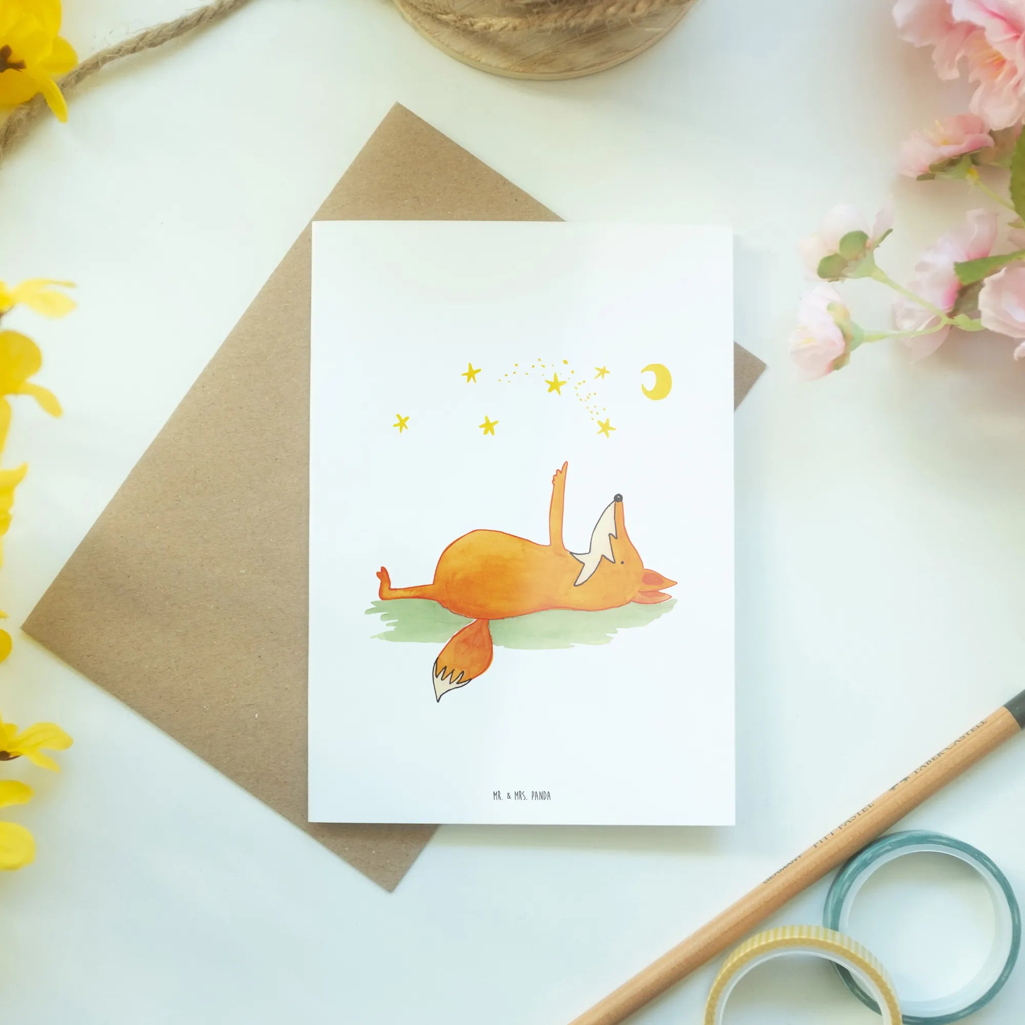 Die Grußkarte "Fuchs Sterne" aus der liebevollen Fuchs Kollektion von Mr. & Mrs. Panda ist das perfekte Geschenk für alle, die schöne, romantische und positive Botschaften lieben. Mit ihrem verspielten Fuchs-Motiv, das liebevoll auf dem Rücken liegend zum Sternenhimmel blickt, bringt sie ein Lächeln auf jedes Gesicht.