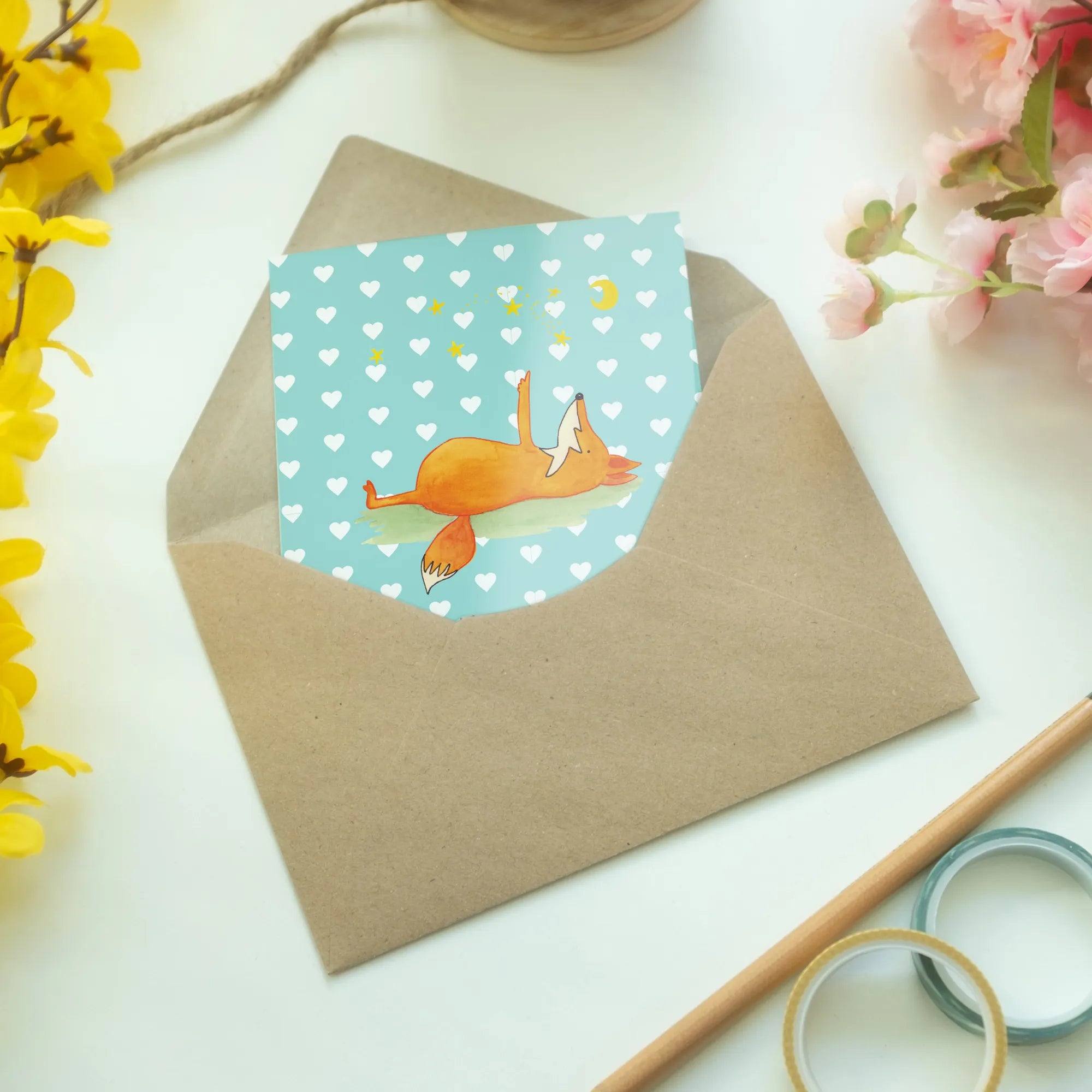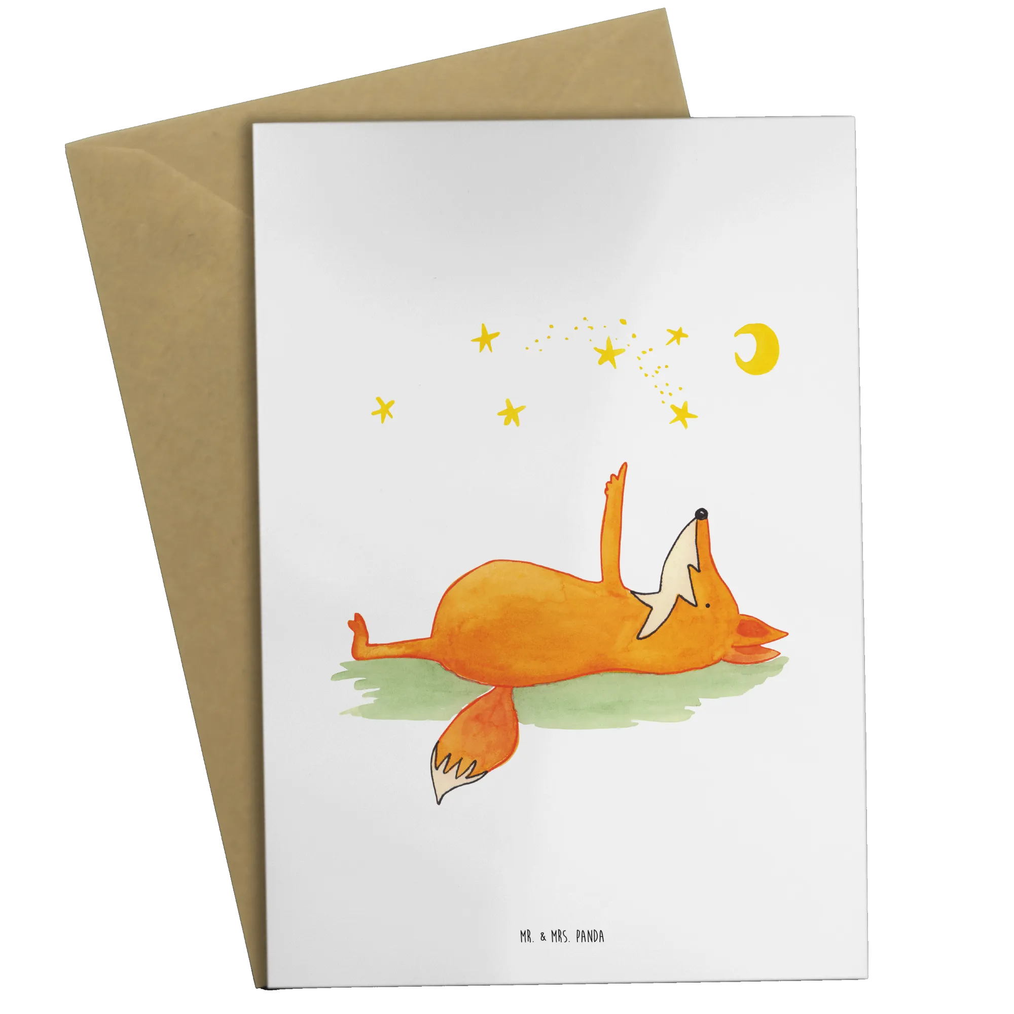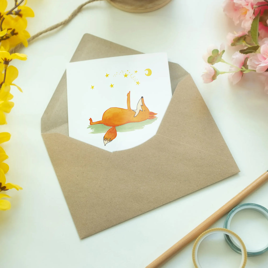Die Grußkarte "Fuchs Sterne" aus der liebevollen Fuchs Kollektion von Mr. & Mrs. Panda ist das perfekte Geschenk für alle, die schöne, romantische und positive Botschaften lieben. Mit ihrem verspielten Fuchs-Motiv, das liebevoll auf dem Rücken liegend zum Sternenhimmel blickt, bringt sie ein Lächeln auf jedes Gesicht.