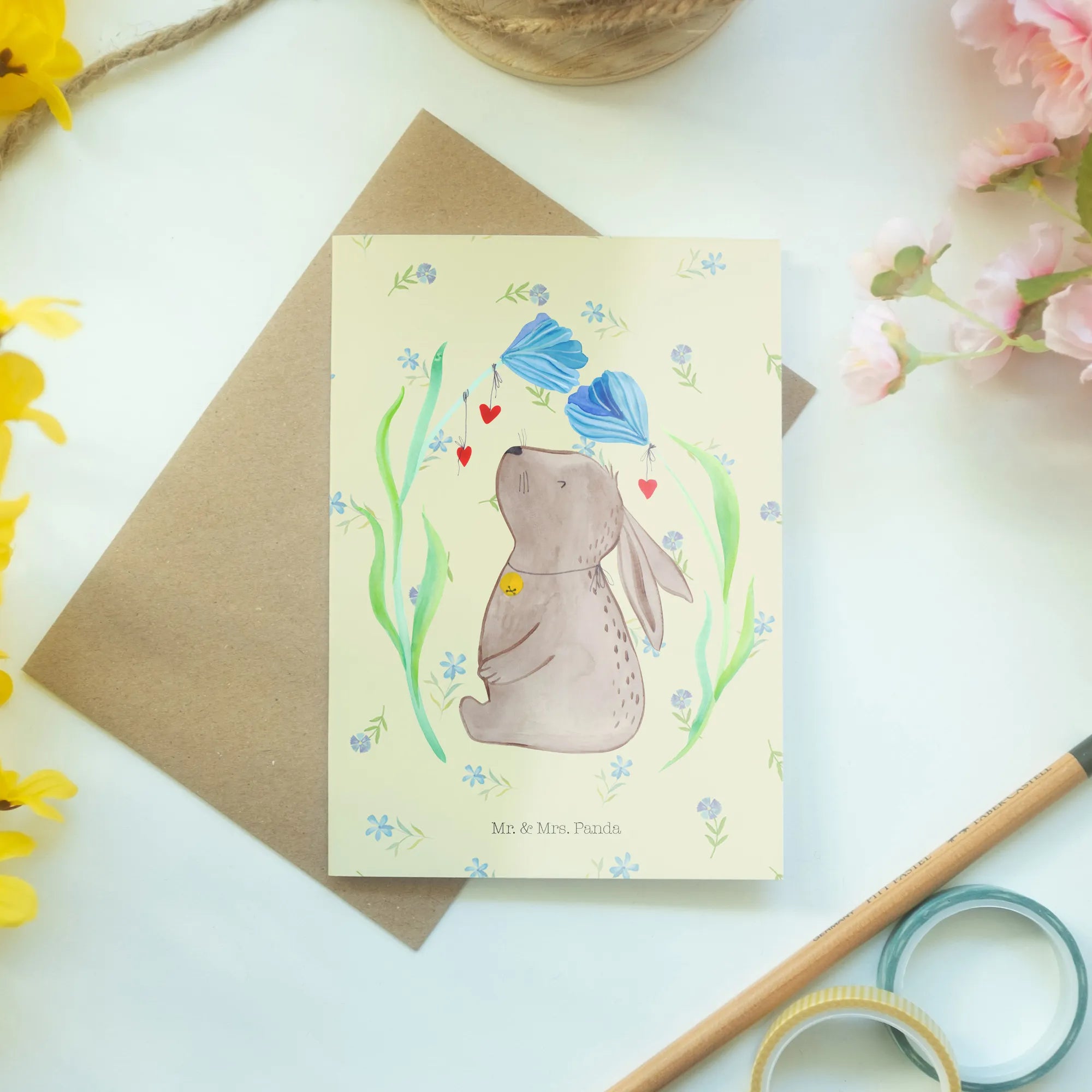 Die Ostern-Kollektion von Mr. & Mrs. Panda umfasst nicht nur Karten, sondern auch Deko-Elemente und Geschenke, die alle mit den gleichen fröhlichen Motiven und liebevollen Sprüchen gestaltet sind. Wenn Du auf der Suche nach einem ganz besonderen Ostergeschenk bist oder einfach nur Deinen Lieben eine Freude machen möchtest, dann ist unsere Grußkarte "Hase Blume" die perfekte Wahl! Verschenke Freude, Hoffnung und Träume und hole dir ein Stück dieser zauberhaften Osterstimmung nach Hause. Perfekt für Ostern, Geburtstagsfeiern, Taufen oder als kleine Aufmerksamkeit für zwischendurch – die Möglichkeiten sind grenzenlos! Lass den Frühling in Dein Herz und in Dein Umfeld mit dieser liebevollen Karte von Mr. & Mrs. Panda!