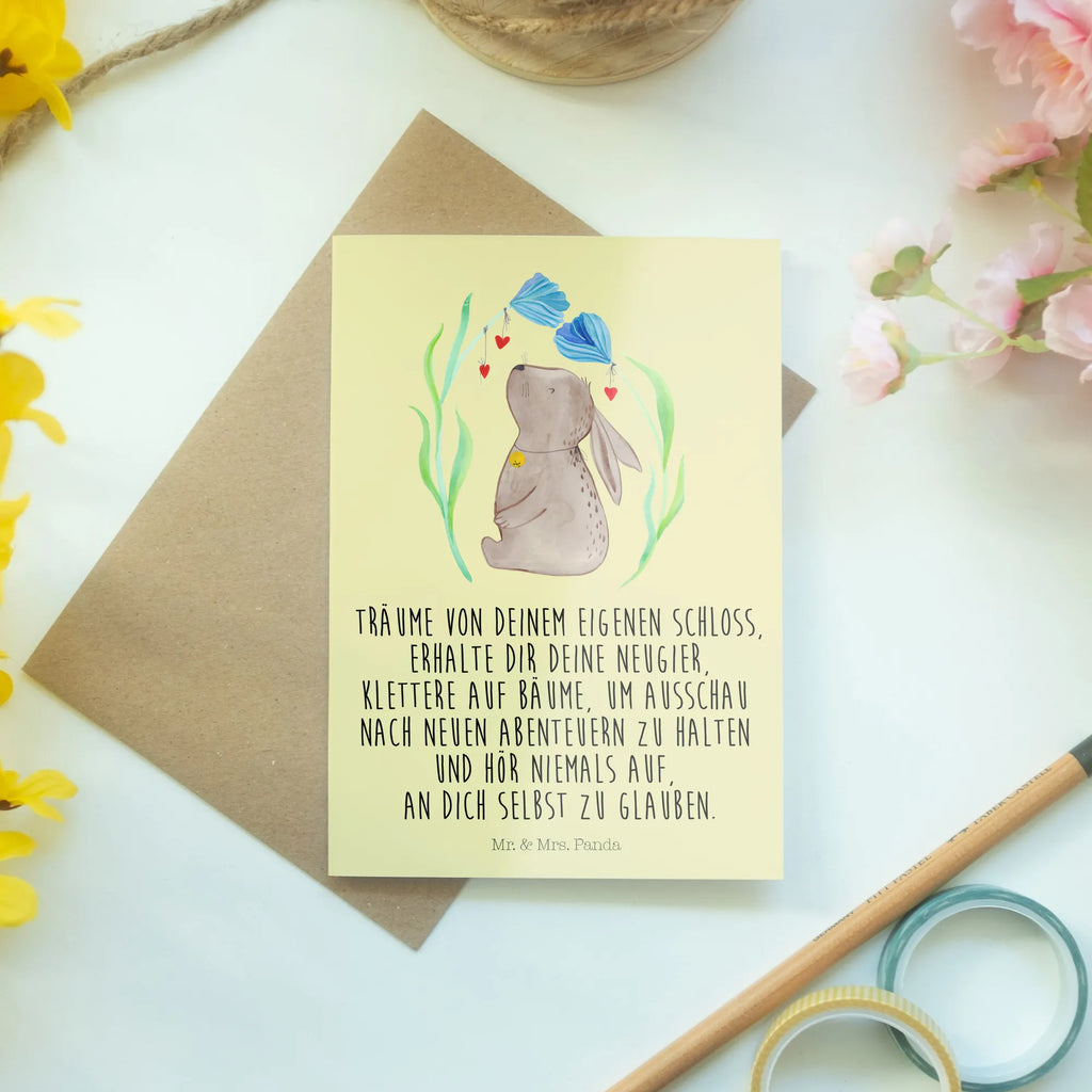 Die Grußkarte "Hase Blume" aus der charmanten Ostern-Kollektion von Mr. & Mrs. Panda ist das perfekte Geschenk für die kleinen und großen Abenteuer im Leben! Egal, ob du jemanden zur Taufe, zur Geburt eines Kindes oder zu einem Kindergeburtstag gratulieren möchtest – diese Karte bringt mit ihrem zauberhaften Motiv und dem inspirierenden Spruch fröhliche Stimmung.