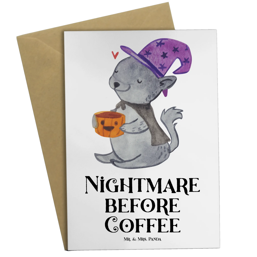 Die Vorderseite dieser fantastischen Karte zeigt einen frechen Katzenliebhaber, der stolz sein Hexenkostüm trägt und eine Kürbistasse voller dampfendem Kaffee hält. Der Slogan "Nightmare before Coffee" verleiht dieser Karte zudem einen humorvollen Touch, der jeden Kaffeeliebhaber zum Schmunzeln bringt. Ob für Einladungen zu Halloween-Partys, als Geburtstagskarte für einen Freund oder einfach als kleine Aufmerksamkeit – diese Grußkarte mit ihrem verspielten Design ist ein ganz besonderes Geschenk.