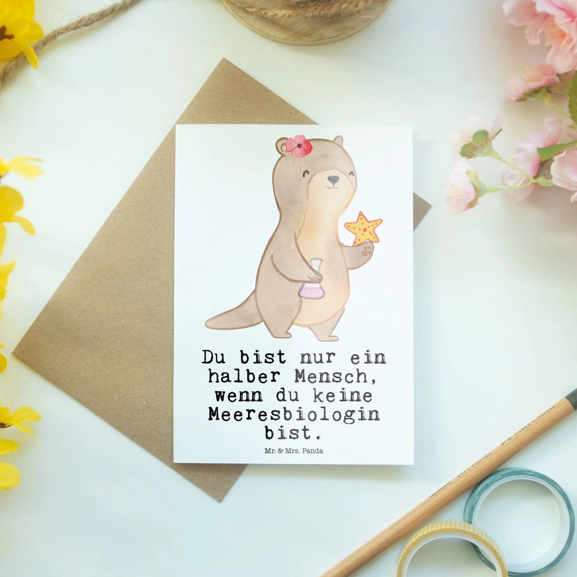 Mit dem süßen Motiv eines weiblichen Otters, der einen Seestern und ein Reagenzglas hält, zieht die Karte alle Blicke auf sich. Die Karte hat die Maße 148 mm x 105 mm und wurde aus hochwertigem, edelem 300-Gramm-Papier gefertigt. Die Vorderseite ist hochglänzend veredelt, während die matte Innenseite ideal zum Beschriften geeignet ist. So kannst du persönliche Grüße und Glückwünsche an deine liebsten Menschen senden.