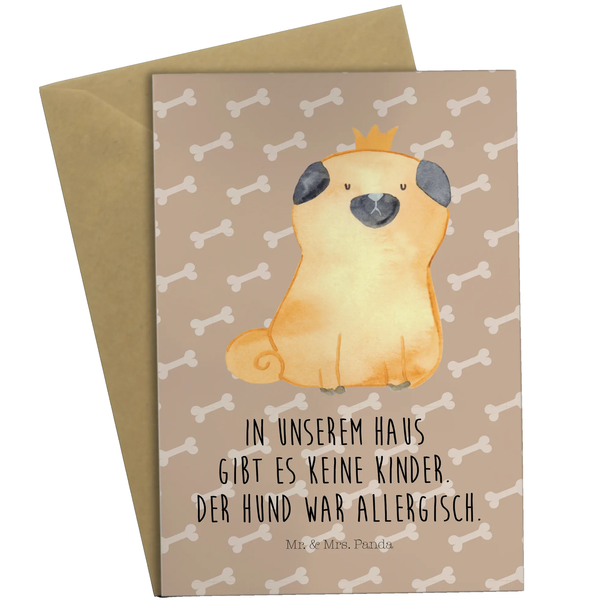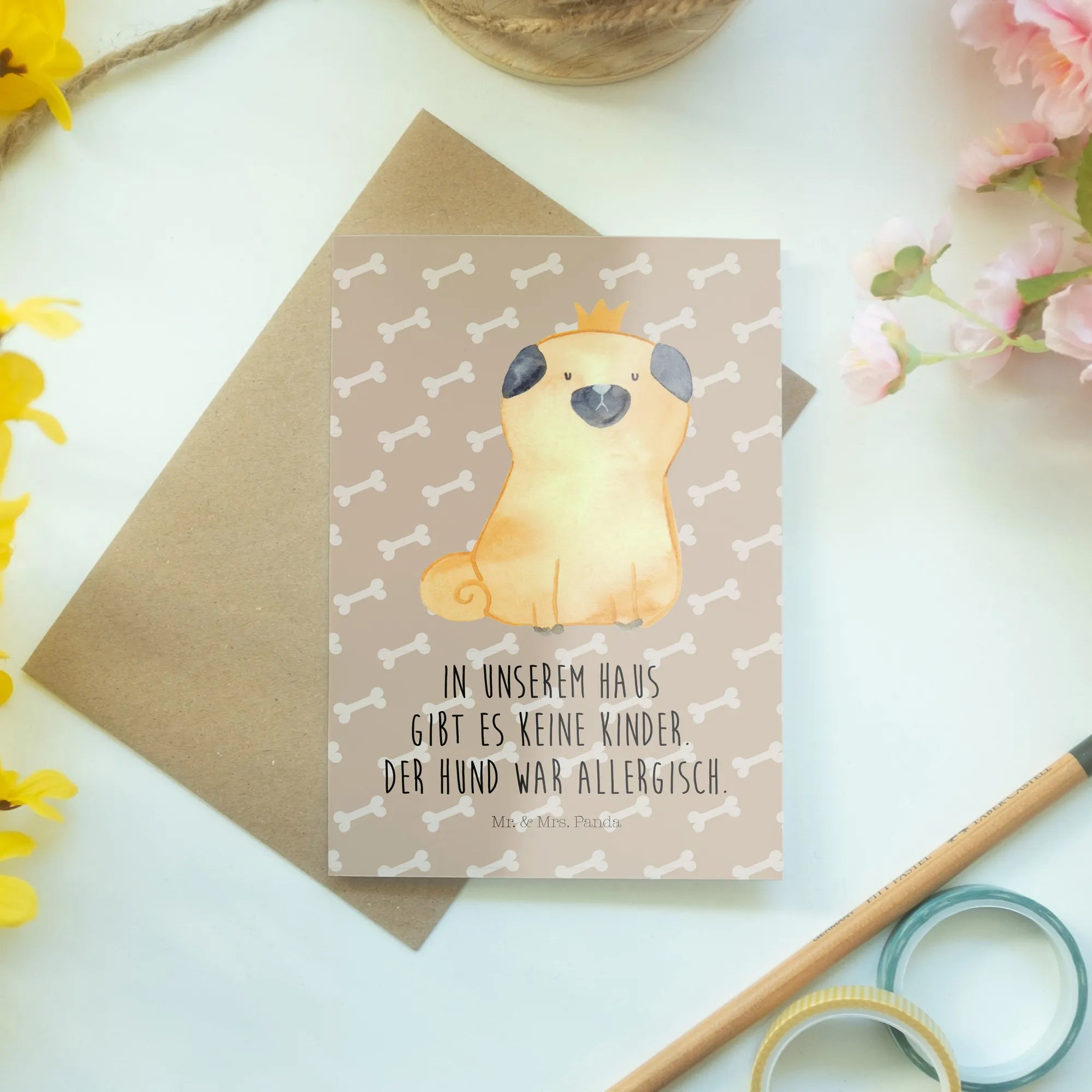 Die wunderschöne Grußkarte mit dem lustigen Mops-Motiv von Mr. & Mrs. Panda ist das perfekte Geschenk für jeden Hundeliebhaber! Mit dem Spruch "In unserem Haus gibt es keine Kinder. Der Hund war allergisch." sorgt diese Karte für ein Schmunzeln und bringt Freude in jede Überraschung.