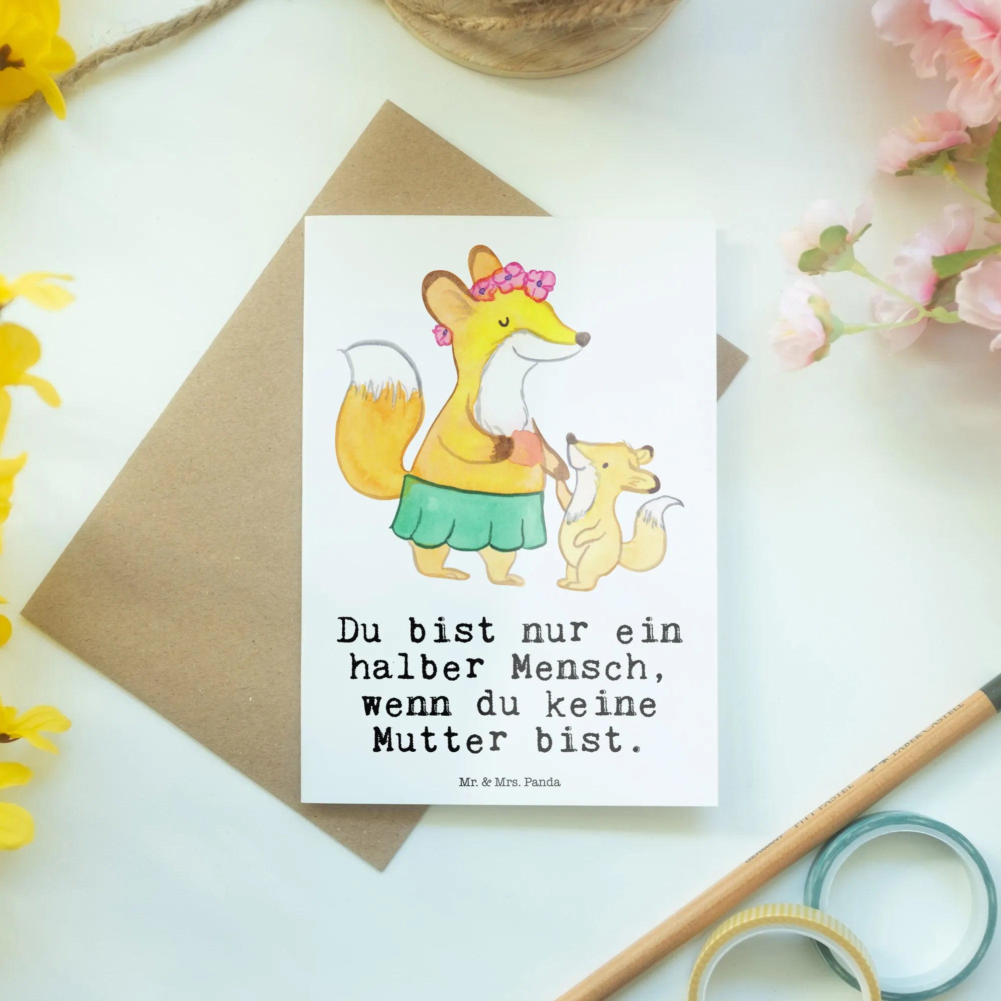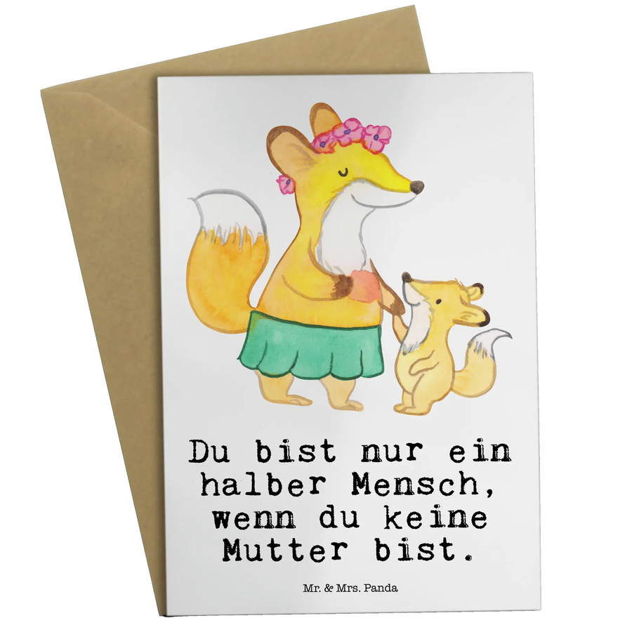 Das süße Motiv zeigt einen fröhlichen Fuchs mit Blumen auf dem Kopf, der ihr Kind an der Hand hält. Die Botschaft 'Du bist nur ein halber Mensch, wenn du keine Mutter bist.' trifft den Nagel auf den Kopf und macht diese Karte zu einem ganz besonderen Geschenk zu Anlässen wie dem Muttertag, Geburtstagsfeiern oder einfach nur als kleine Aufmerksamkeit zwischendurch.