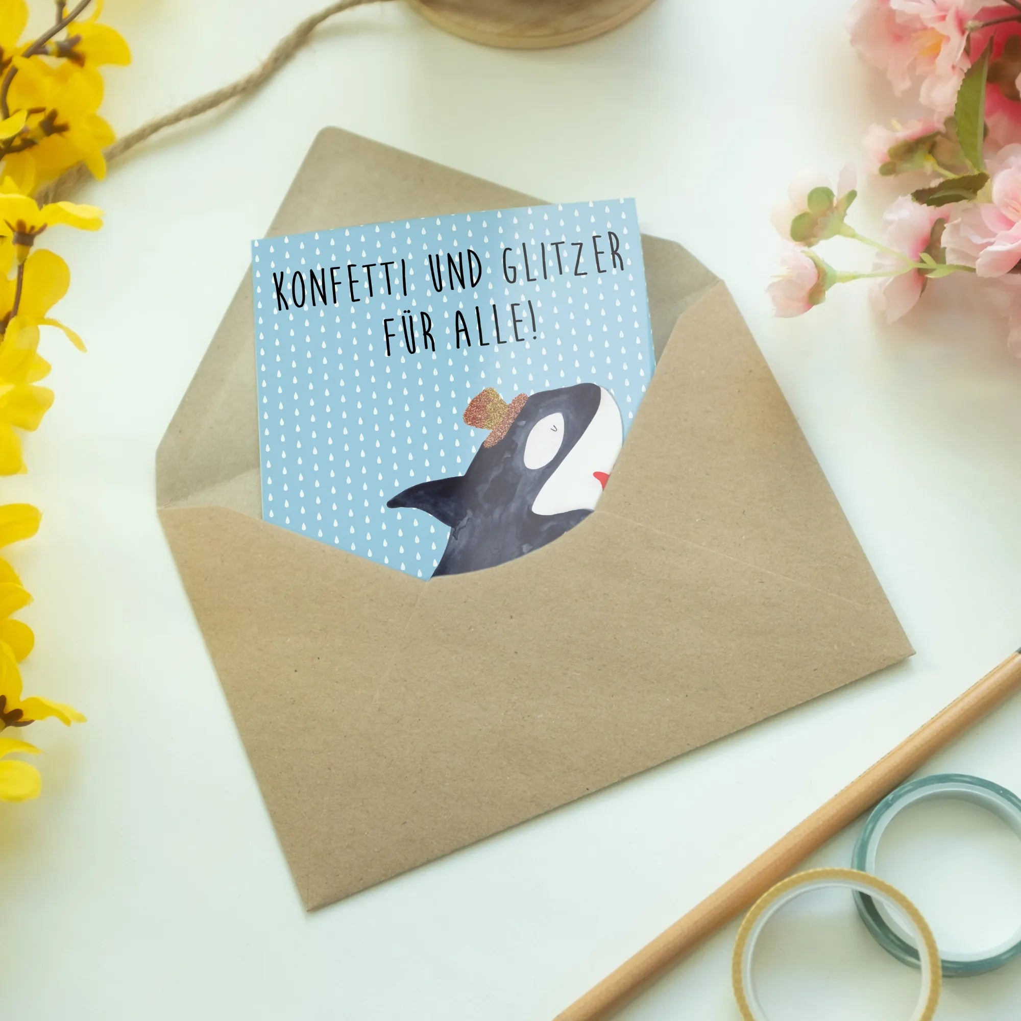 Mit dieser liebevoll gestalteten Grußkarte aus der Meerestiere-Kollektion von Mr. & Mrs. Panda schickst Du Gefühle, die ankommen. Auf Pastellblau präsentiert sich ein freundlich lächelnder Orca im Aquarellstil, mit schickem Zylinder und einer zarten Blumenverzierung. Ein kleiner roter Fisch neben seiner Wange sorgt für einen verspielten Akzent. Der fröhliche Slogan „Konfetti und Glitzer für alle!“ macht die Karte zur perfekten Wahl für Geburtstage, Einladungen, Hochzeiten und Glückwünsche. 🎉