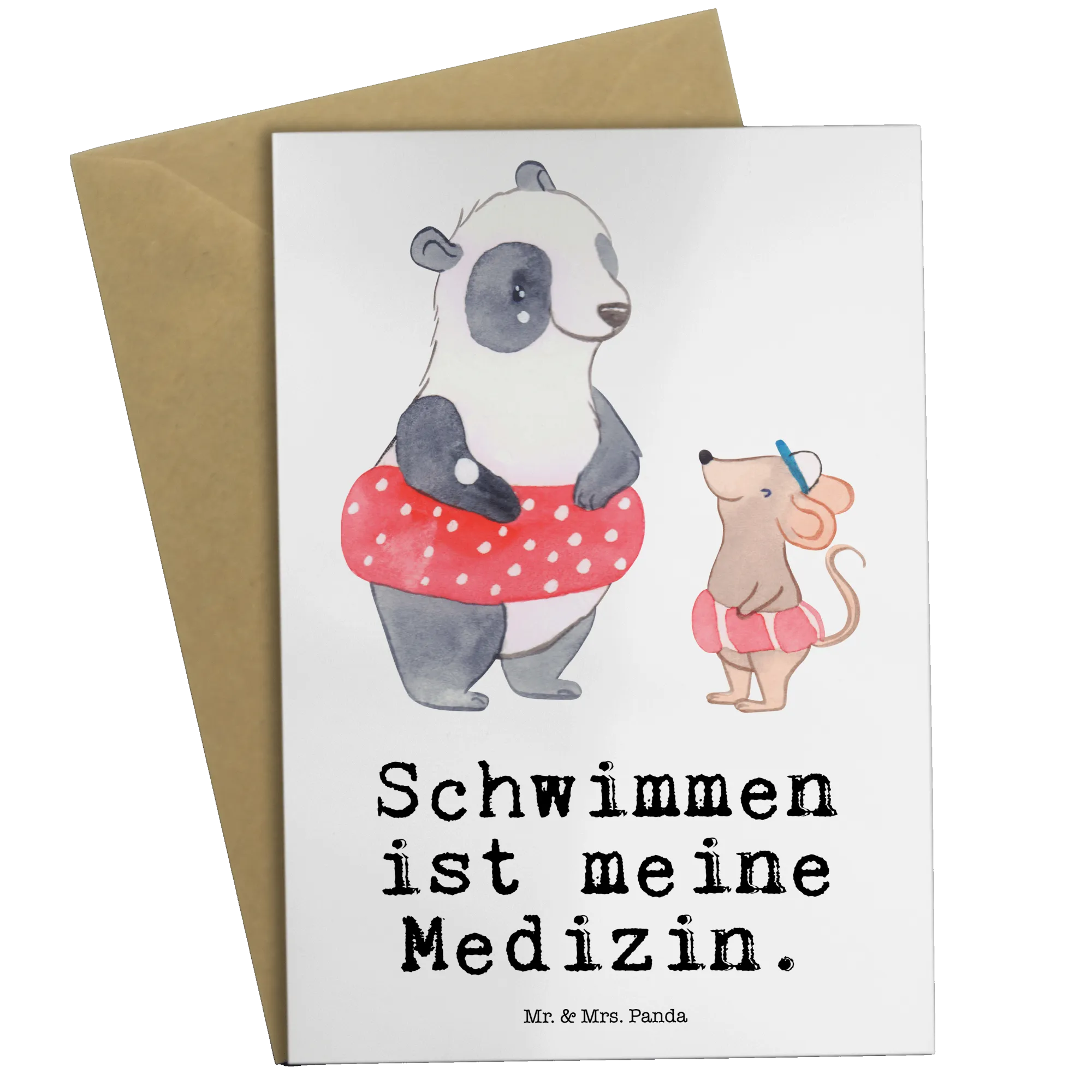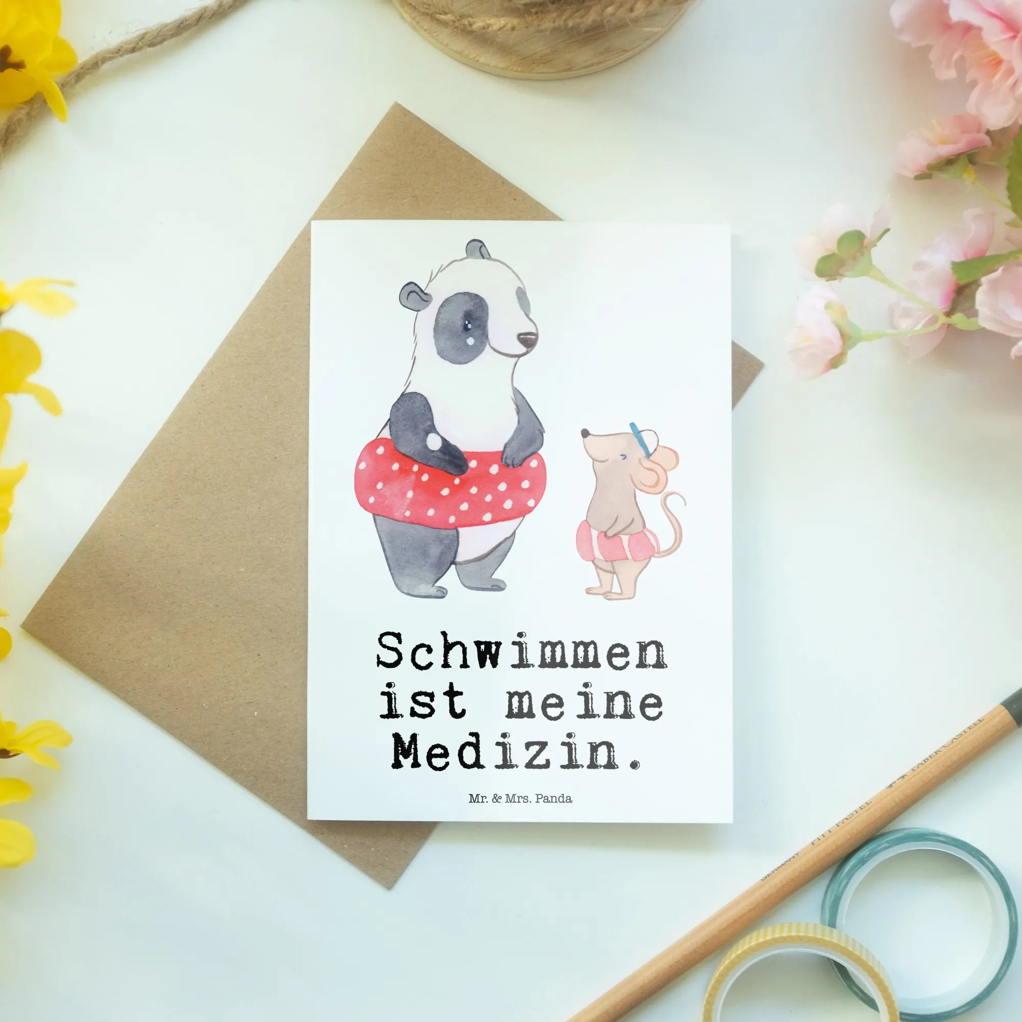 Die wunderschöne Grußkarte "Schwimmen ist meine Medizin" von Mr. & Mrs. Panda ist das perfekte Geschenk für alle Wassersportliebhaber! Diese einzigartige Klappkarte zeigt ein charmantes Motiv eines schwimmenden Otters, der fröhlich mit einem Schwimmring seine Bahnen zieht.