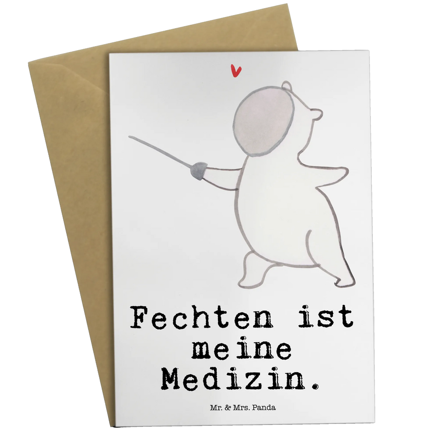 Lass es dir nicht entgehen, diese tolle Karte aus der liebevoll gestalteten Kollektion Hobby & Sport zu verschenken oder für dich selbst zu erwerben. Jeder Fechter, ob Anfänger oder Profi, wird diese Grußkarte lieben! Die Sammlung von Mr. & Mrs. Panda bietet dir eine riesige Auswahl an handgemalten Motiven und Sprüchen, sodass da ganz sicher auch das richtige für deinen hohen Sportgeist dabei ist.