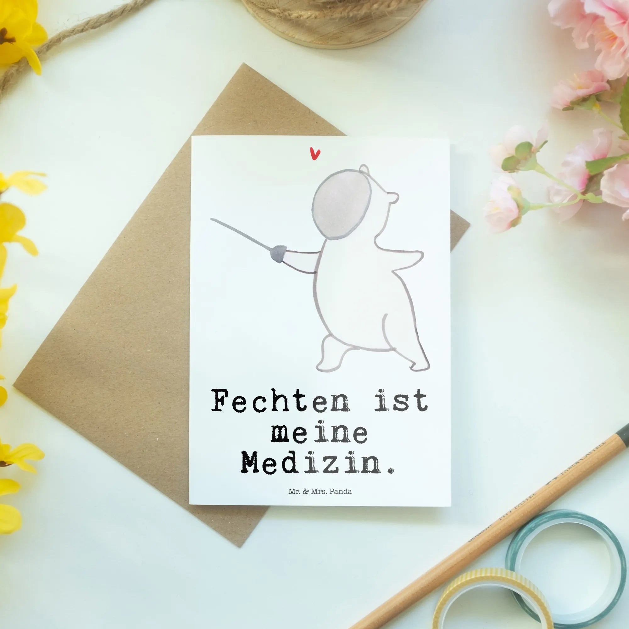 Die Grußkarte "Panda Fechten Medizin" von Mr. & Mrs. Panda ist das perfekte Geschenk für alle Fechtbegeisterten und Sportliebhaber. Egal, ob du eine liebevolle Botschaft zur Gratulation an einen Sportler, ein Dankeschön an deinen Fechtclub oder eine Einladung zu einem feierlichen Event wie einer Hochzeitsfeier benötigst - diese Karte bringt dein Anliegen auf den Punkt.