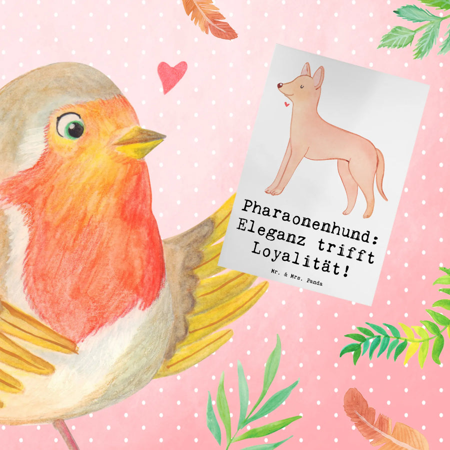 Auf der Vorderseite ziert ein handgezeichnetes Aquarell des Pharaonenhundes die Karte, das klassische Eleganz und Loyalität ausstrahlt. Der Slogan 'Pharaonenhund: Eleganz trifft Loyalität!' ergänzt das Motiv perfekt und bringt die Charakterzüge dieser Hunderasse auf den Punkt.